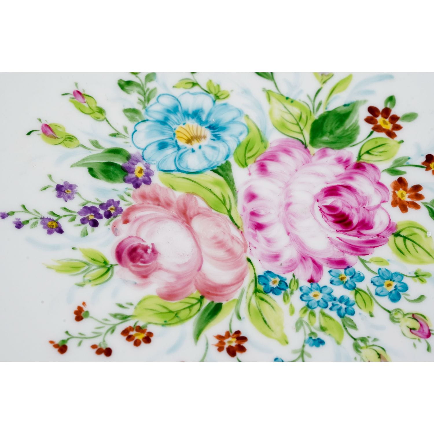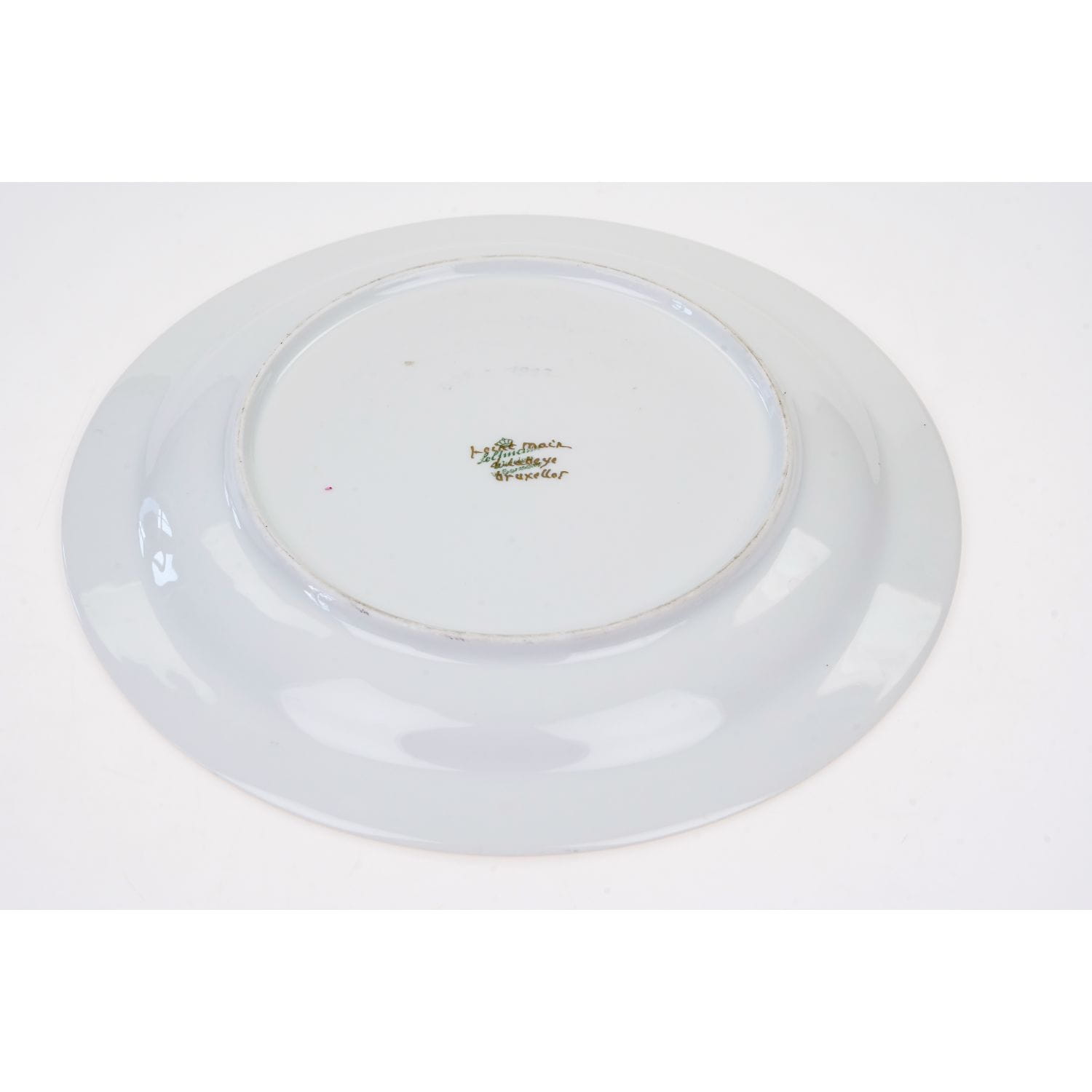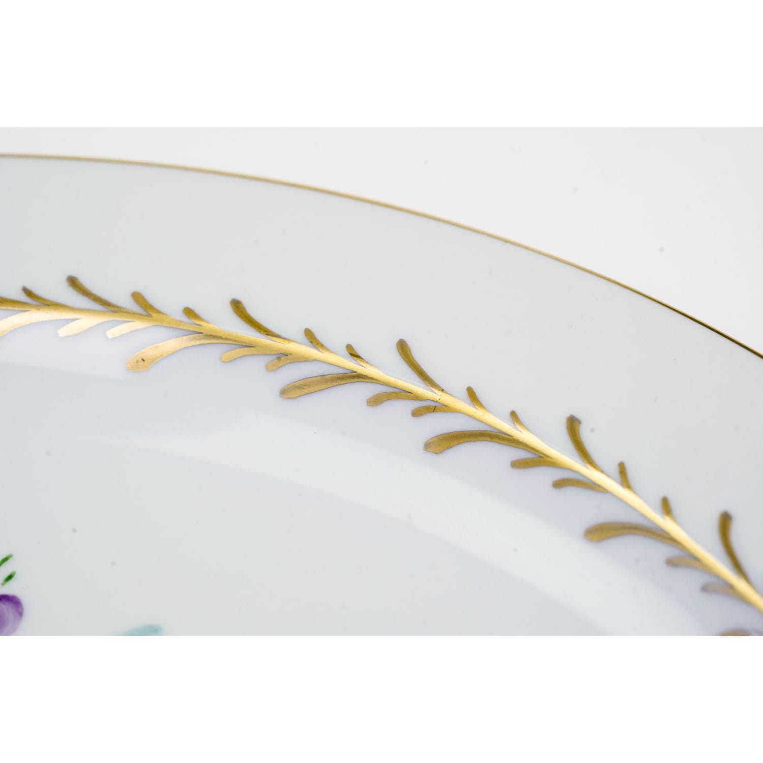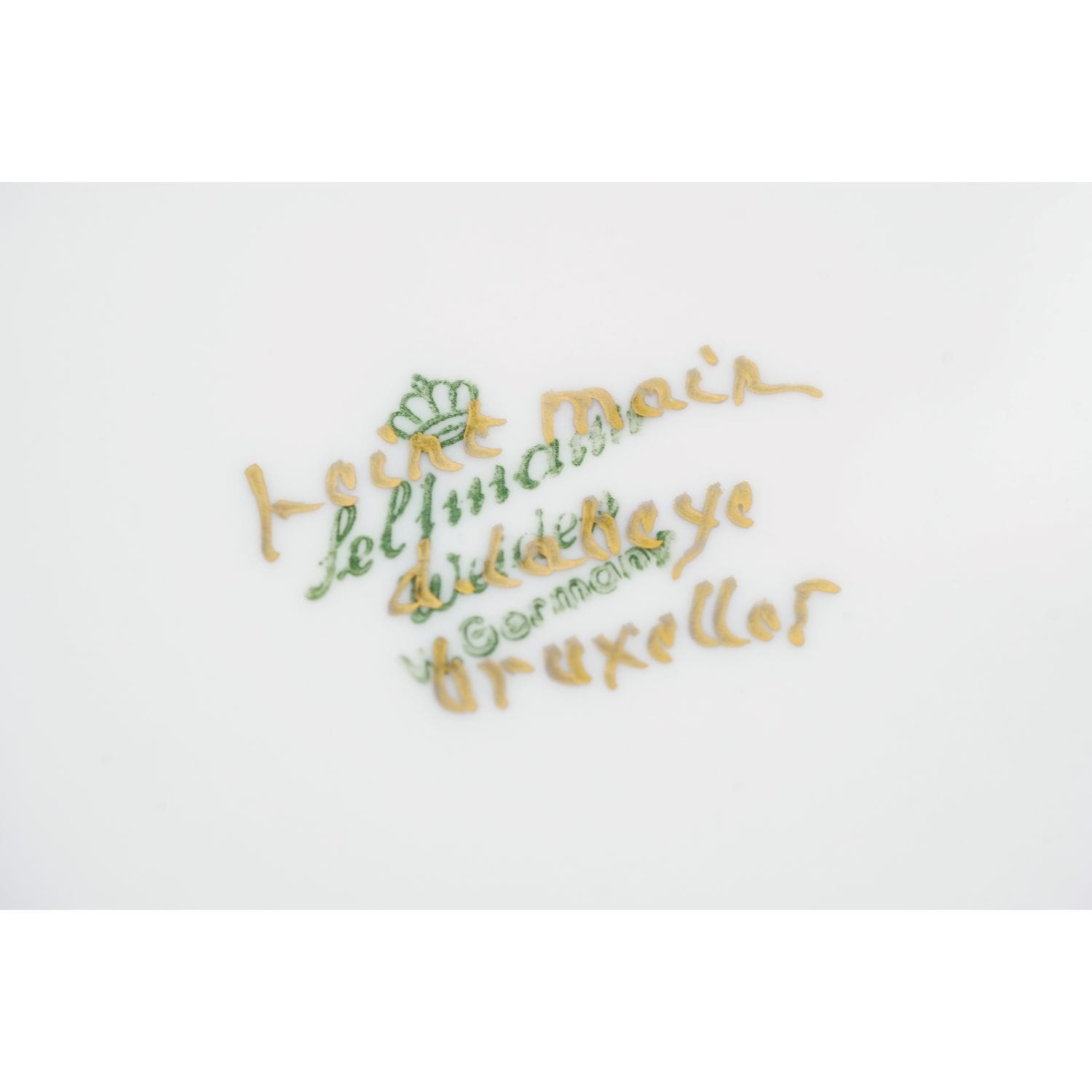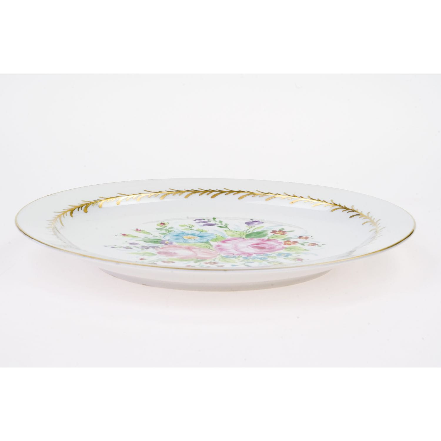 Pochodzi z Bawarii z miejscowości Weiden z Porzellanfabrik Christian Seltmann. Porcelana biała szkliwiona. Prosty, klasyczny, elegancki kształt. Krawędzie w delikatnych złoceniach. Na lustrze duży, ręcznie malowany bukiet kwiatów w złotym, ręcznie nakładanym obramowaniu.