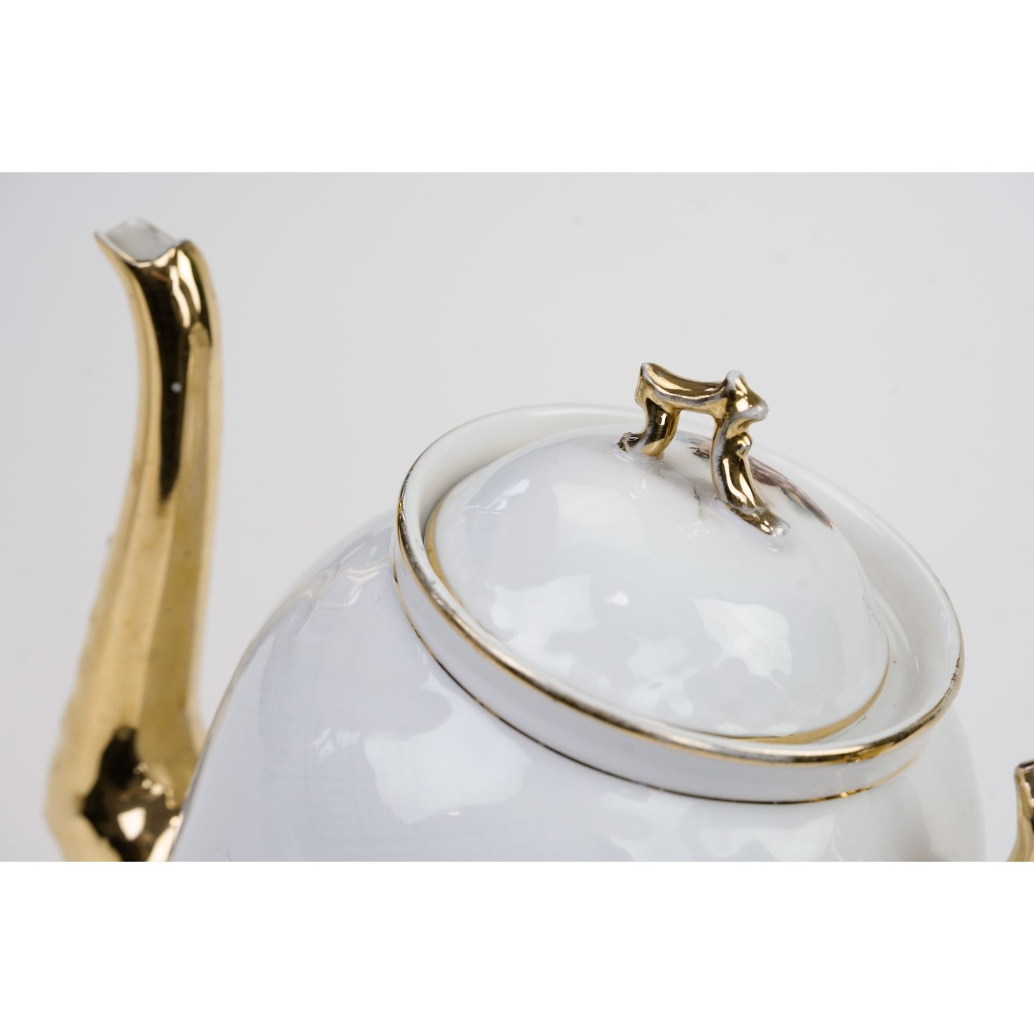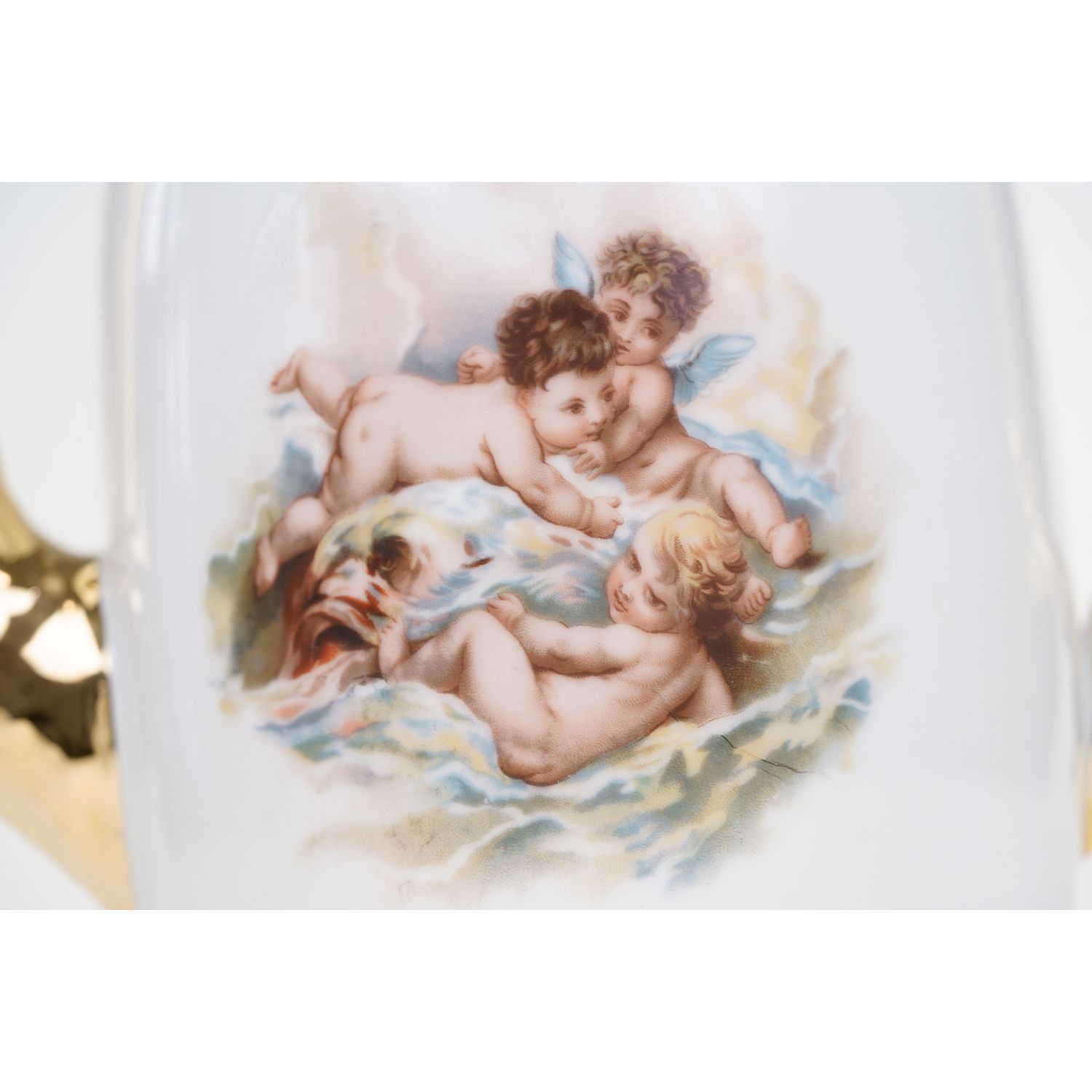 Pochodzi najprawdopodobniej z Porzellanfabrik Johann Seltmann z Vohenstrauß. Sygnowany jedynie odręcznym znakiem dekoratora. Porcelana biała, szkliwiona, pokryta reliefami. Na dzbanku scenka trzy golasy, aniołki, amorki z drugiej strony nieco mniejsza dekoracja. Ucho i sterczynka w pełni złocone. Kontury w złoceniach, ale już poprzecieranych. Wyposażony w siteczko.
