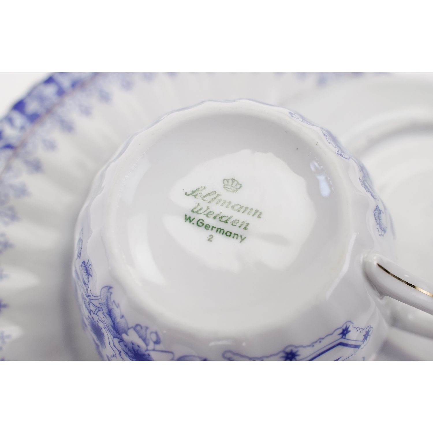 Filiżanka pochodzi z wytwórni Seltammanna z Weiden znakiem stosowanym od 1924 roku. Spodek i talerz deserowy są sygnowane różnymi znakami bawarskich wytwórni. Porcelana biała, kanelowana, żebrowana zdobiona dekoracjami China Blau i złotą konturówką na rantach.