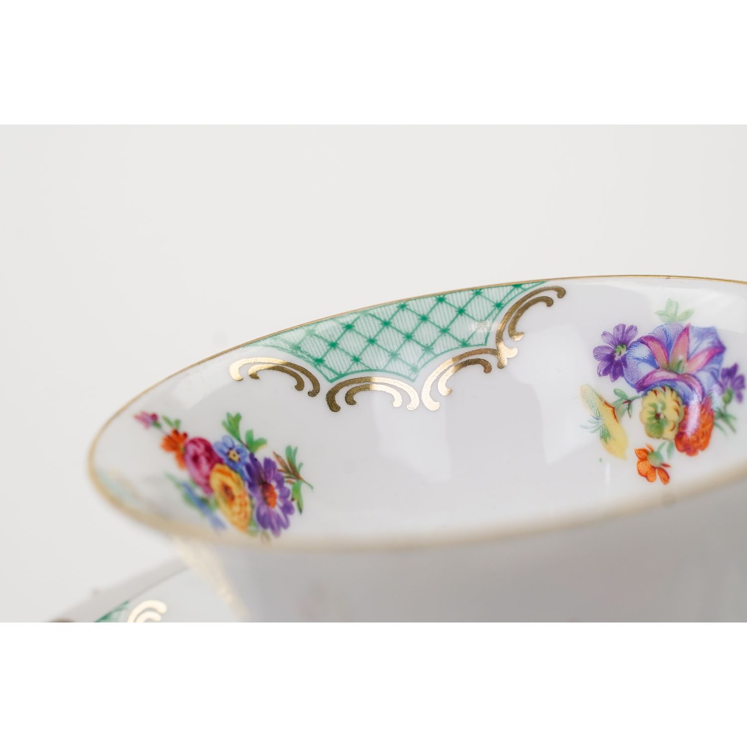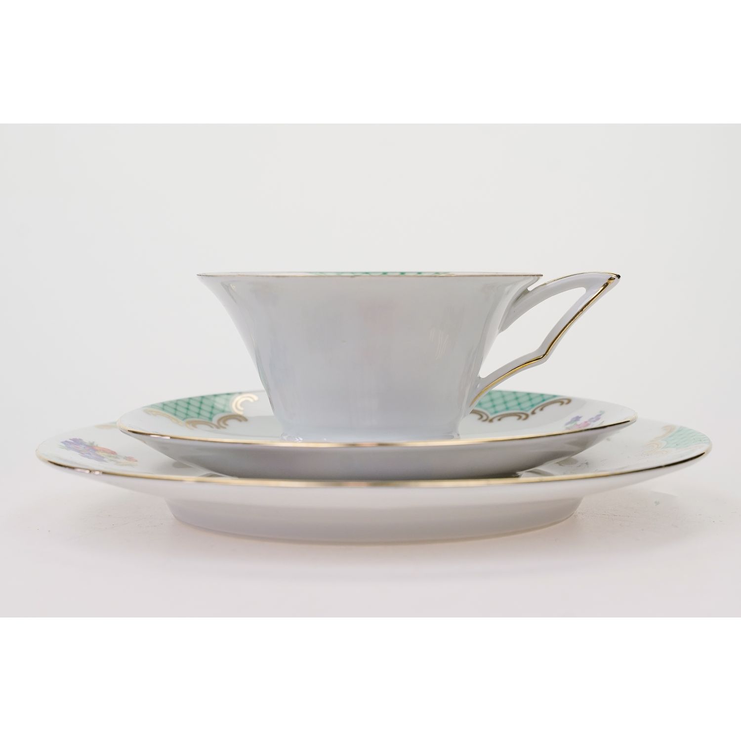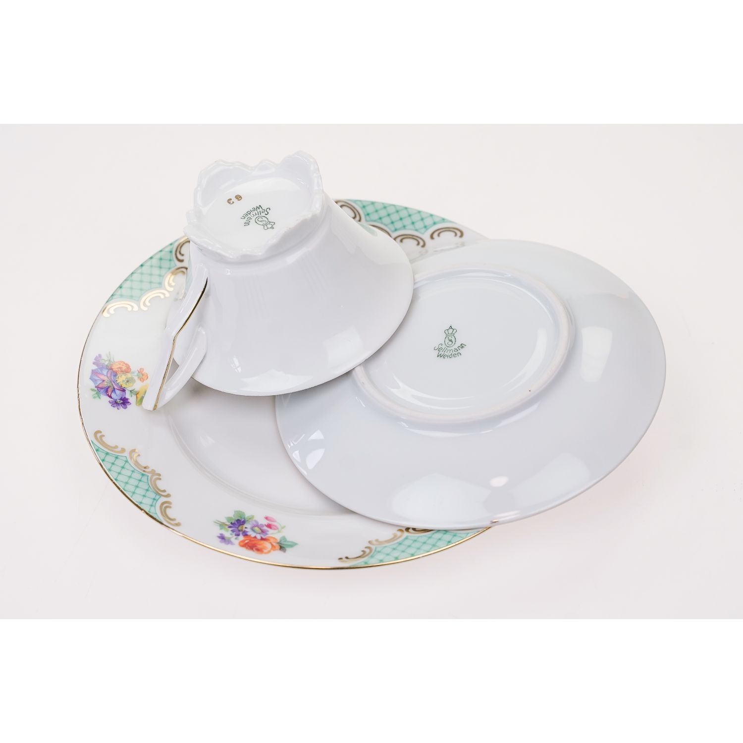 Pochodzi z Bawarii z Weiden (Porzellanfabrik Christian Seltmann). Sygnowany znakiem stosowanym od 1924 roku. Porcelana w kolorze białym. Filiżanka na zgeometryzowanych nóżkach z w grubo złoconym uszkiem. Wszystkie elementy dekorowane zielonymi ornamentami i barwnymi bukiecikami kwiatuszków. Ranty podkreślone złoceniami.