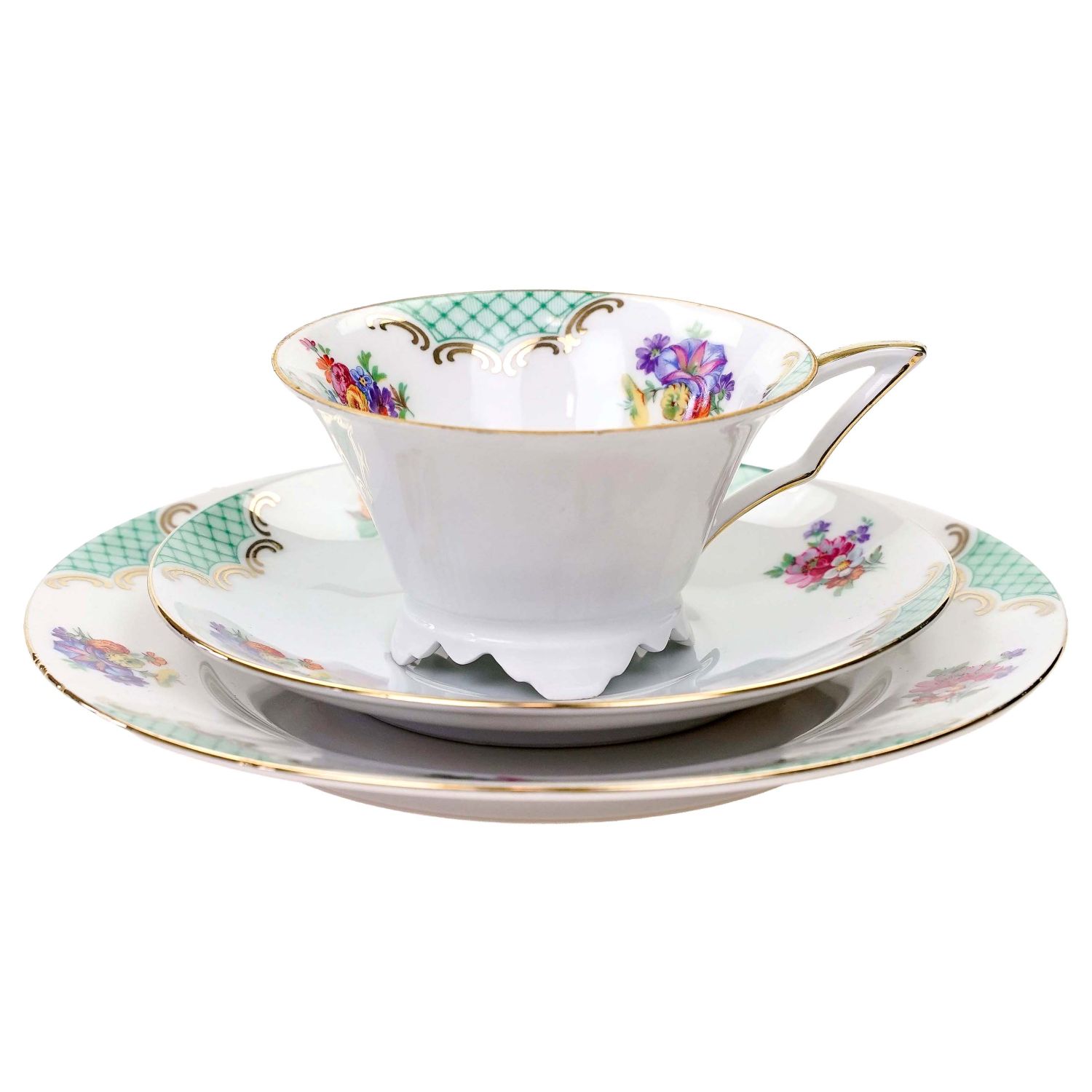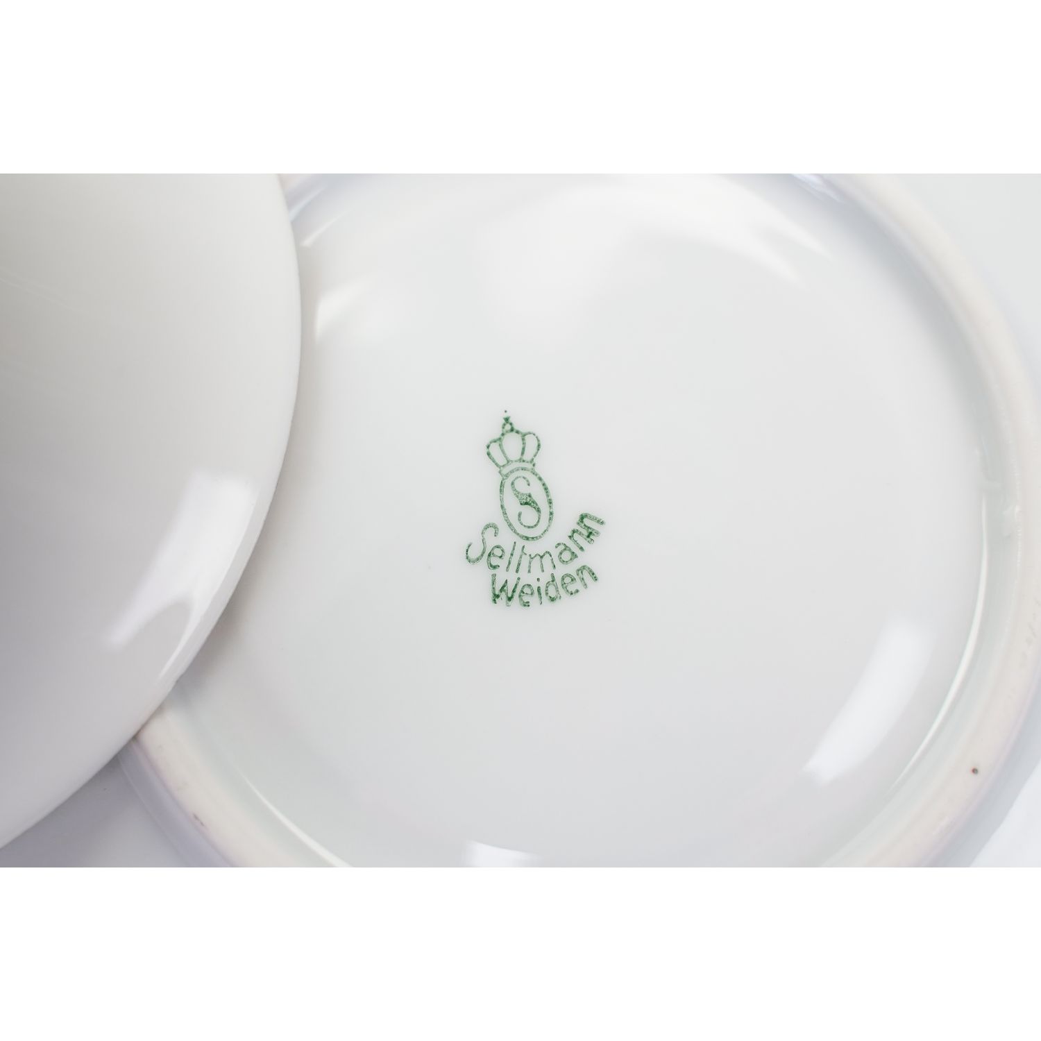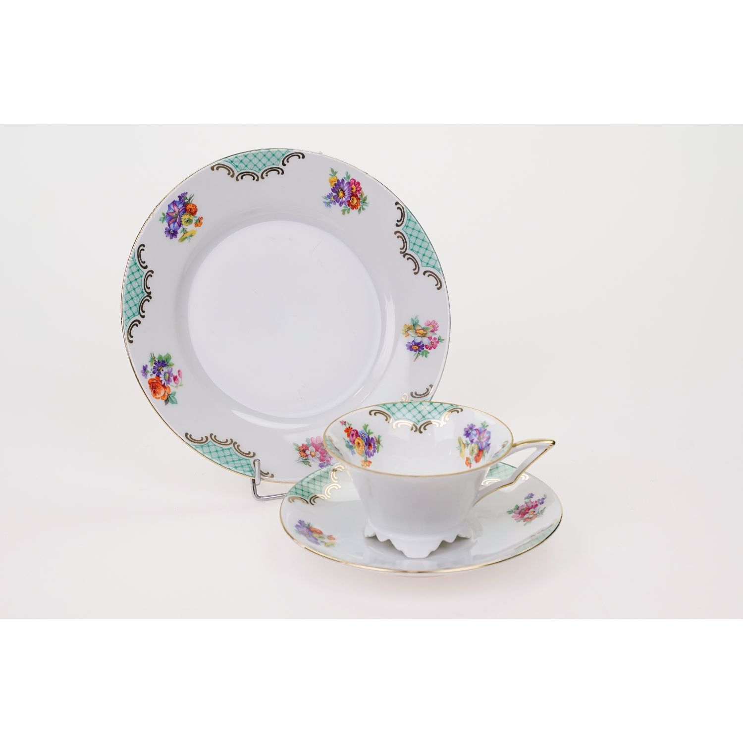 Pochodzi z Bawarii z Weiden (Porzellanfabrik Christian Seltmann). Sygnowany znakiem stosowanym od 1924 roku. Porcelana w kolorze białym. Filiżanka na zgeometryzowanych nóżkach z w grubo złoconym uszkiem. Wszystkie elementy dekorowane zielonymi ornamentami i barwnymi bukiecikami kwiatuszków. Ranty podkreślone złoceniami.
