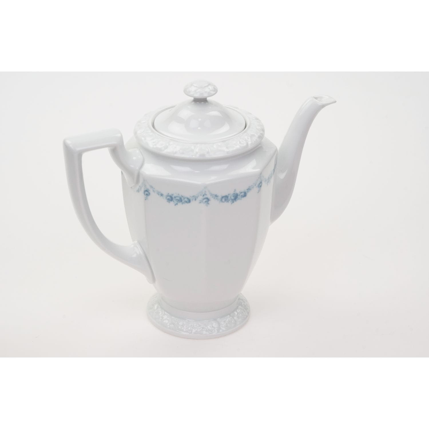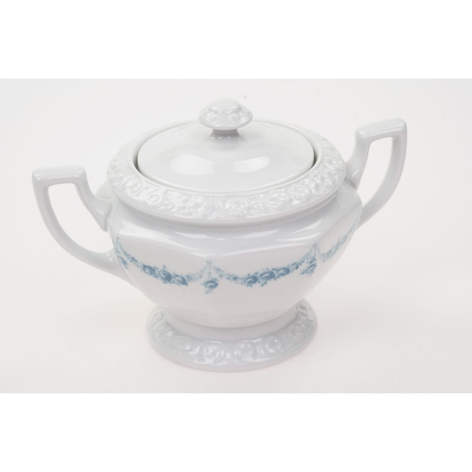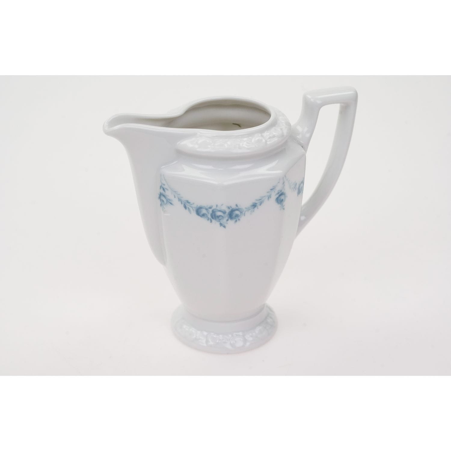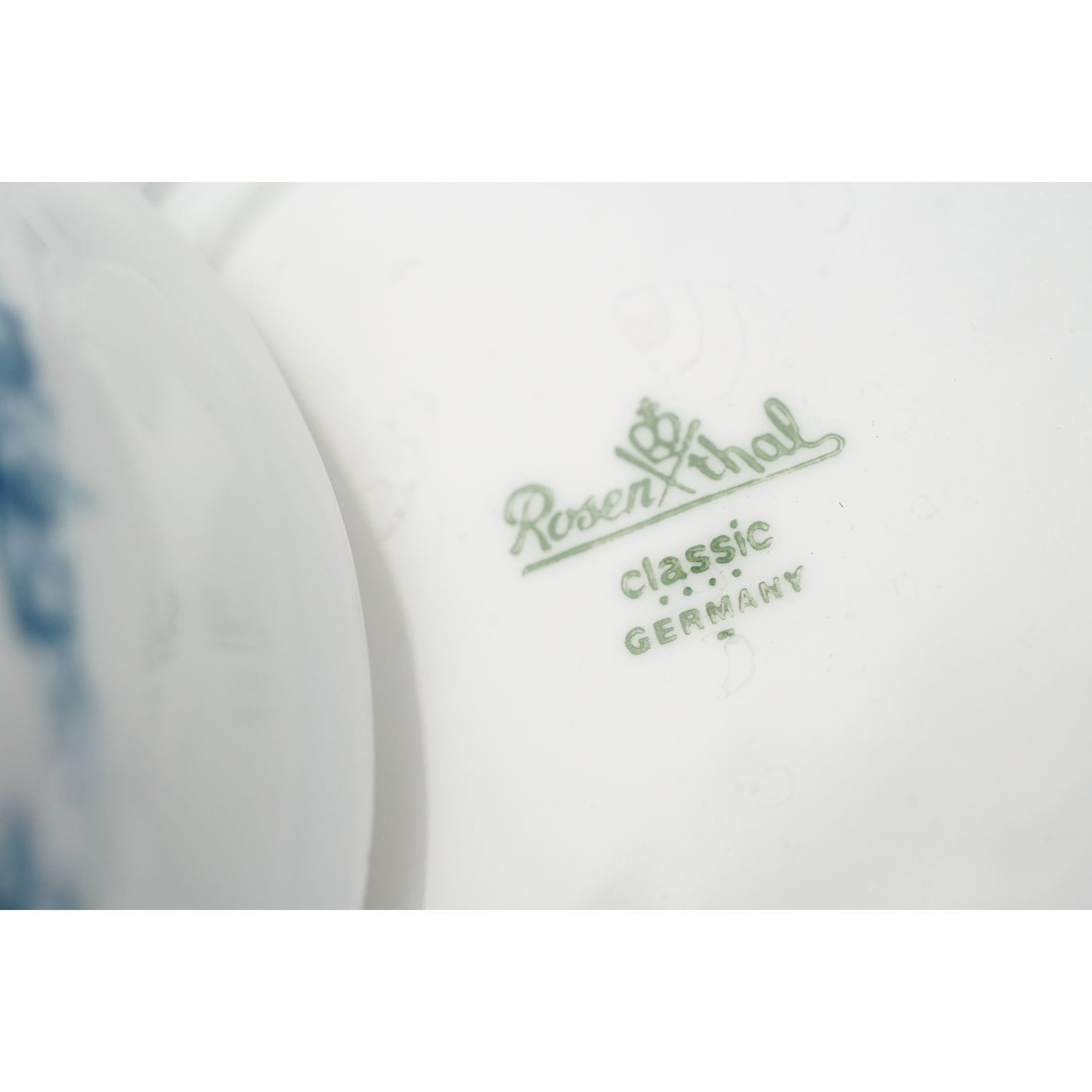 Sygnowany Rosenthal Classic (sygnatura z lat 70-tych XX wieku), dwoma różnymi znakami. Zdobiony girlandami błękitnych różyczek zwanymi Rosenkante-blau. Porcelana biała, szkliwiona. Zdobiona reliefami z kwiatami i owocami granatów. W 1916 roku Philip Rosenthal zaprojektował serwis, który przeszedł do historii jako synonim piękna i luksusu. To jest serwis MARIA. Inspiracją dla Philipa był nabyty przez niego w czasie podróży po Anglii srebrny serwis z 1815 roku. Cechą charakterystyczną był oktagonalny kształt dzbanków i filiżanek oraz również ośmiokątna forma talerzy. Ponadto dekorację na krawędziach wszystkich elementów tworzy bordiura z kwiatów śródziemnomorskiego owocu granatu.