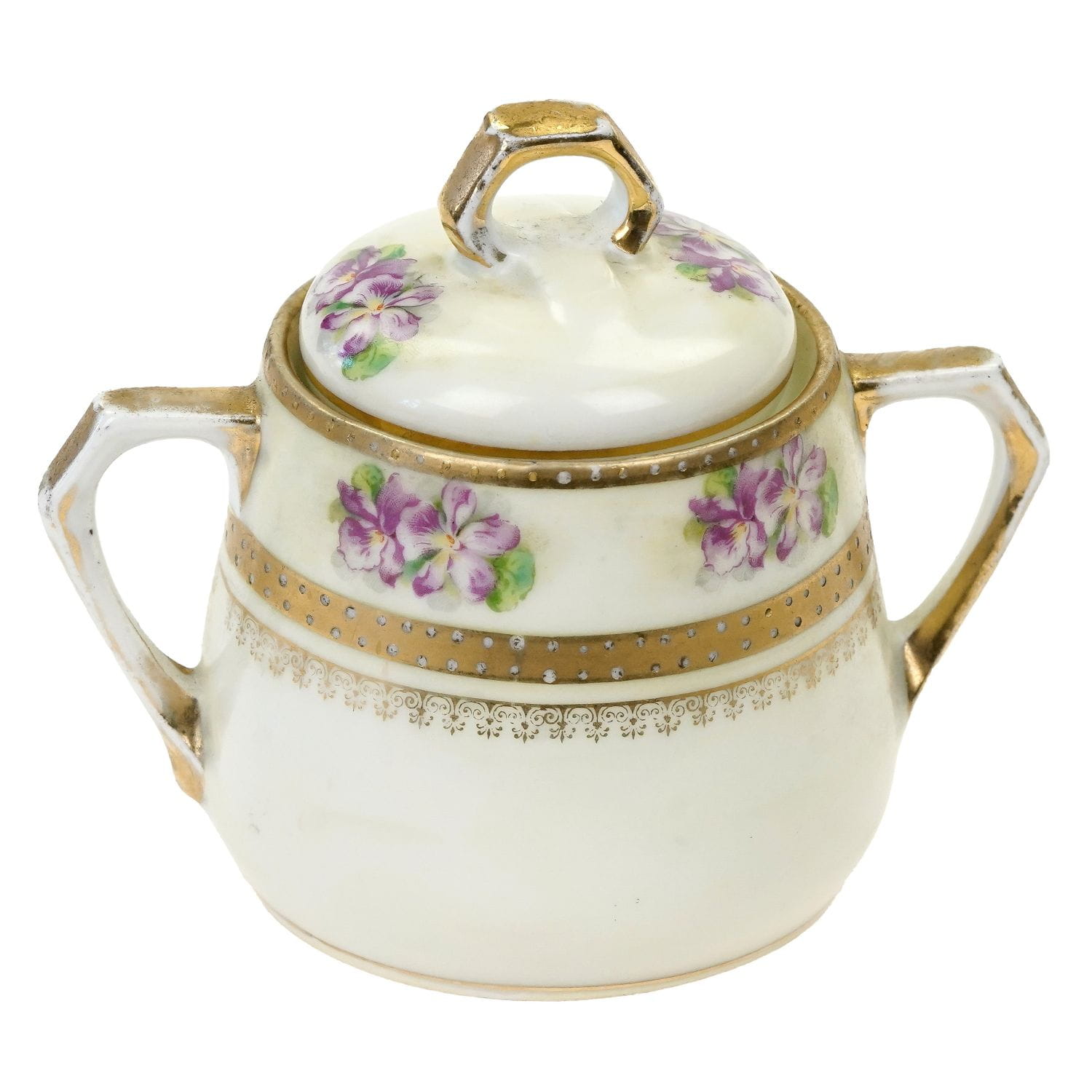 Nie posiada sygnatury. Wykonana z porcelany w odcieniu bieli pokrytej waniliową malaturą i złoceniami. Na porcelanie bukiety fiołeczków. Z jednej strony widoczek z napisem w języku niemieckim "Gruss aus Harzburg Molkenhaus" (Pozdrowienia z Harzburga Molkenhaus). Molkenhaus w górach Harz, niedaleko Bad Harzburg w powiecie Goslar w Dolnej Saksonii, to stajnia zbudowana w 1822 roku jako dom drewniany, który później pełnił funkcję pensjonatu i restauracji dla wycieczek.