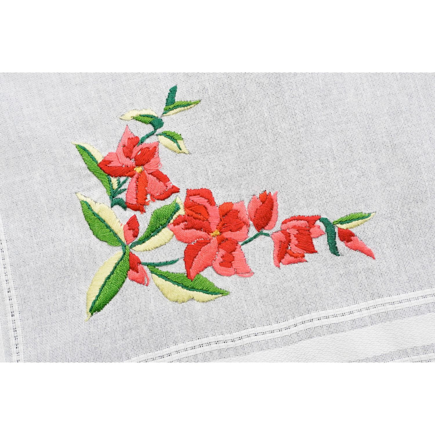 Wykonany z bawełnianej tkaniny w odcieniu białym. Udekorowany ręcznym haftem wypukłym przedstawiającym czerwone kwiaty z zielonymi listkami. Wyjątkowo piękne wykonanie!