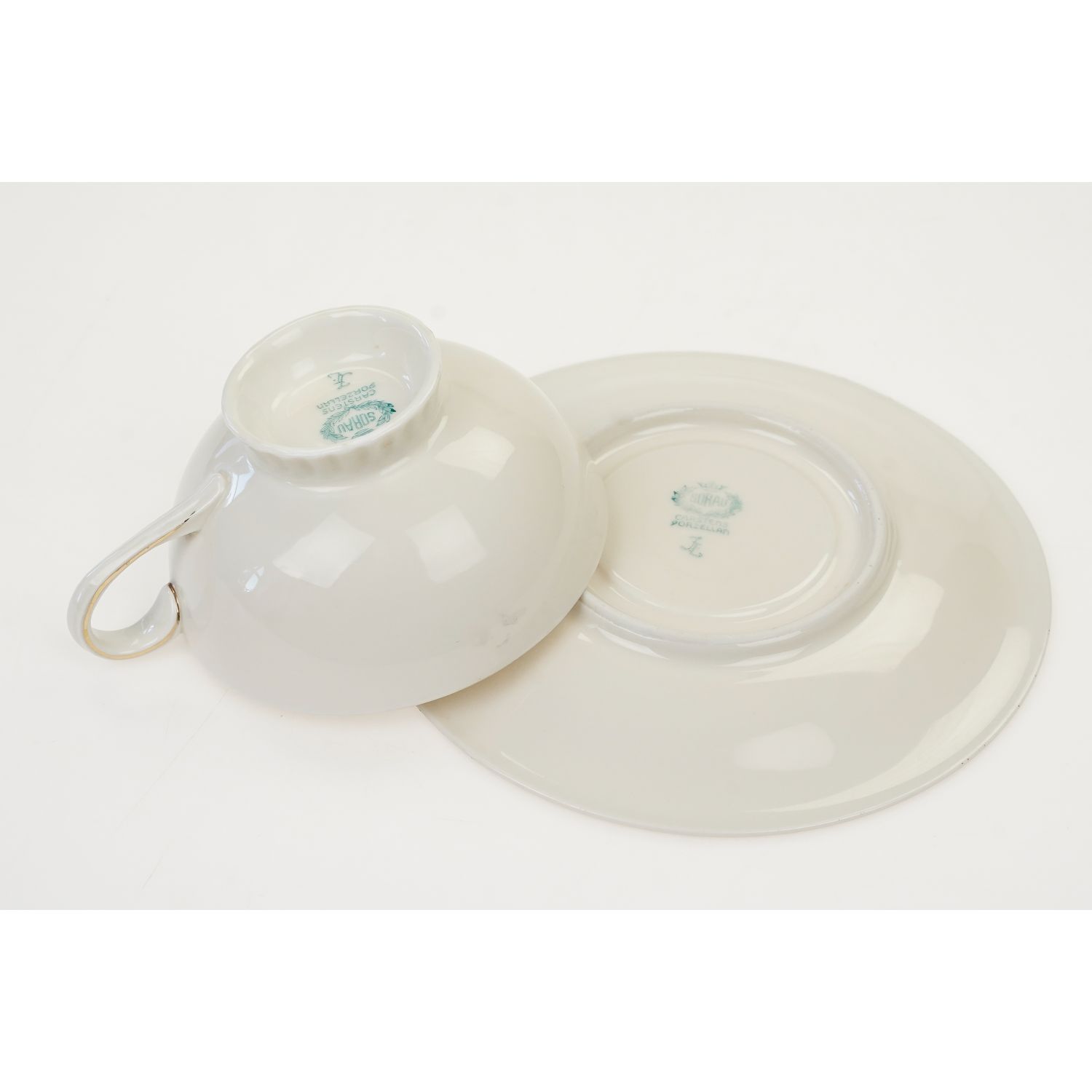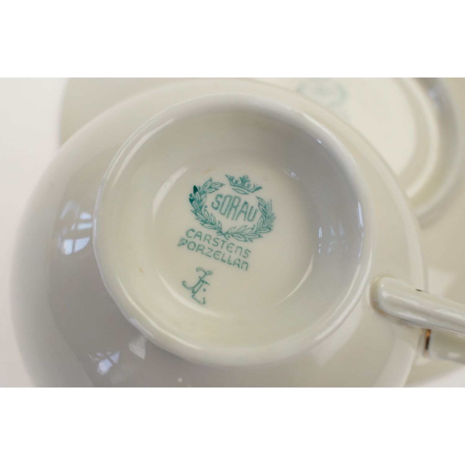 Pochodzi z Żar (niem. Sorau) z C. & E. Carstens Porzellanbabrik Sorau. Sygnowana znakiem stosowanym od 1925 roku. Fason Sorau, którego autorem był Profesor Artur Hennig. Zaprojektowany w 1934 roku. Dekor 80. Porcelana w kolorze kości słoniowej z kanelowaniami na stópce filiżanki. Wszystkie elementy zdobione złoceniami przy konturach, a przy krawędziach czarny, delikatny szlaczek.