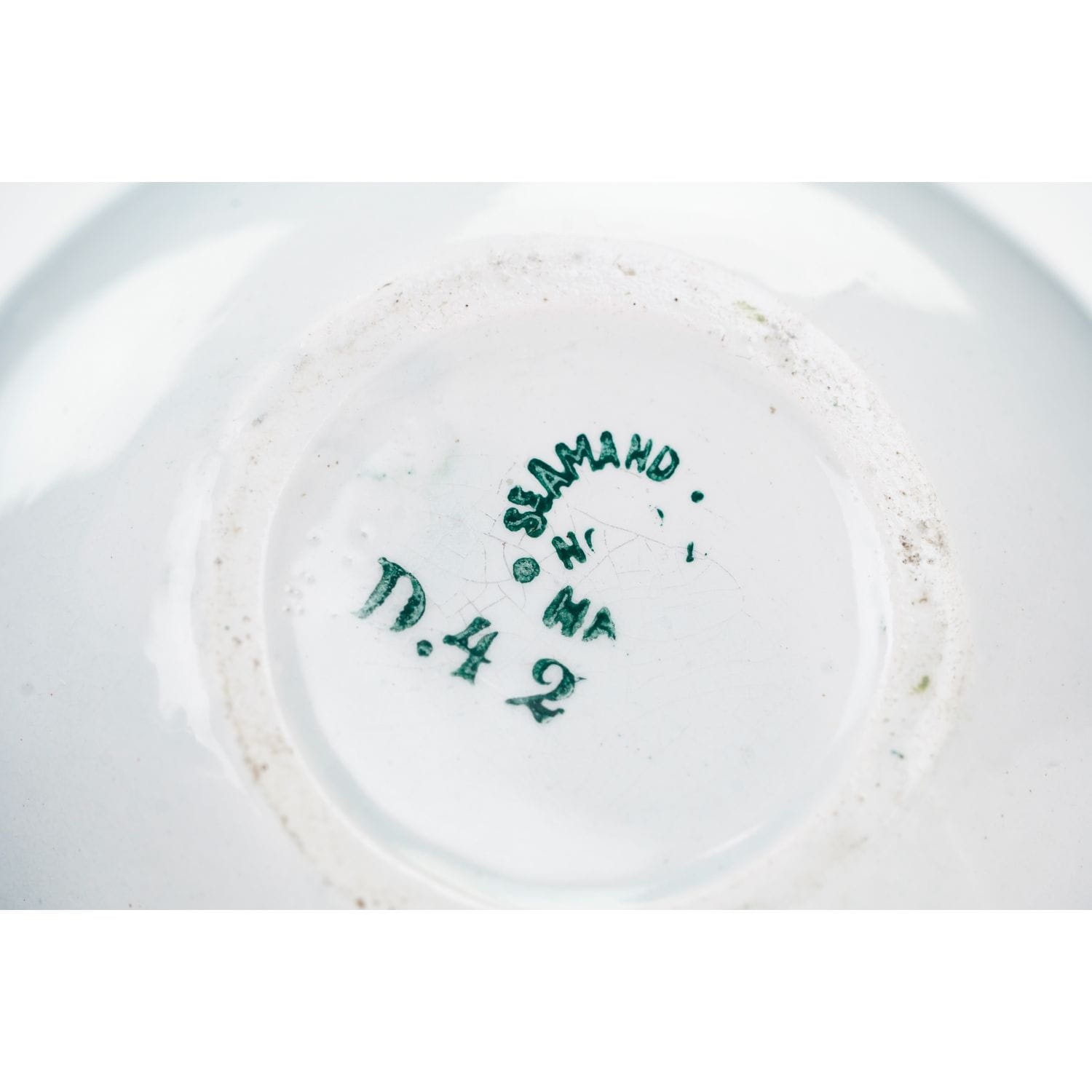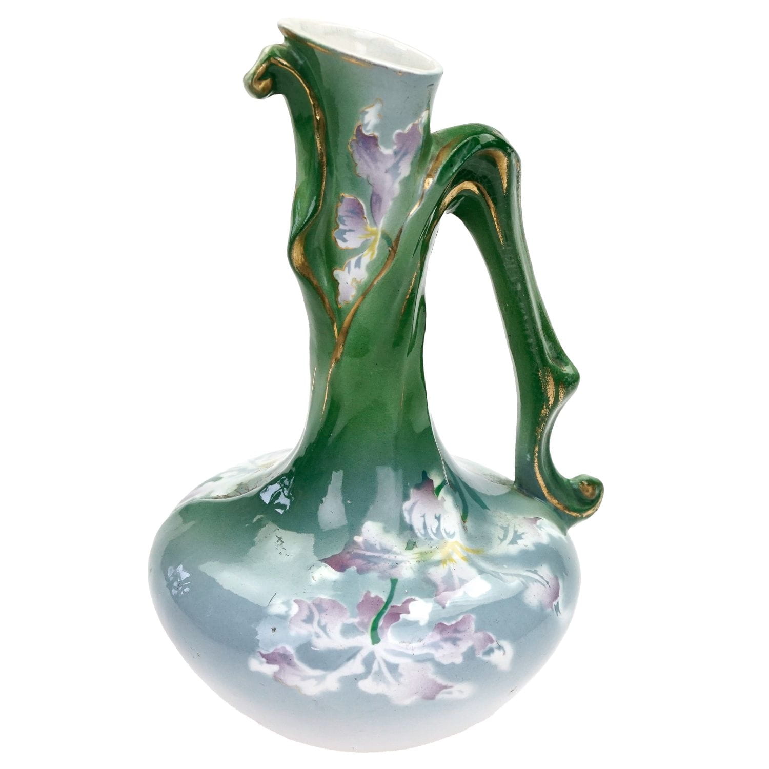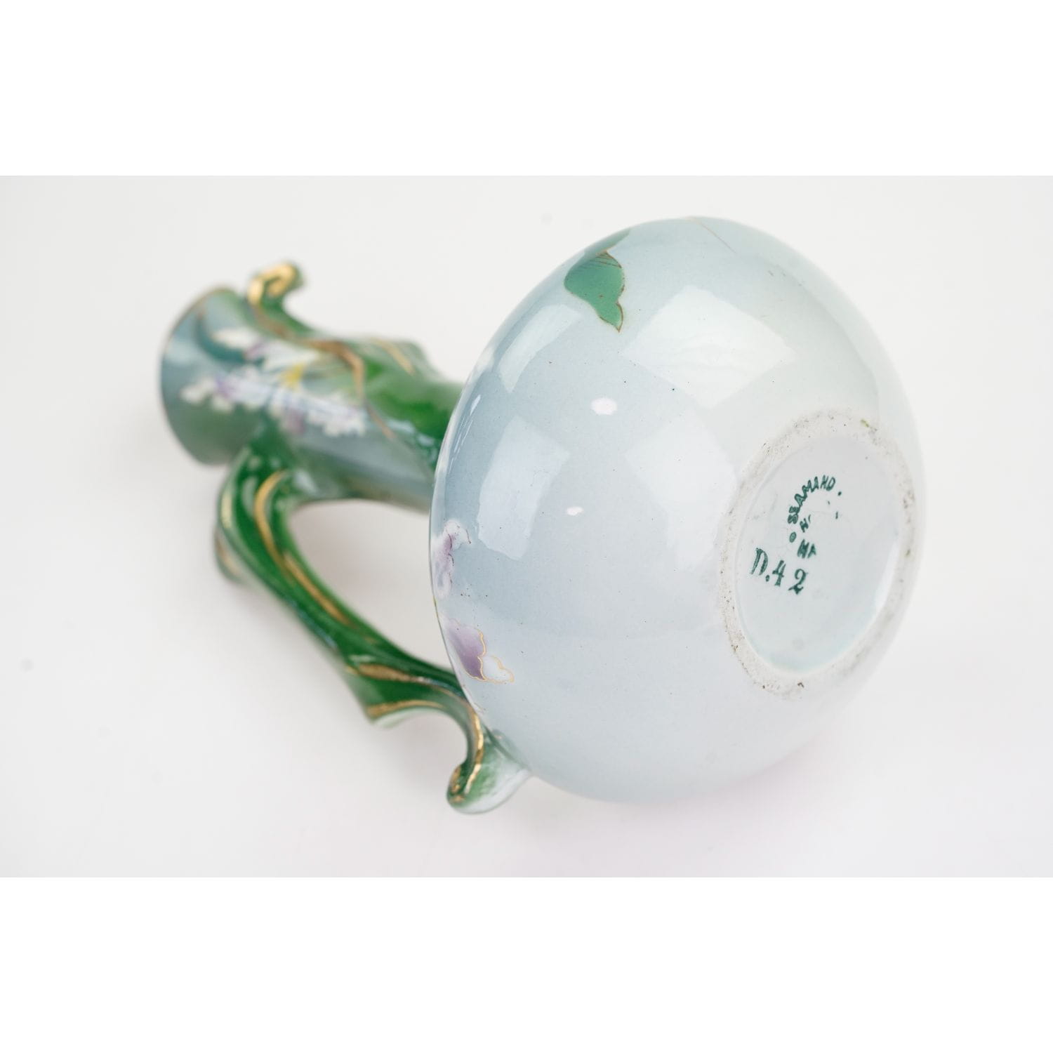 Francja, St. Amand, Grands Etablissements Ceramiques. Przełom XIX/XX wieku. Majolika z pięknymi reliefami szaro-zieloną malaturą. Na niej kwiatki naniesione za pomocą szablonu. Ucho konturówce, trochę przetartej.