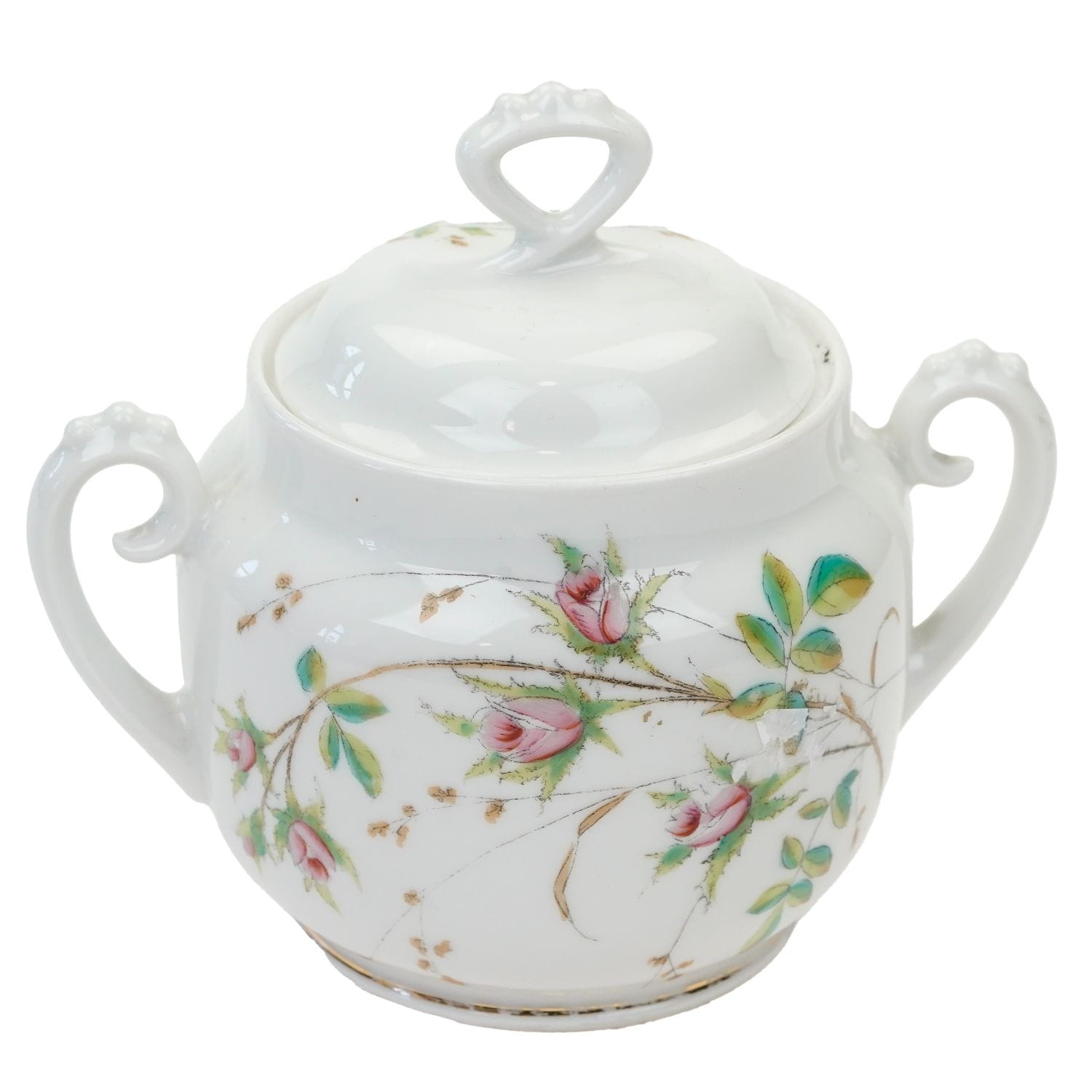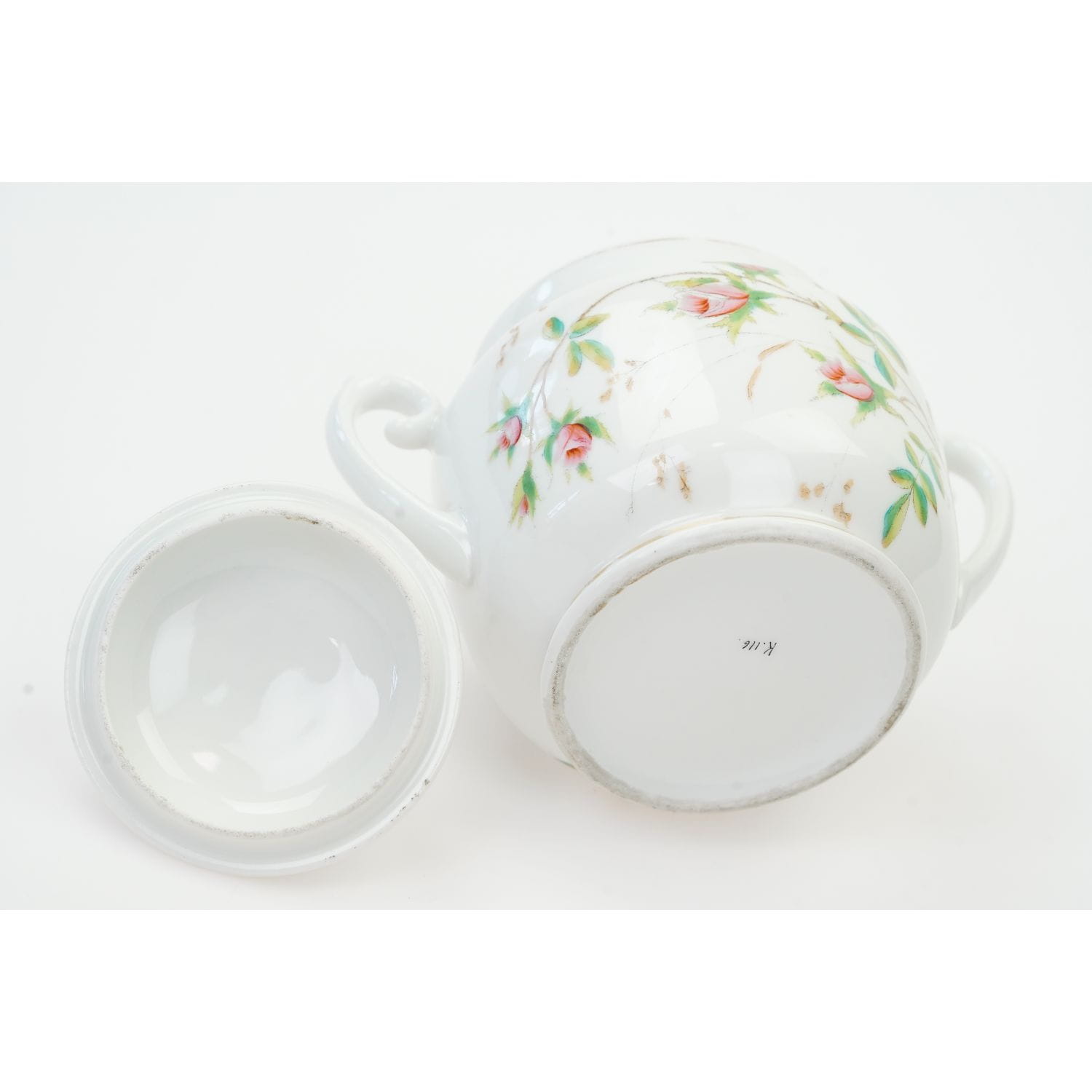 Sygnowana jedynie odręcznym znakiem dekoratora. Piękna, biała porcelana. Zdobiona ręcznie malowanymi kwiatami róż, a właściwie ich pąkami.