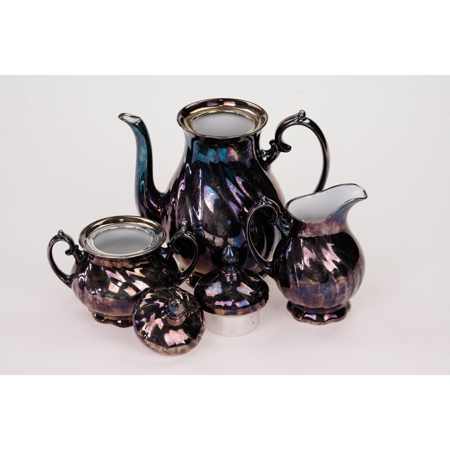Wspaniały, zabytkowy komplet, zestaw, garnitur środka stołu: dzbanek, cukiernica i mlecznik.