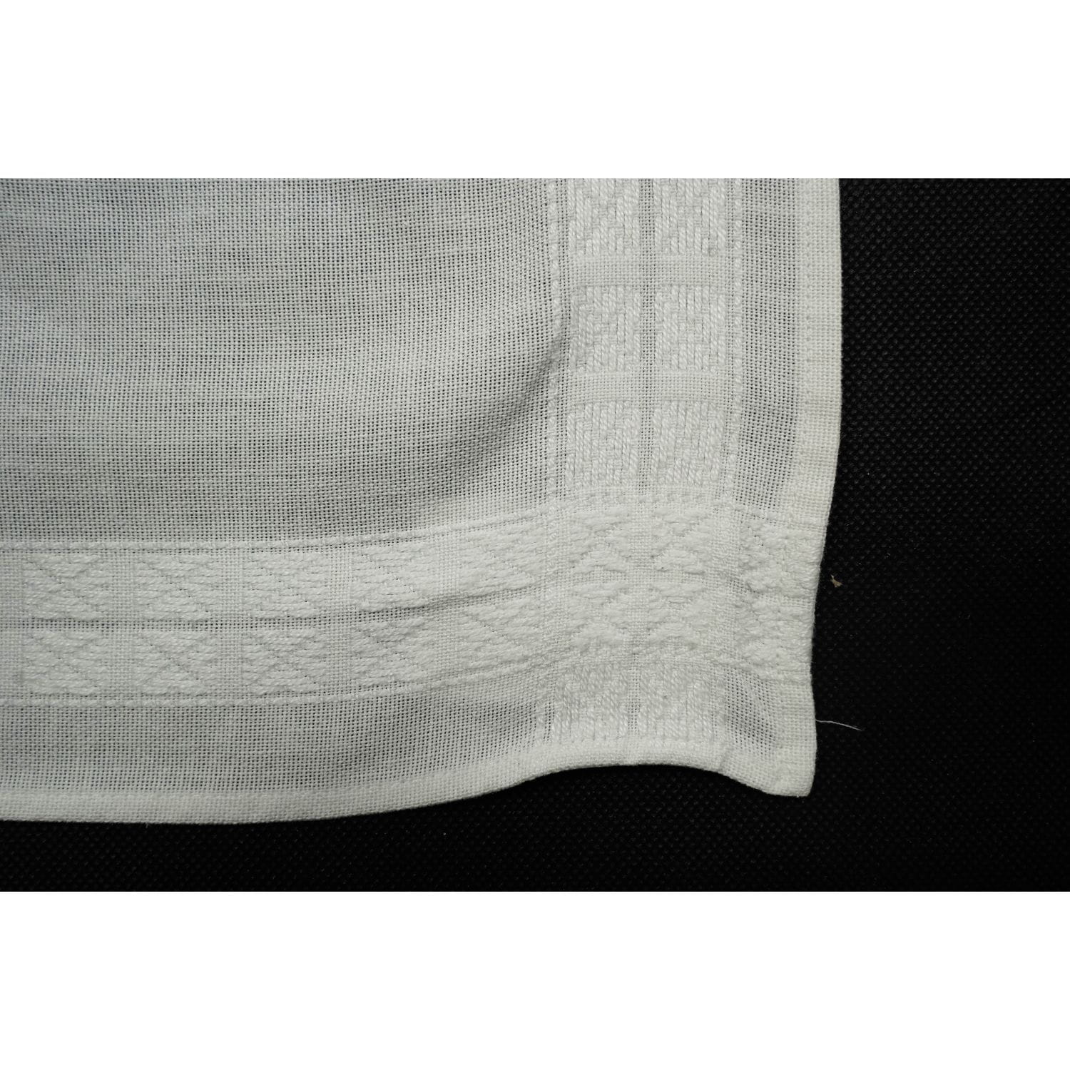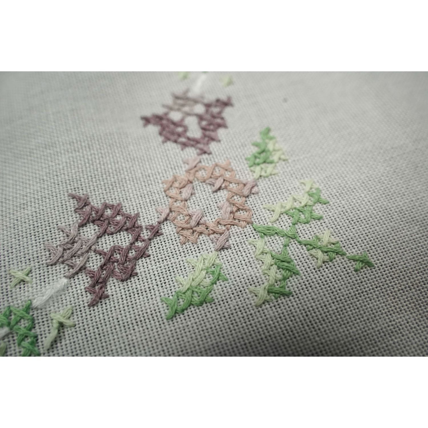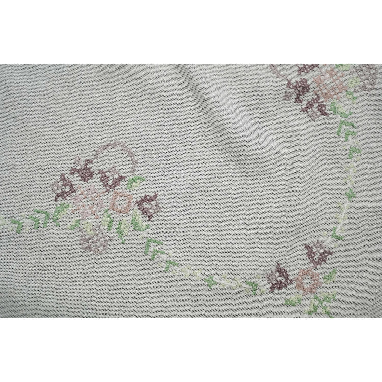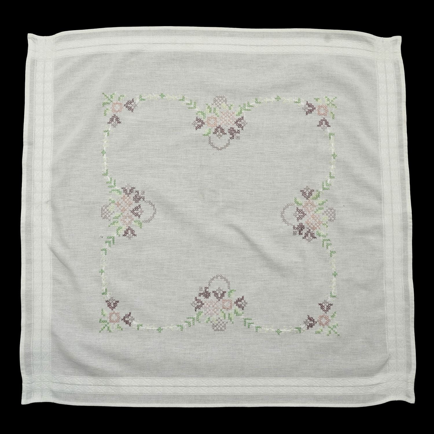 Wykonany z bawełnianej tkaniny w odcieniu złamanej bieli z tłoczonym wzorem na połyskującej krawędzi. Udekorowany ręcznym haftem krzyżykowym przedstawiającym kosze kwiatów. Dekoracje w odcieniach stonowanej zieleni i fioletu.