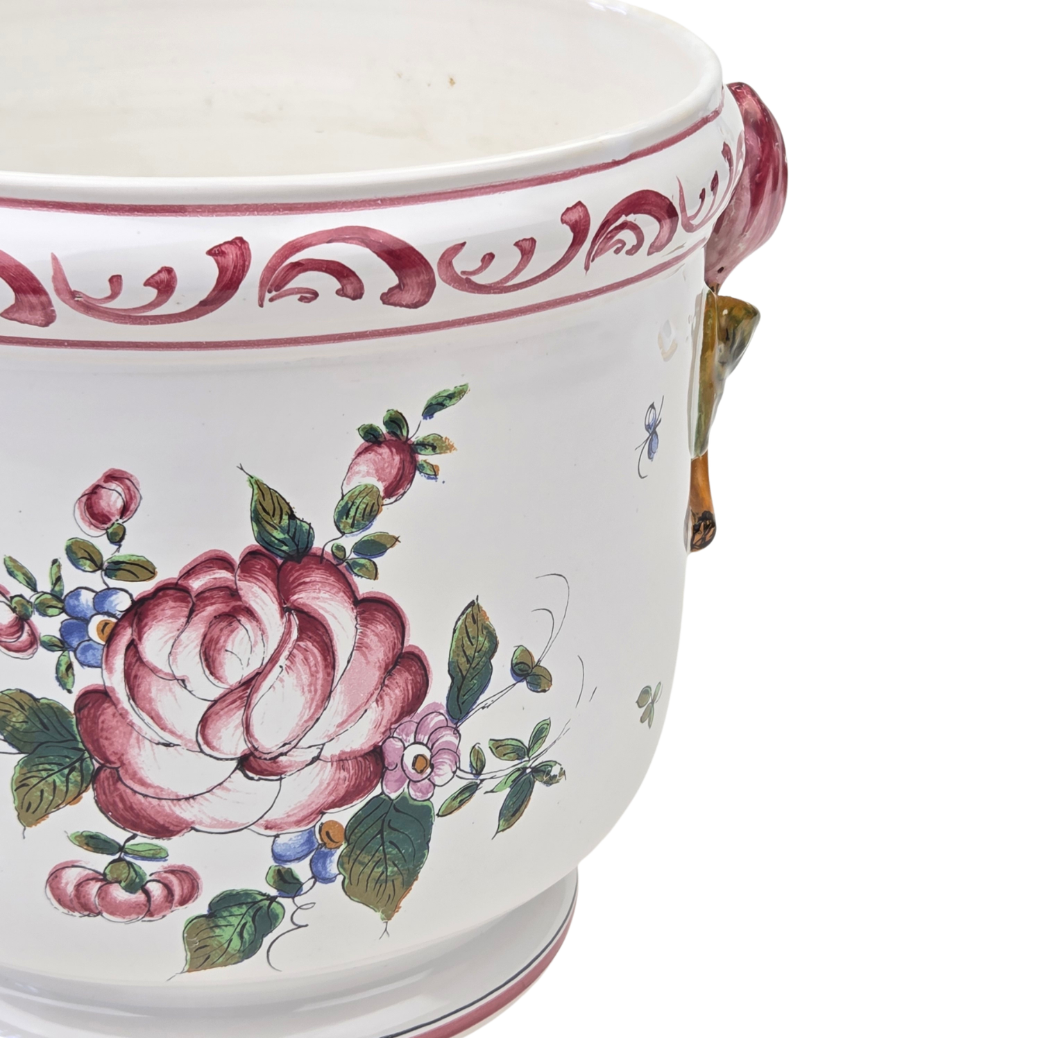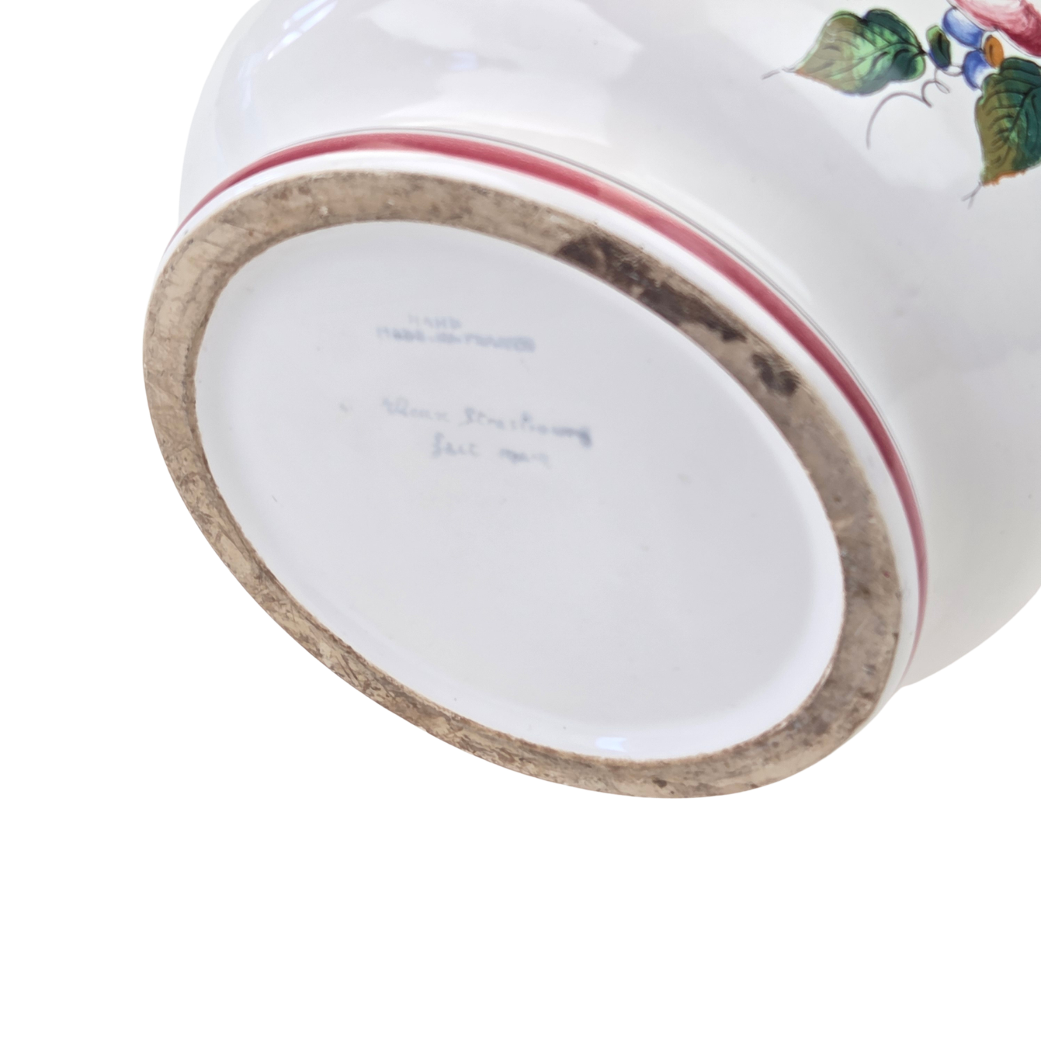 Pochodzi z Francji ze Strasbourga. Sygnowana jak na zdjęciu. Z obu stron uszy w postaci ręcznie nakładanych, plastycznych kwiatów. Na donicy kwiaty piwonii. Ranty w różowej konturówce. Z różowym szlaczkiem przy górnej krawędzi.