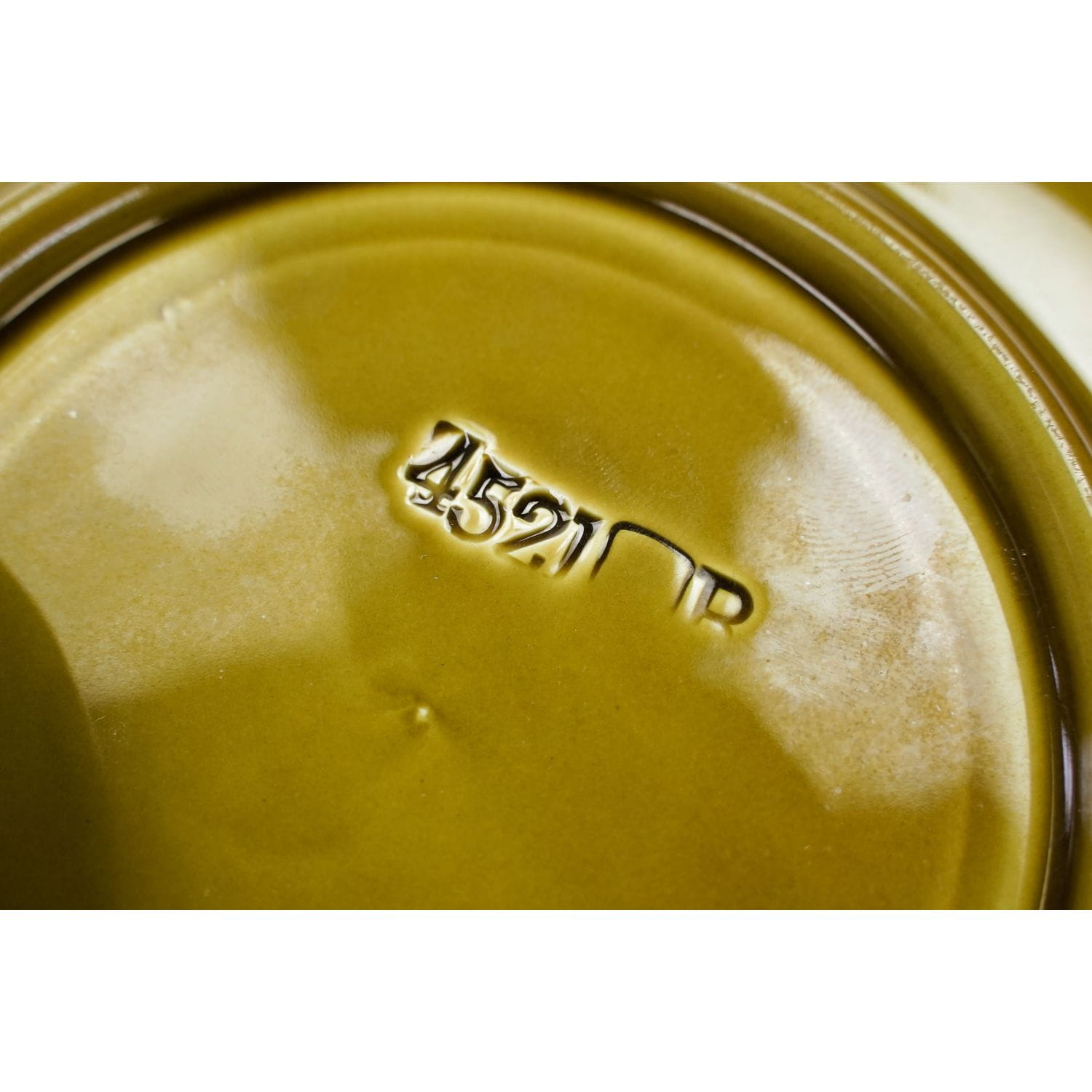 Na podstawie jedynie numeryczne wyciski w masie. Prosta forma naczyń. Na filiżance żłobiony i malowany ciemniejszym kolorem liść z jednej strony i jabłko z drugiej.