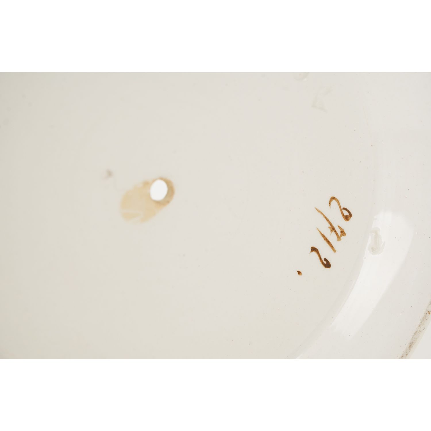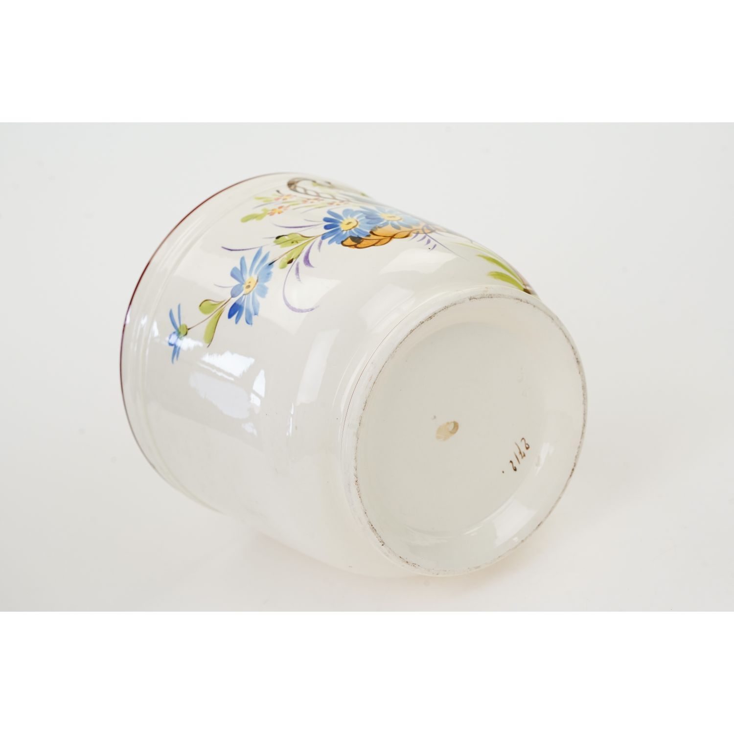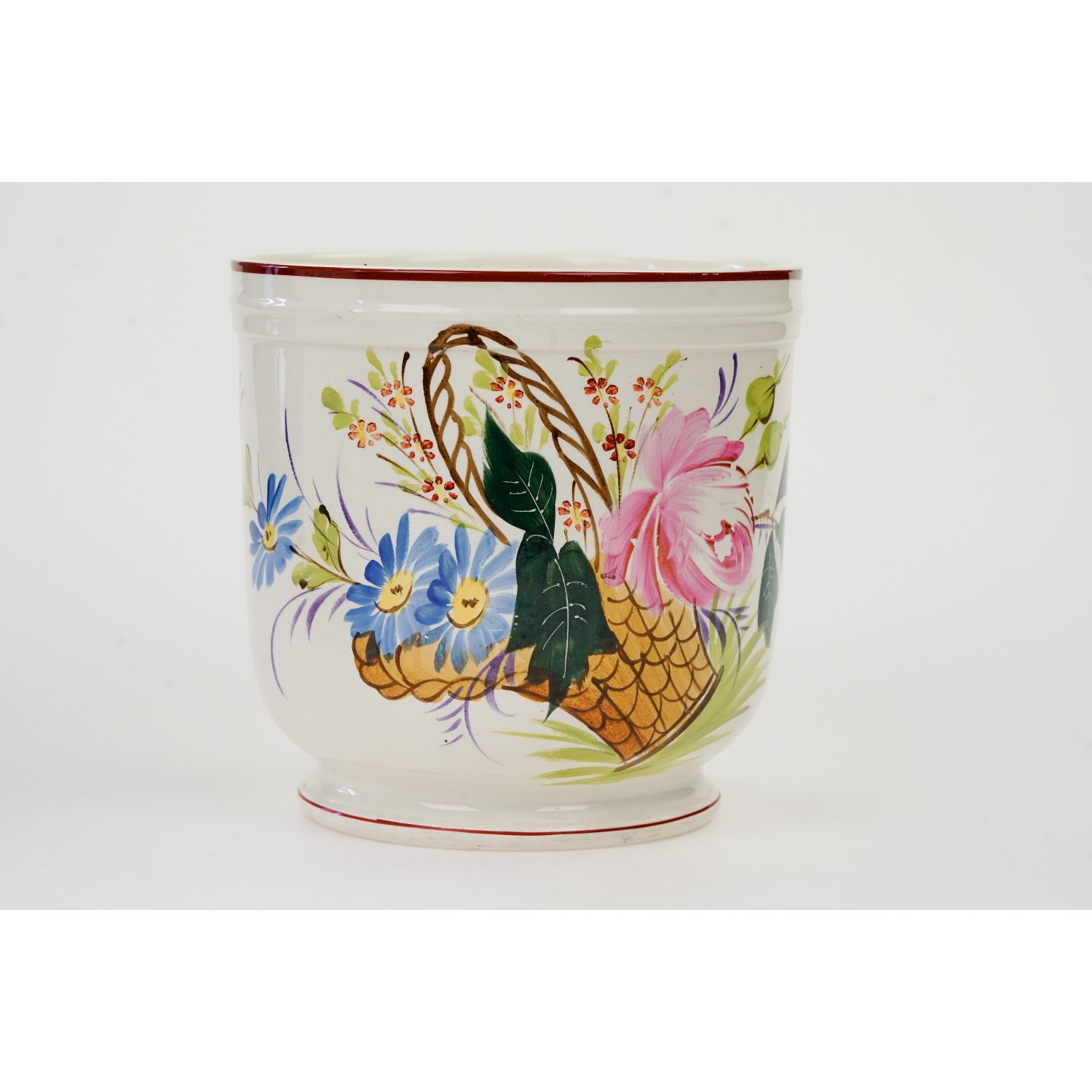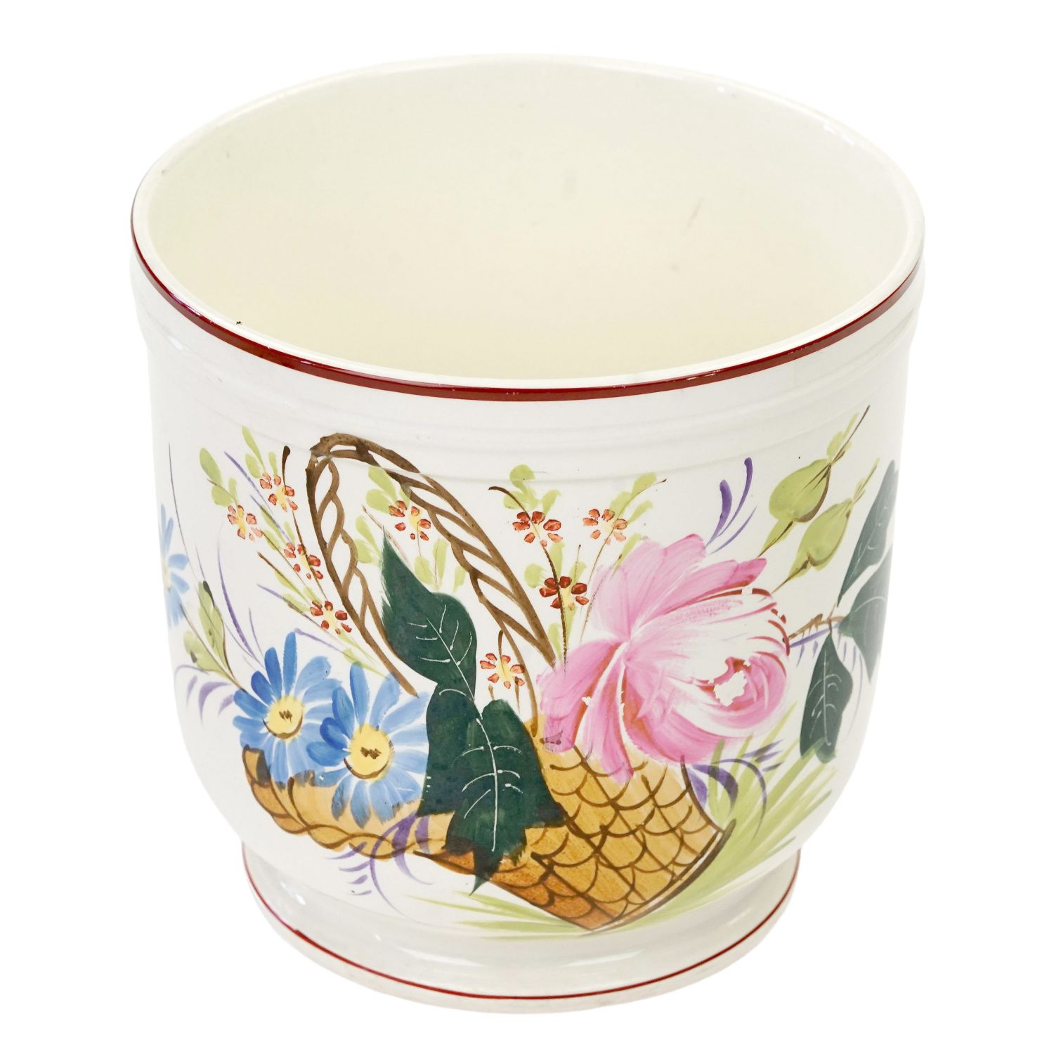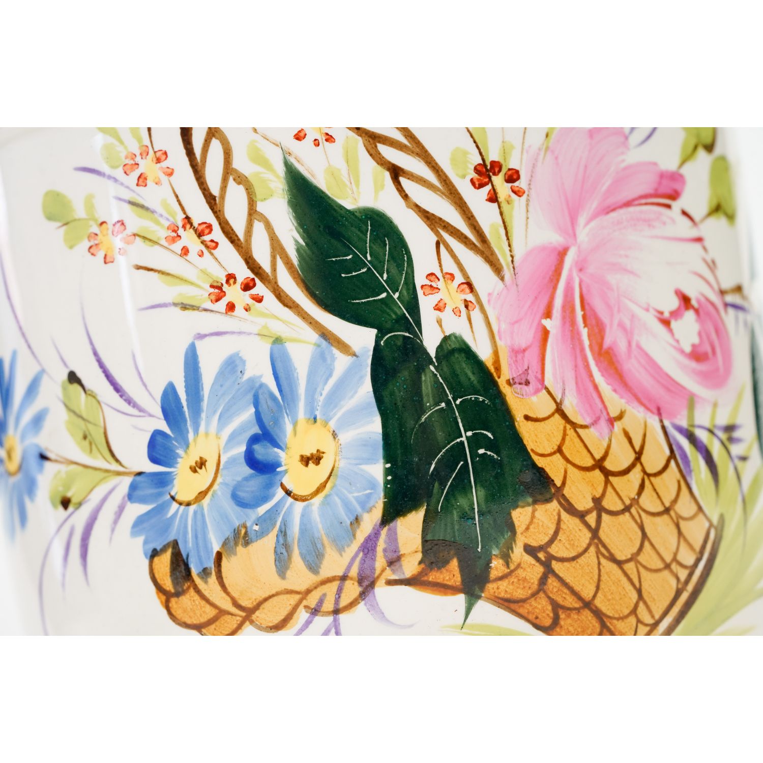 Stara majolika, ręcznie malowana. Od spodu odręczny znak numeryczny i wyciski w masie. Całość na zewnątrz w kolorze kremu, który jest świetnym tłem dla ręcznie malowanej dekoracji przedstawiającą barwne kwiaty w koszu z jednej strony. Całość szkliwiona. Podstawa i górna krawędź w brązowych obwódkach.