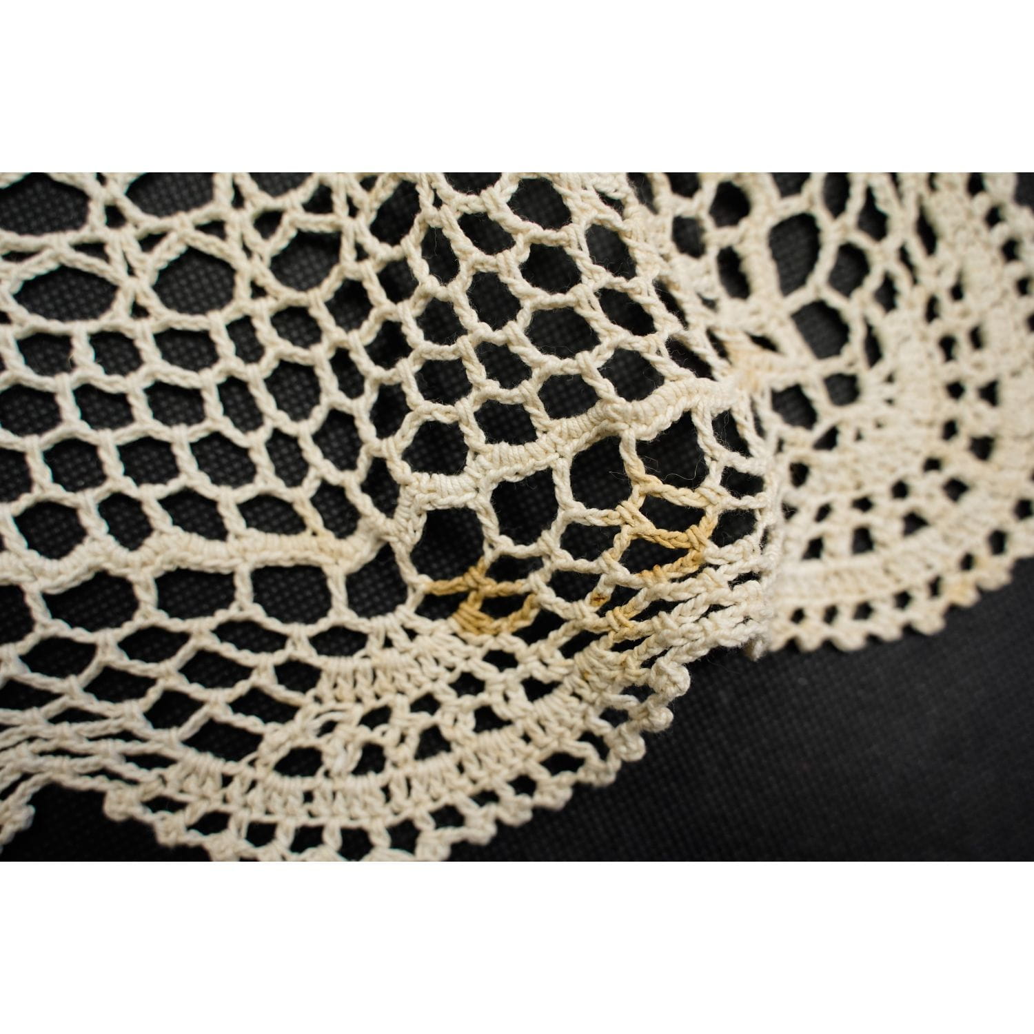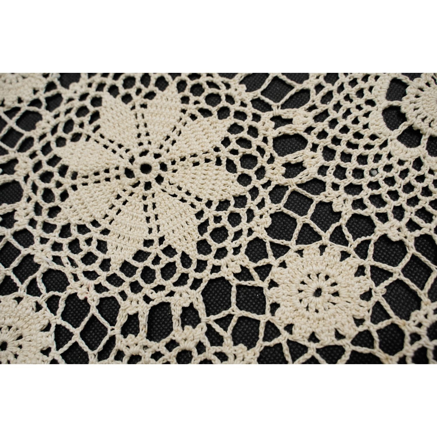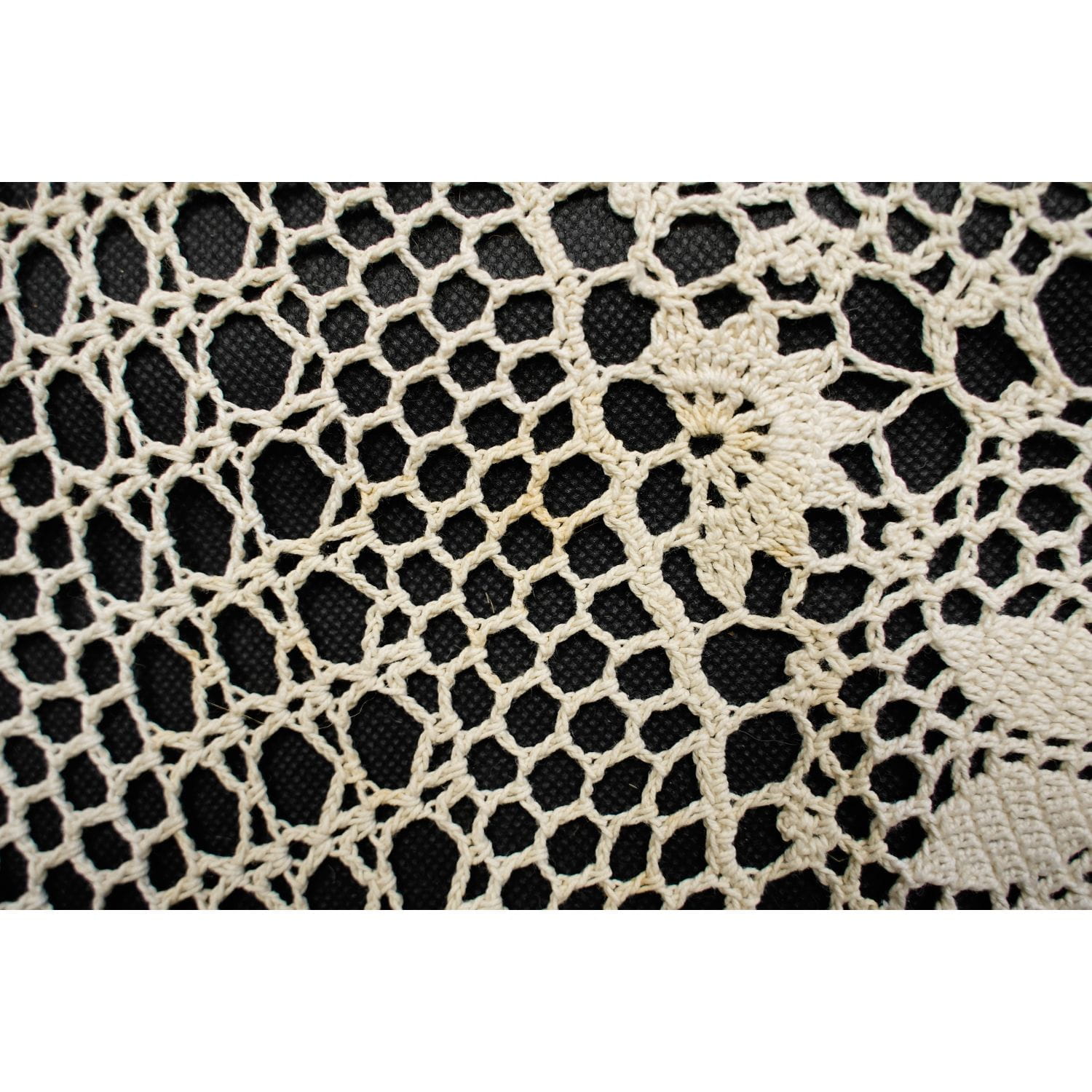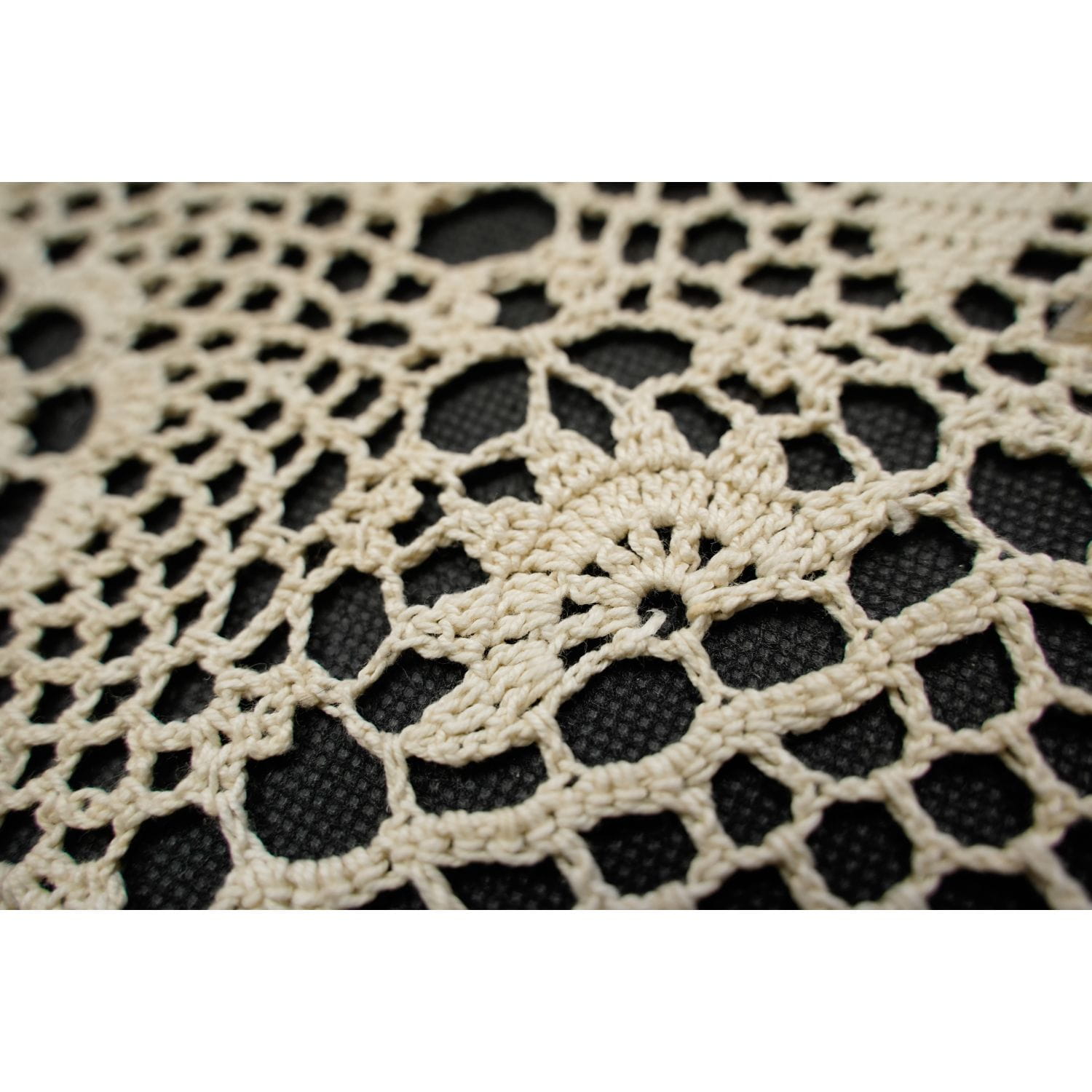 Wykonany w całości ręcznie na szydełku z nitki bawełnianej średniej grubości w odcieniu beżu. Deseń w tradycyjne rozetki ujęty w prostą ramę z falowaną krawędzią.