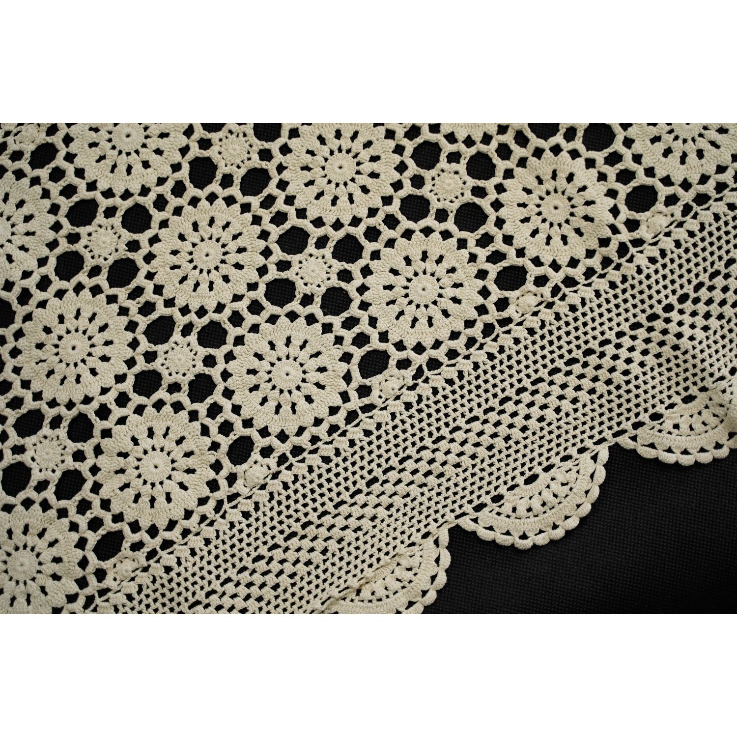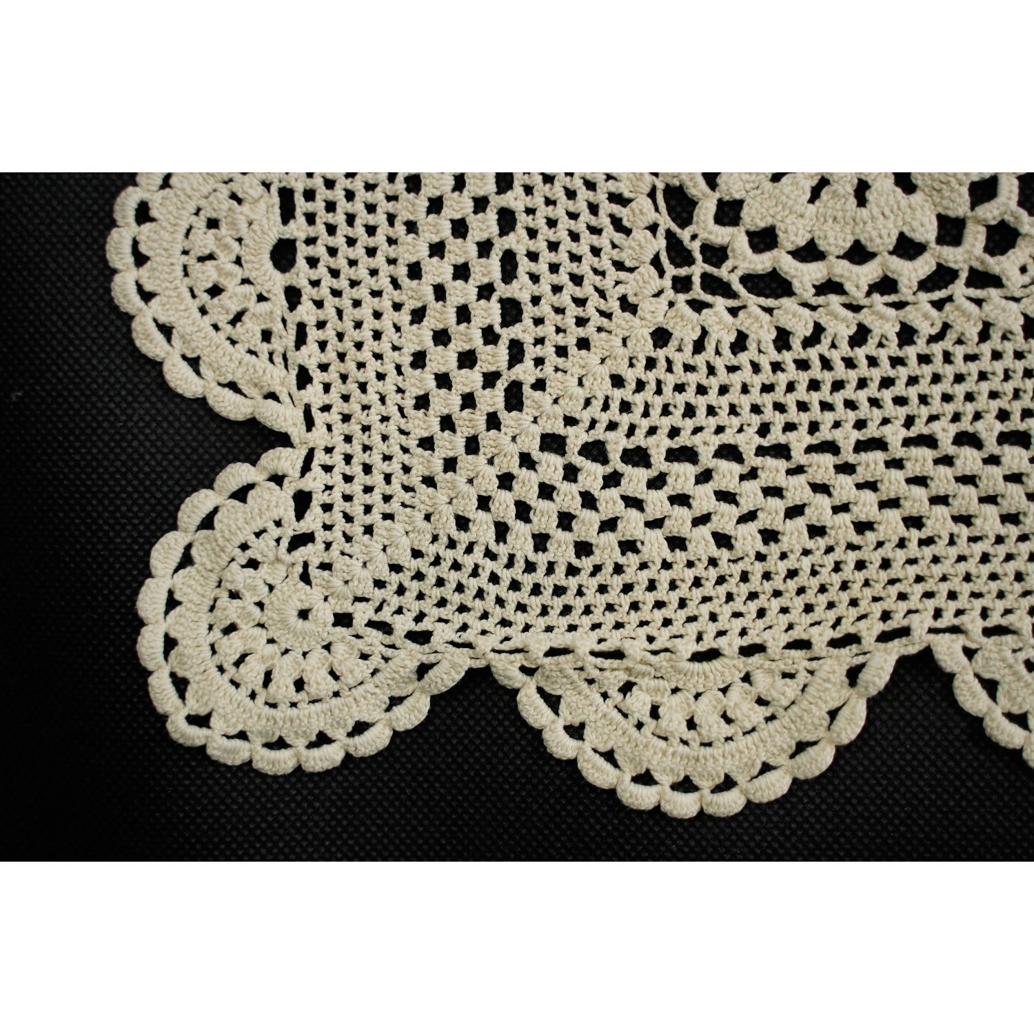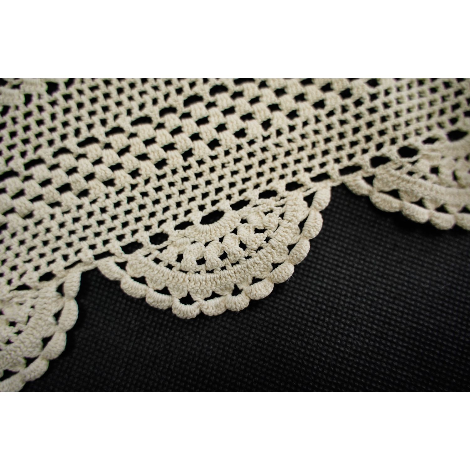 Nitka bawełniana, dość delikatna w kolorze ciepłego kremu lub jasnego beżu. Wzór w rozetki. Wszystko ujęte w szydełkową rameczkę. Rant falowany. Pięknie się będzie prezentował na komodzie. Idealne towarzystwo dla antyków. Z pewnością pomoże w tworzeniu pełnej ciepła i przytulności atmosfery.