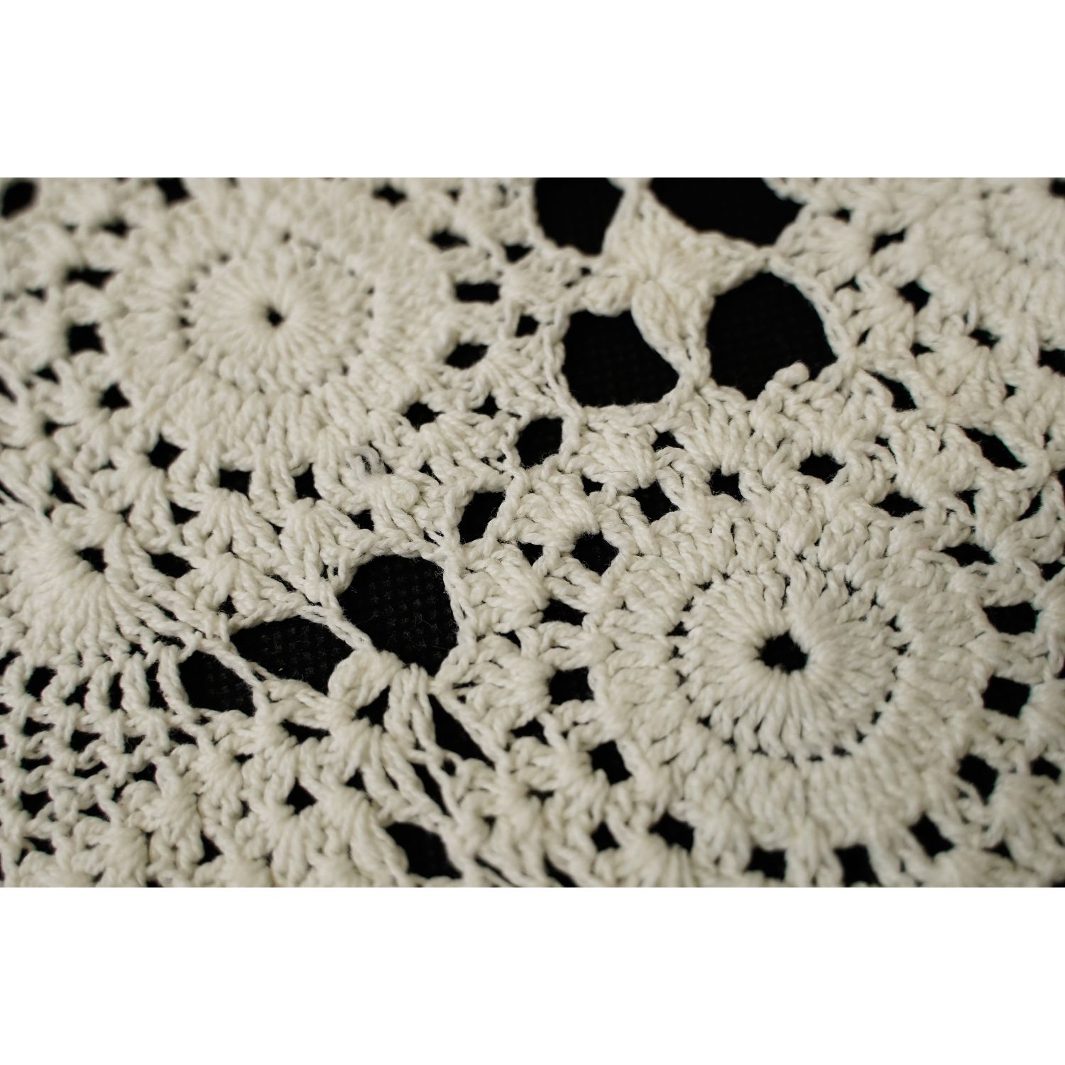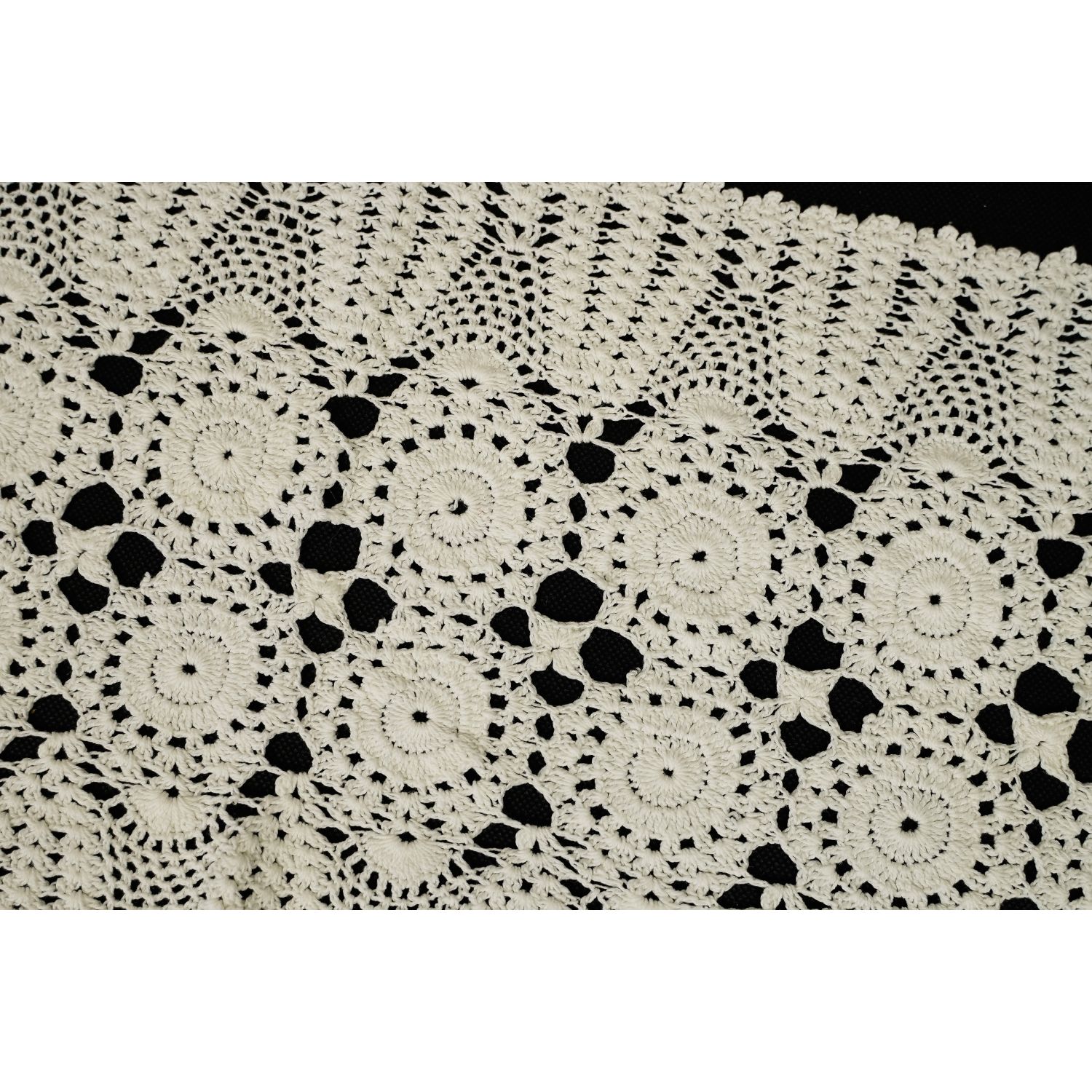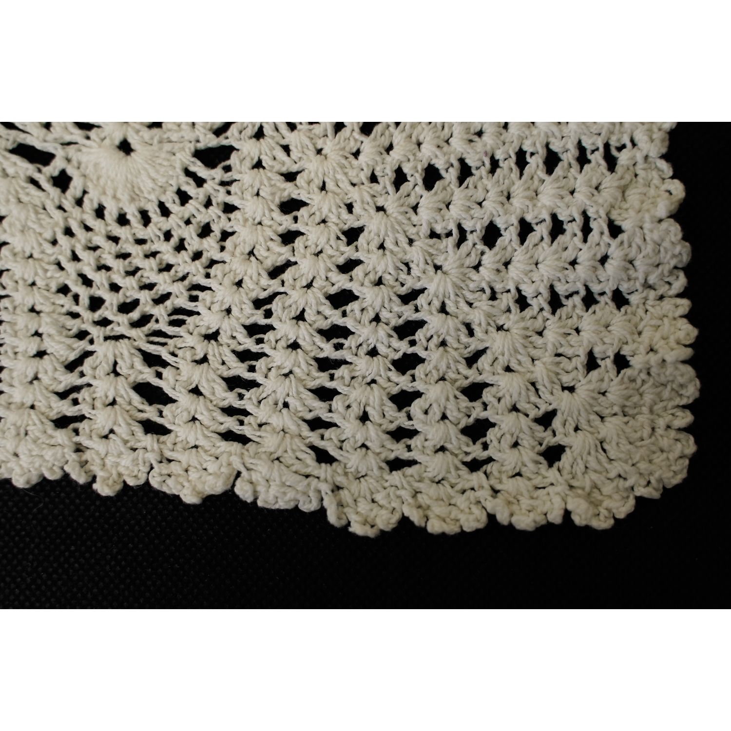 Nitka w kolorze lekko złamanej bieli, bawełniana, dość delikatna. Wzór w rozetki, pracochłonny. Przyjemny dla oka.