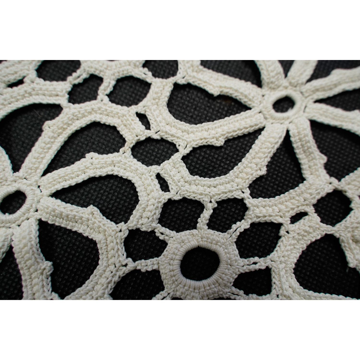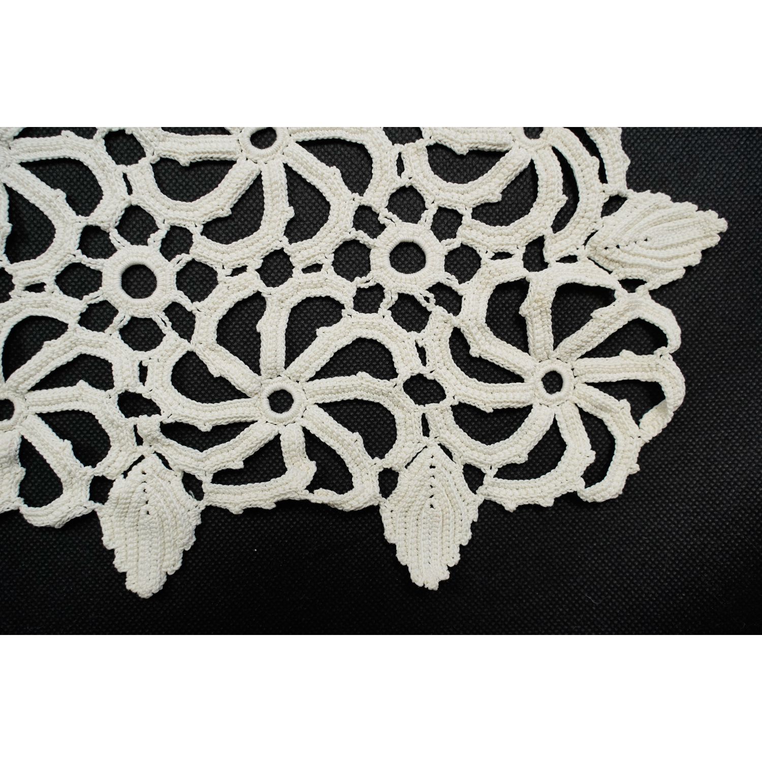 W całości ręcznie wykonany na szydełku z białych, mięsistych nici. Ciekawy wzór przypominający trochę koronki irlandzkie. Ściśle dziergany. Przepiękny, skomplikowany i niesamowicie pracochłonny wzór. Kolor to złamana biel lub jasny krem.