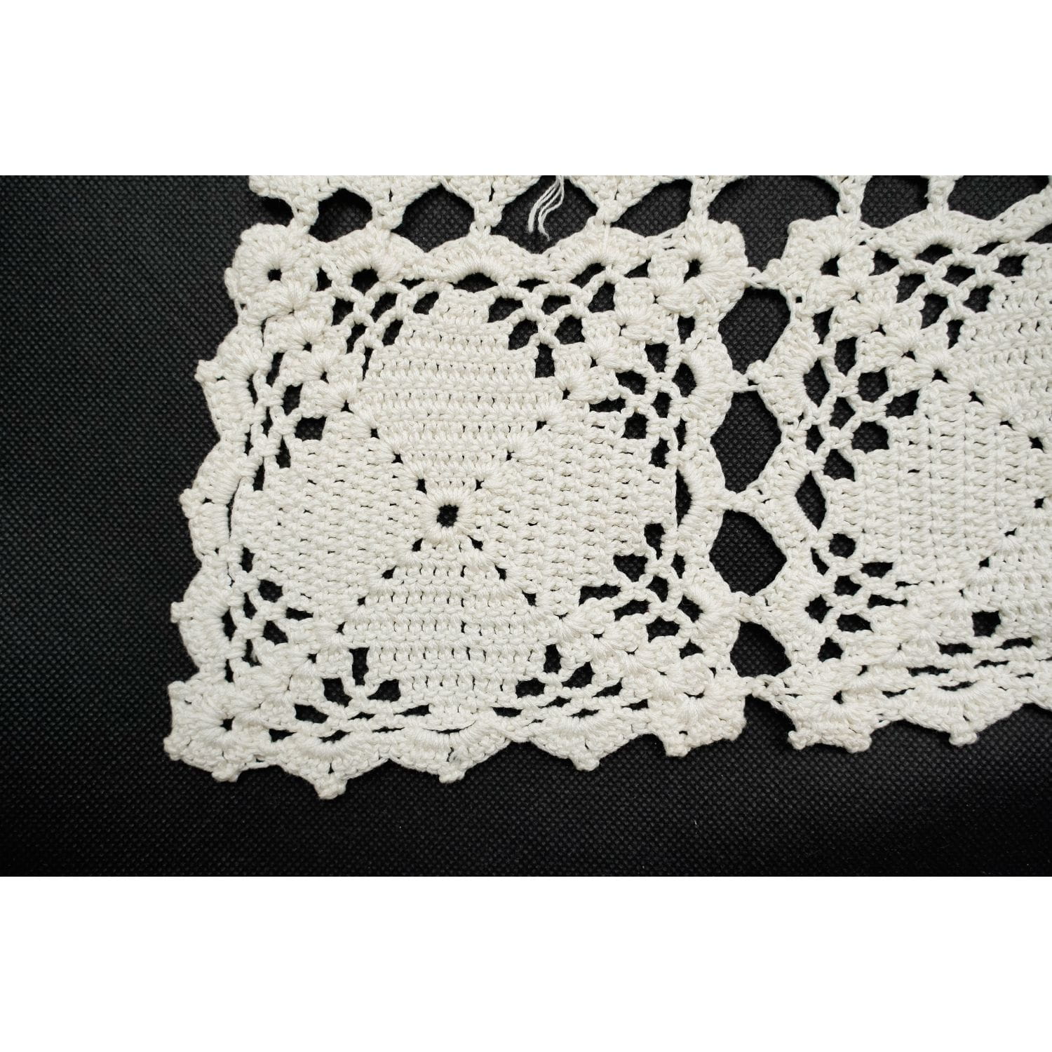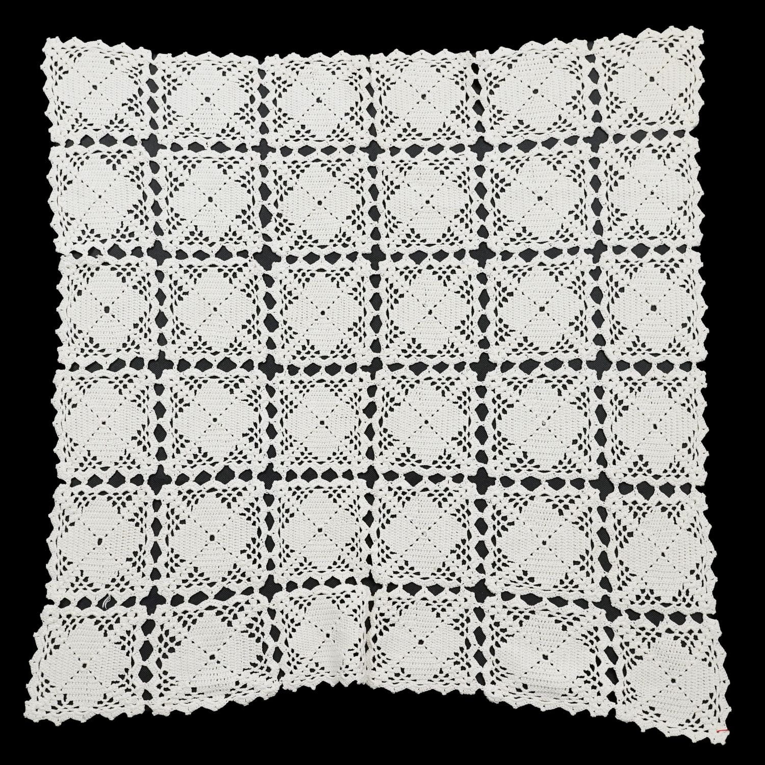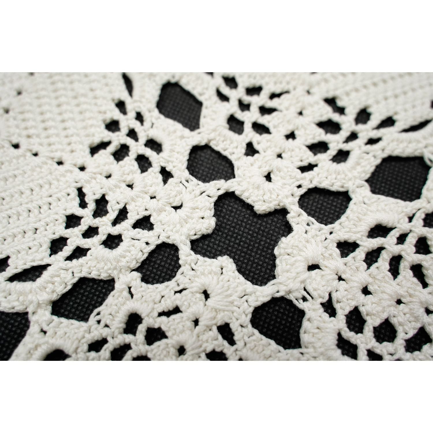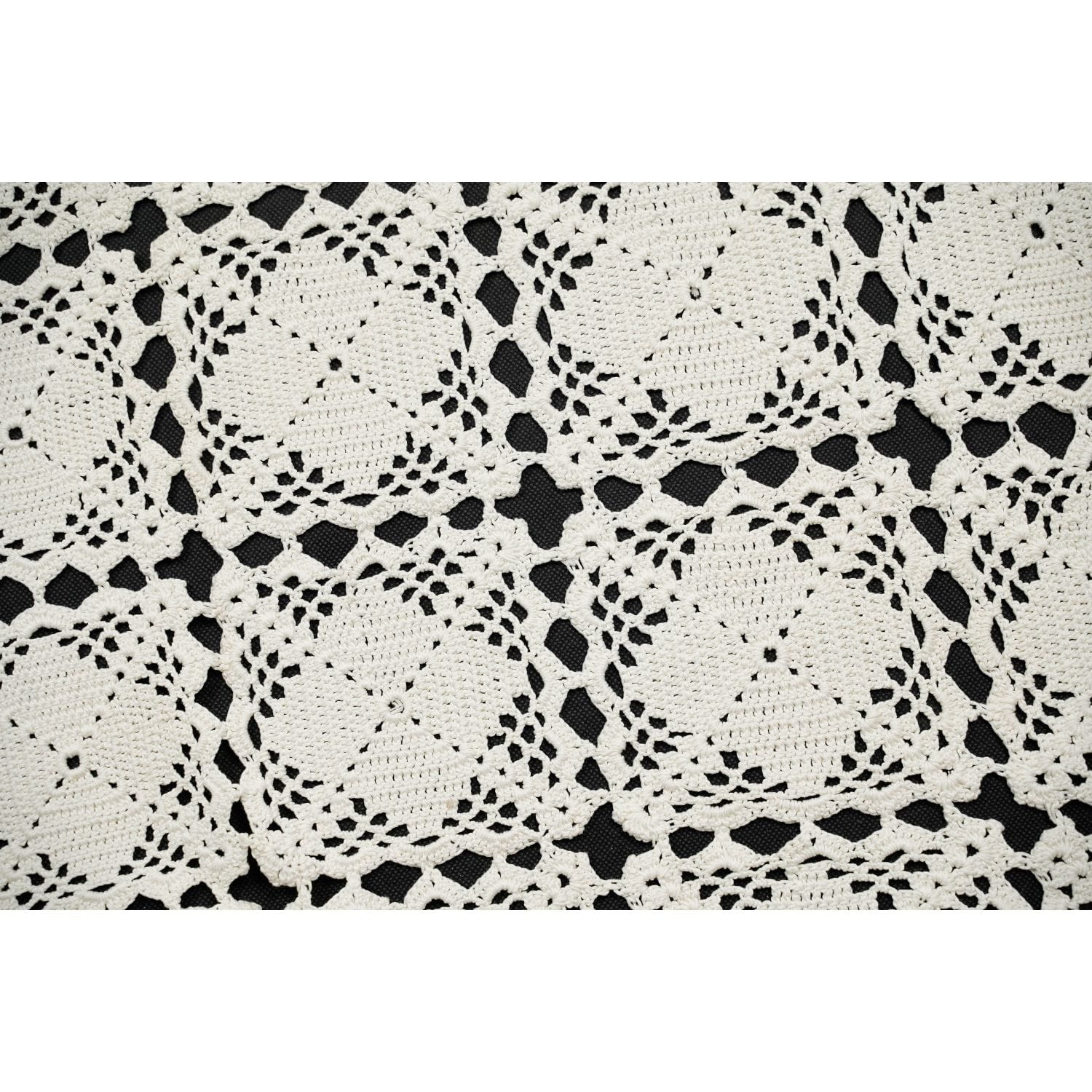 Szydełko, kremowy, prawie kwadratowy obrus.