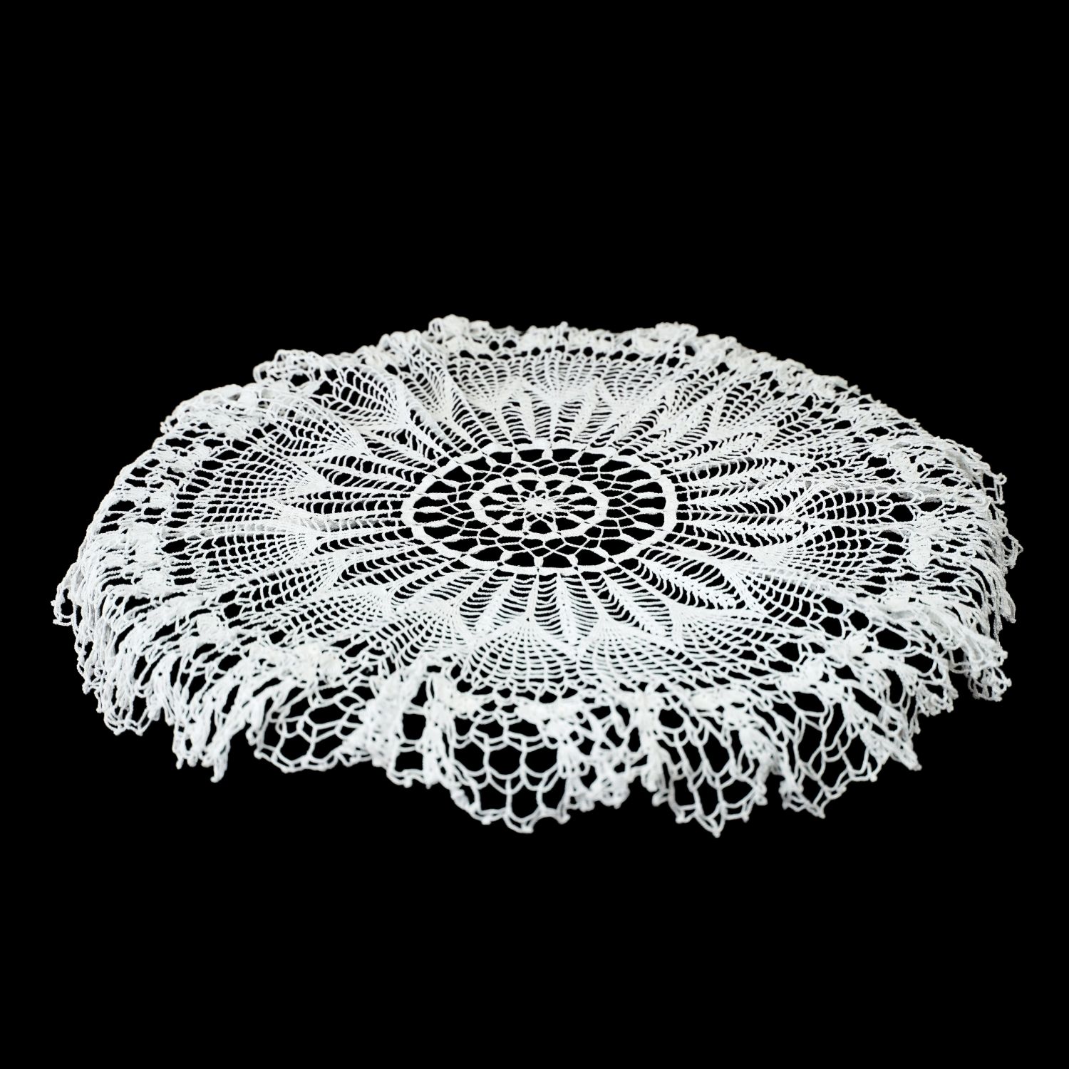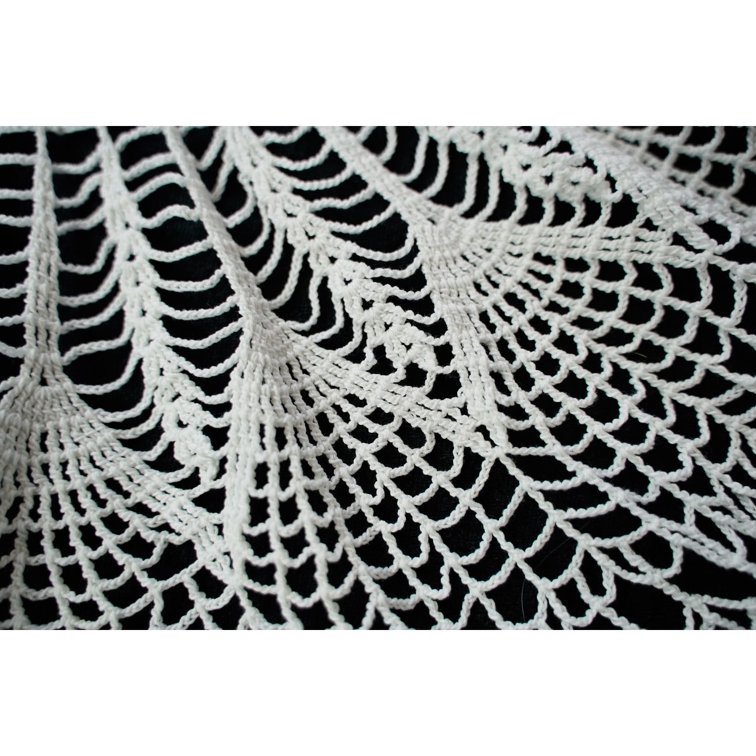 Wykonany z białej, bawełnianej, dość solidnej nitki. Wzór bardzo ciekawy z dużymi ażurami i rozetą na środku. Stolik przykryty tym obrusem wygląda jak w sukience!