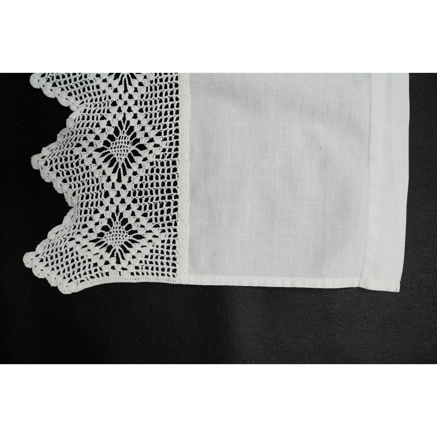 Wykonany z białego płótna w które wykończono koronką ręcznie robioną z białej, bawełnianej nitki o ciekawym wzorze z pajączki na dolnej krawędzi. Góra wyposażona w tunelik umożliwiający zawieszenie na drążku.