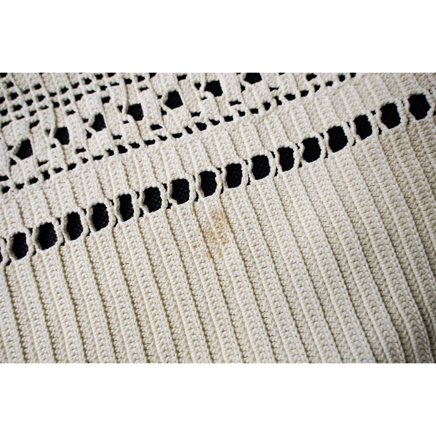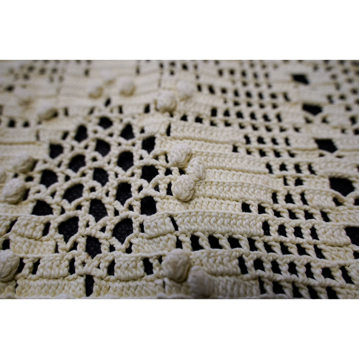 Nitka w kolorze waniliowym , bawełniana, mięsista, dość gruba. Wzór bardzo ładny z wypukłymi elementami. Boki wykończoną zębami Dokoła wykończony zębami. Masa pracy, ale efekt jest imponujący!