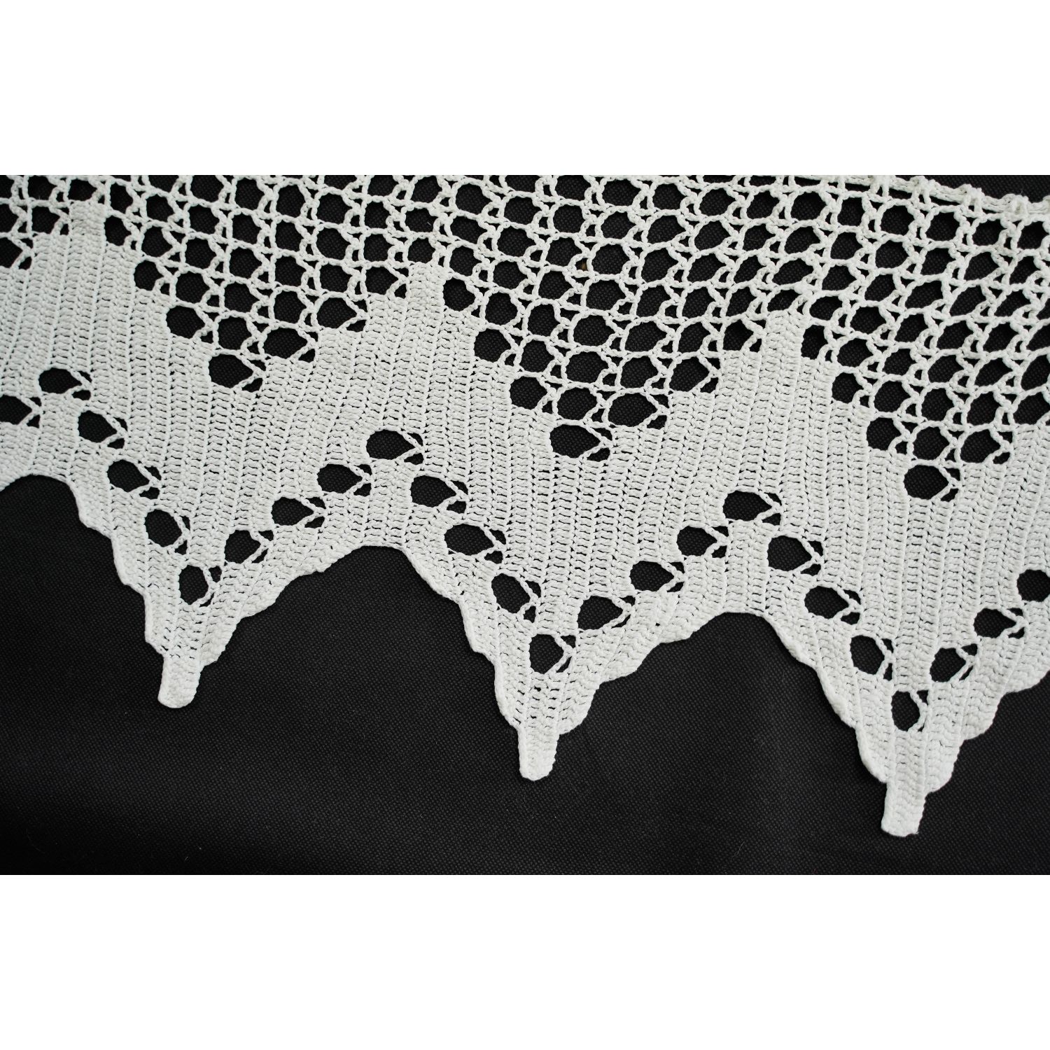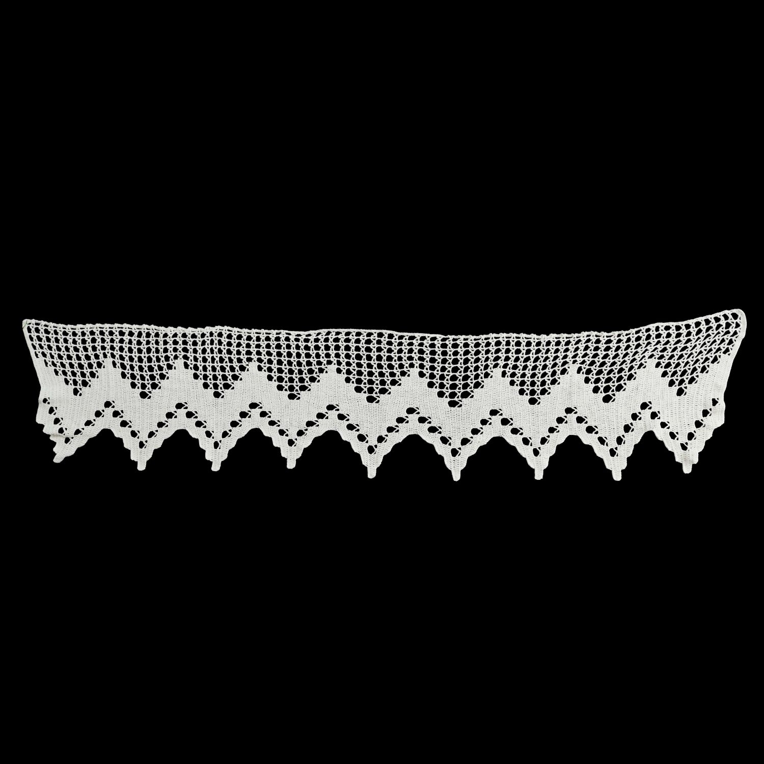 Wykonana ręcznie z białych, bawełnianych nici średniej grubości. Wzór w zygzaki. Dolna krawędź wykończona zębami.