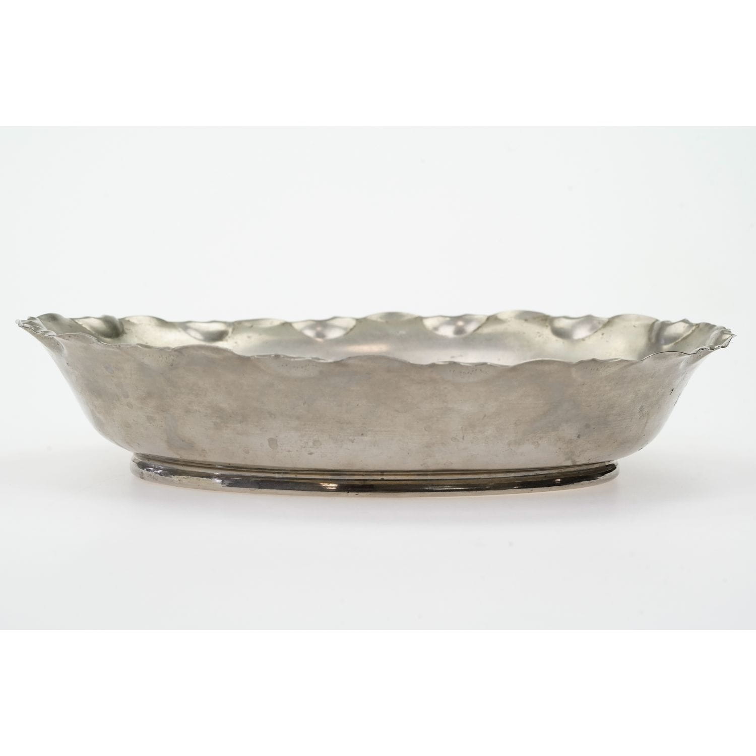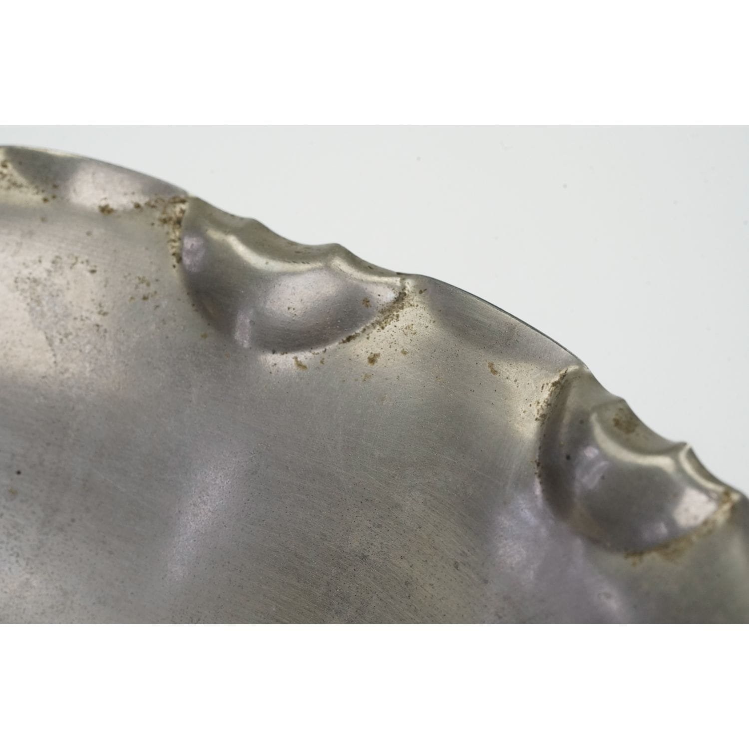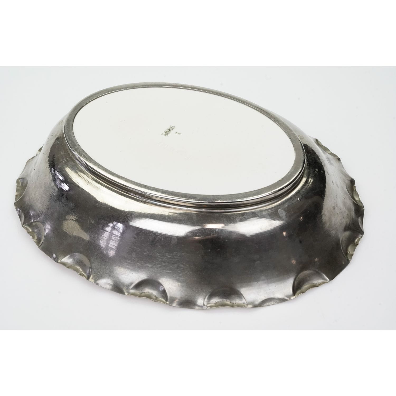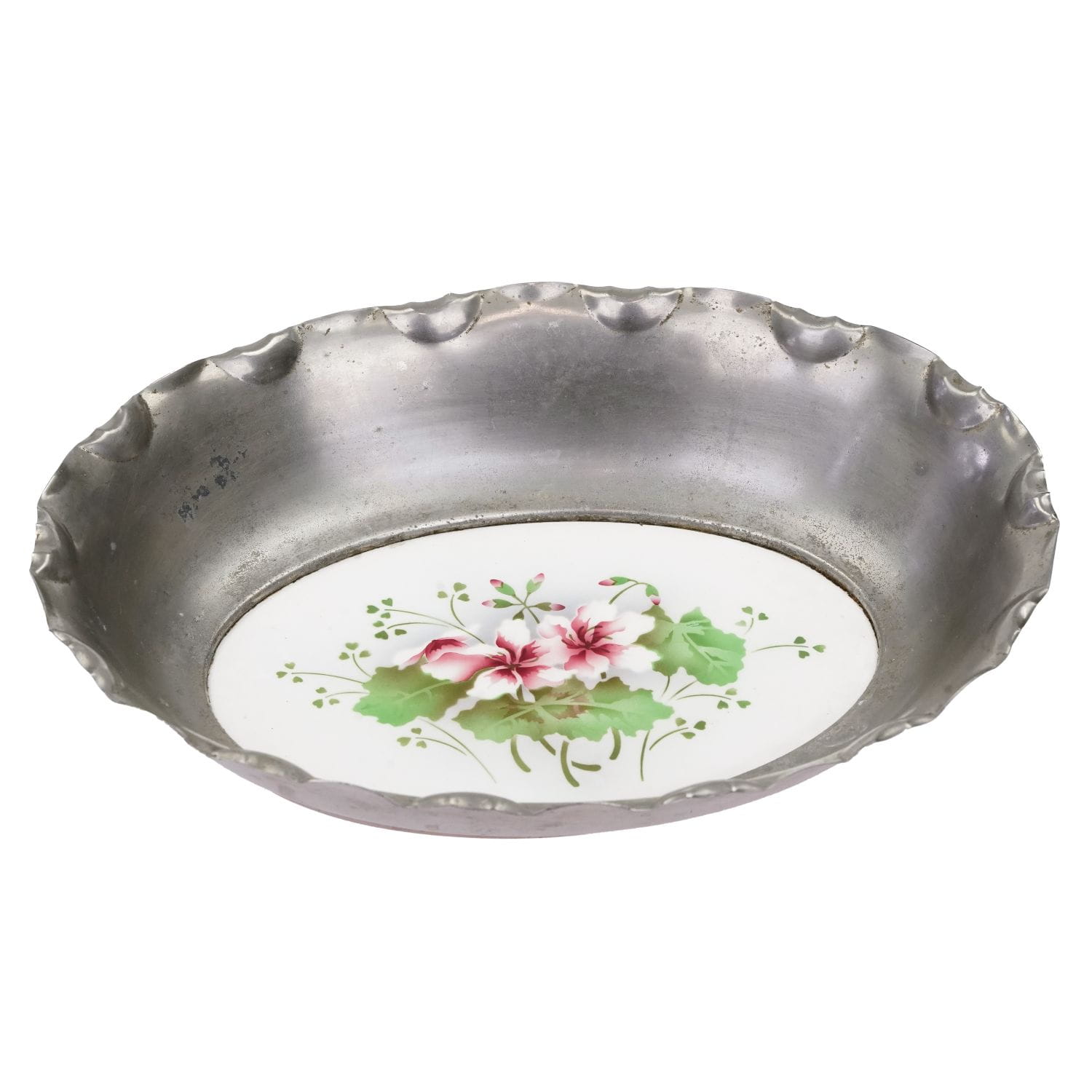 Patera okuta w metal. Dekorowana metodą zwaną spritzdekor, czyli metodą natryskową z użyciem szablonu, niezwykle popularną w latach 20/30 tych. Zdobienia w odcieniu różu i zieleni. Przedstawiają bukiet kwiatów, pelargonii. Ceramiczny wkład w dobrym stanie, z ryskami użytkowymi. Metalowa rama z naturalną patyną, osadem