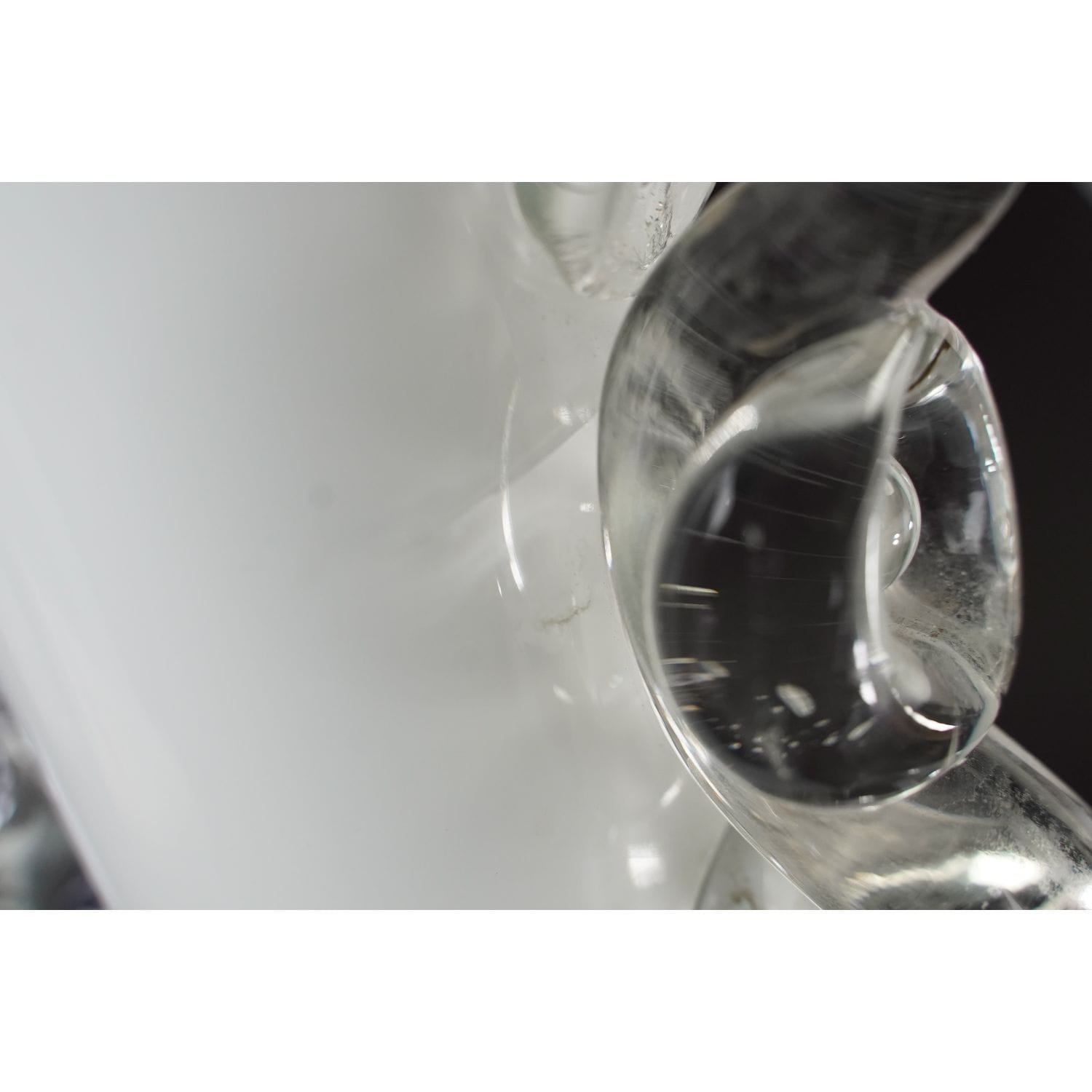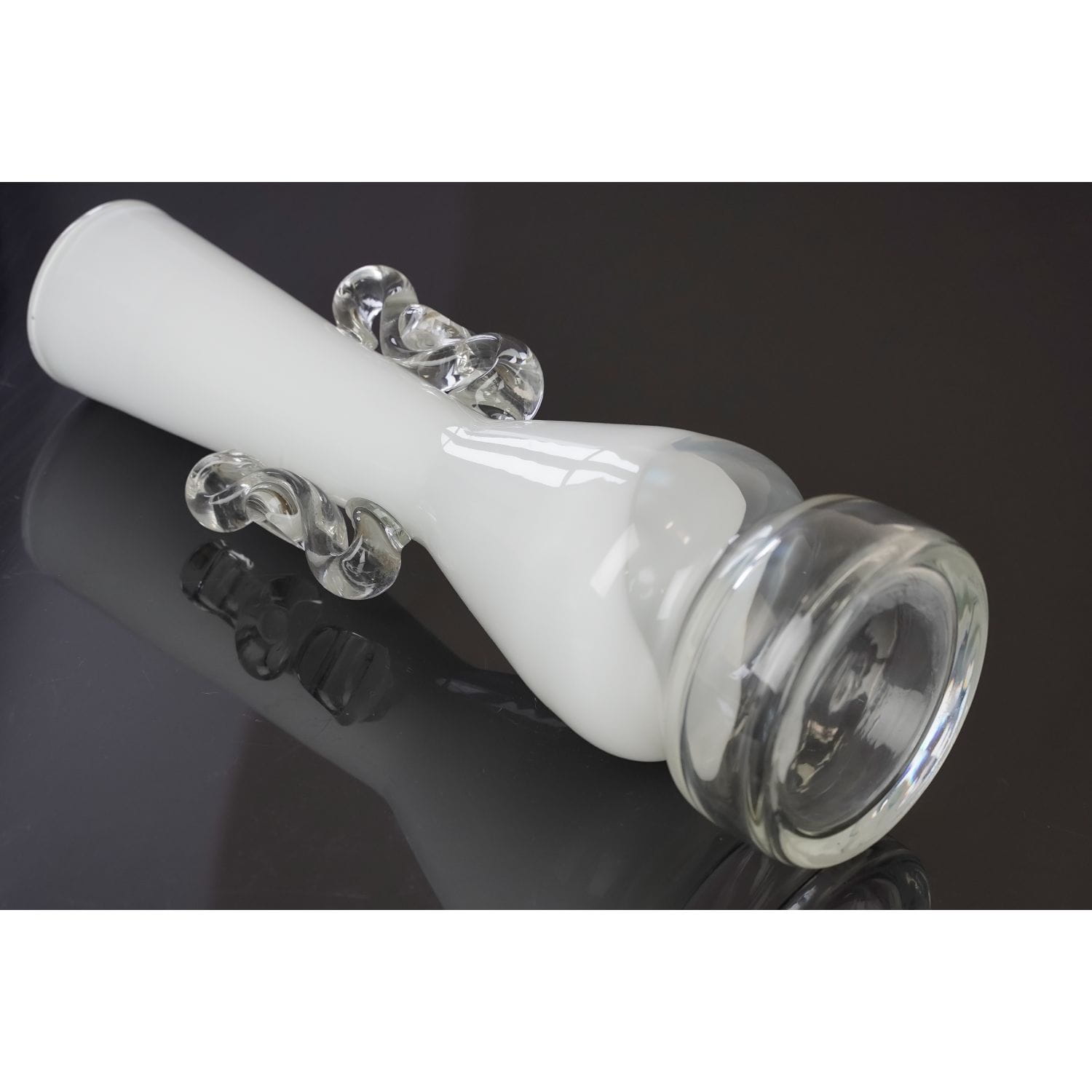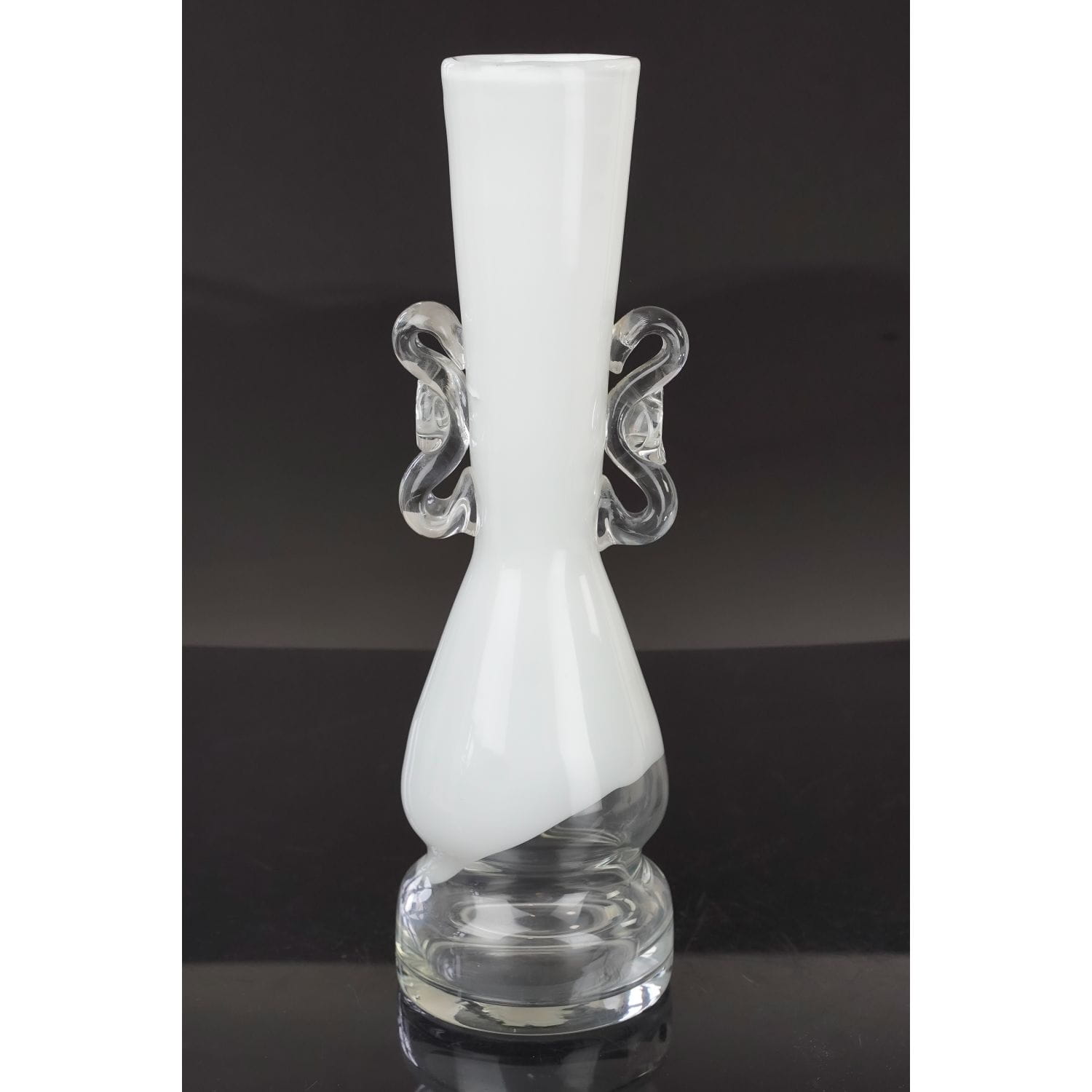 Wazon ręcznie formowany z lat 80-tych. Autorem projektu jest najprawdopodobniej Jerzy Słuczan-Orkusz. Wykonany w Hucie szła Tarnowiec. Szkło sodowe barwione w masie na kolor biali, podstawa bezbarwna i wygląda jak zanurzona w mlecznej polewie. Kształt ciekawy, smukły z wcięciem w w dolnej partii na bezbarwnej podstawie. Szyja dość wąska, stopniowo rozchylająca się ku górze. Z obu stron bezbarwne ozdobne, zabawnie wywinięte nakładki.
