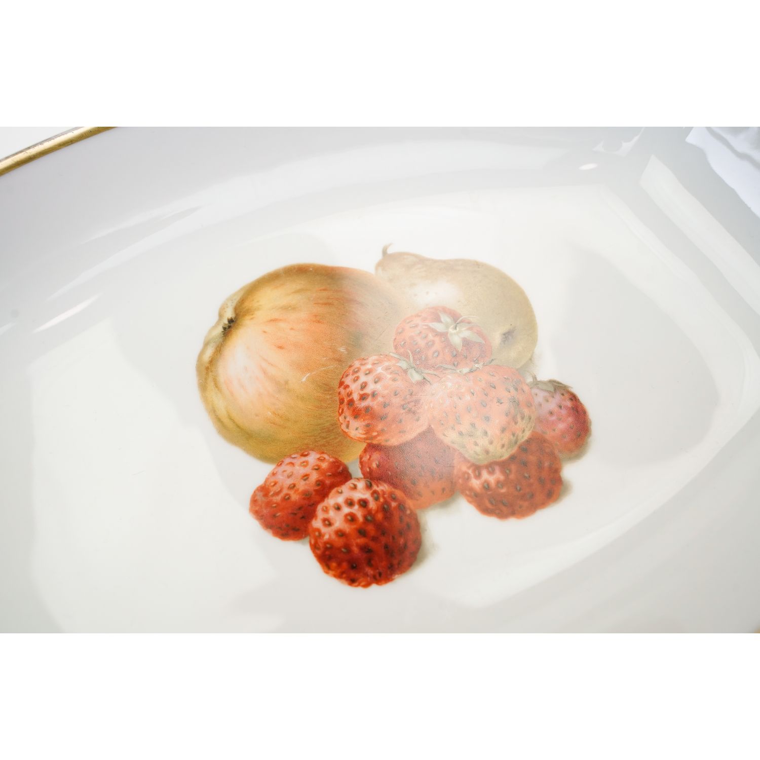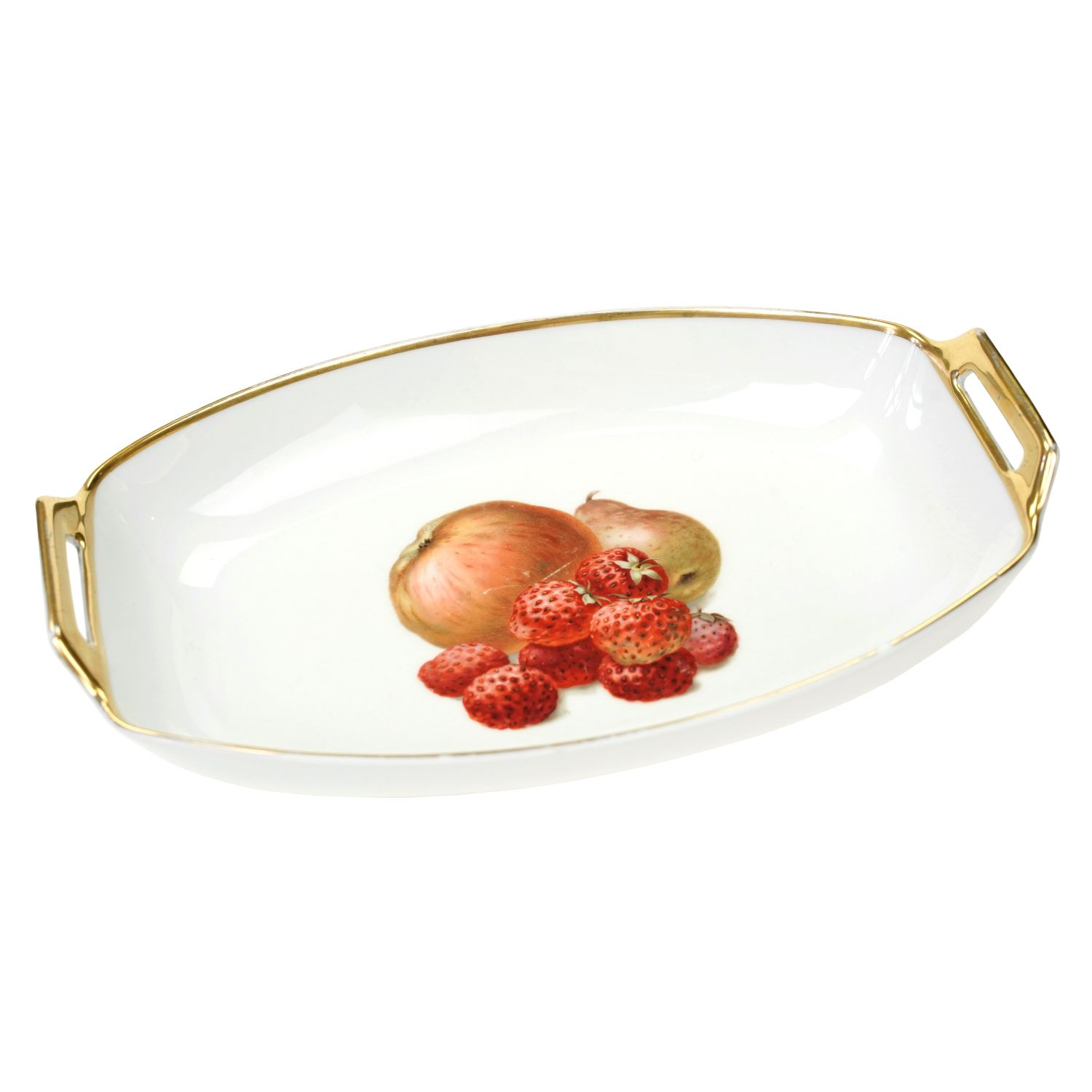 Patera wykonana z porcelany w kolorze białym, cudownie zdobiona wielobarwną, realistyczną kalkomanią, przedstawiającą różne owoce; jabłko, gruszka i truskawki. Ładnie wyprofilowane uszy, rant złocony.