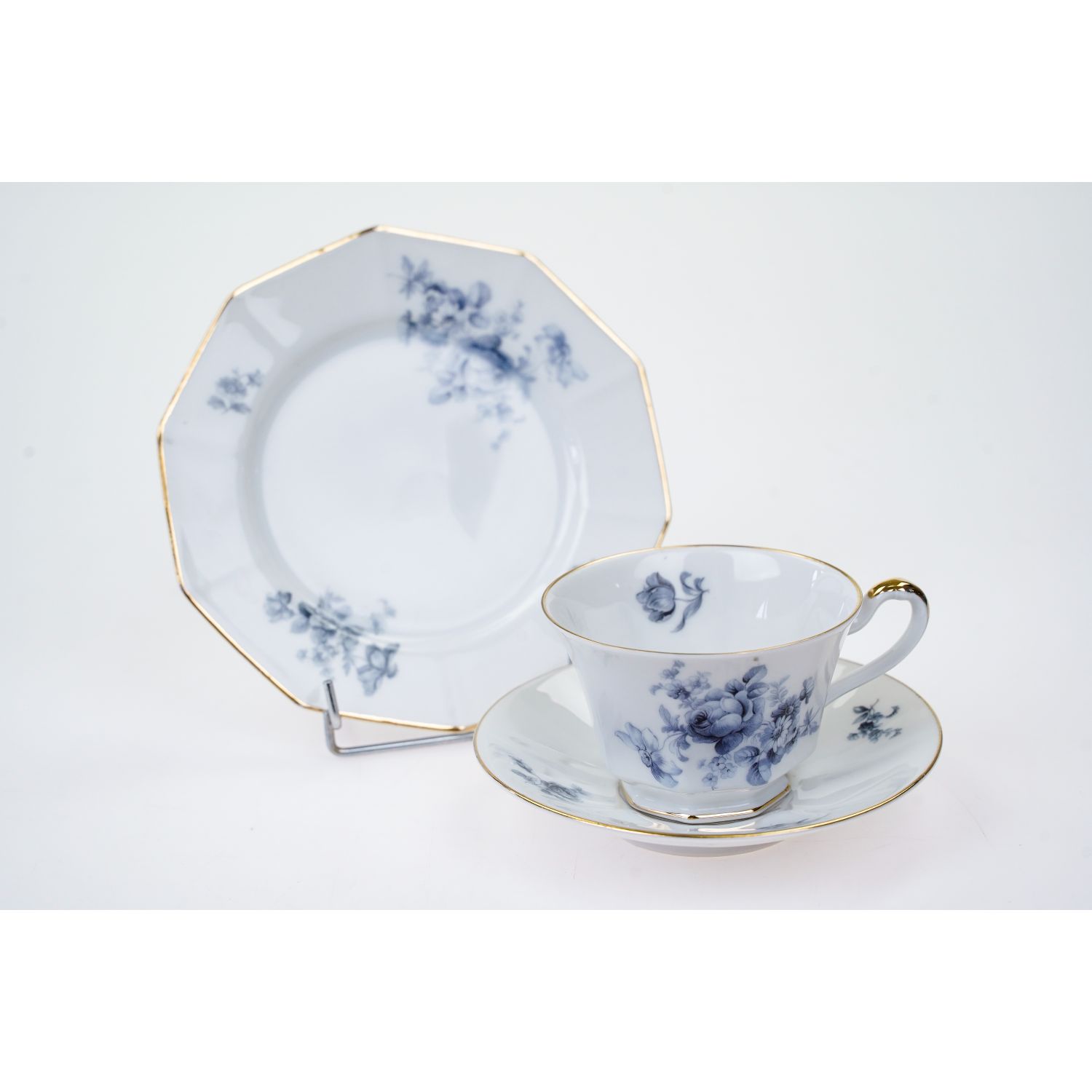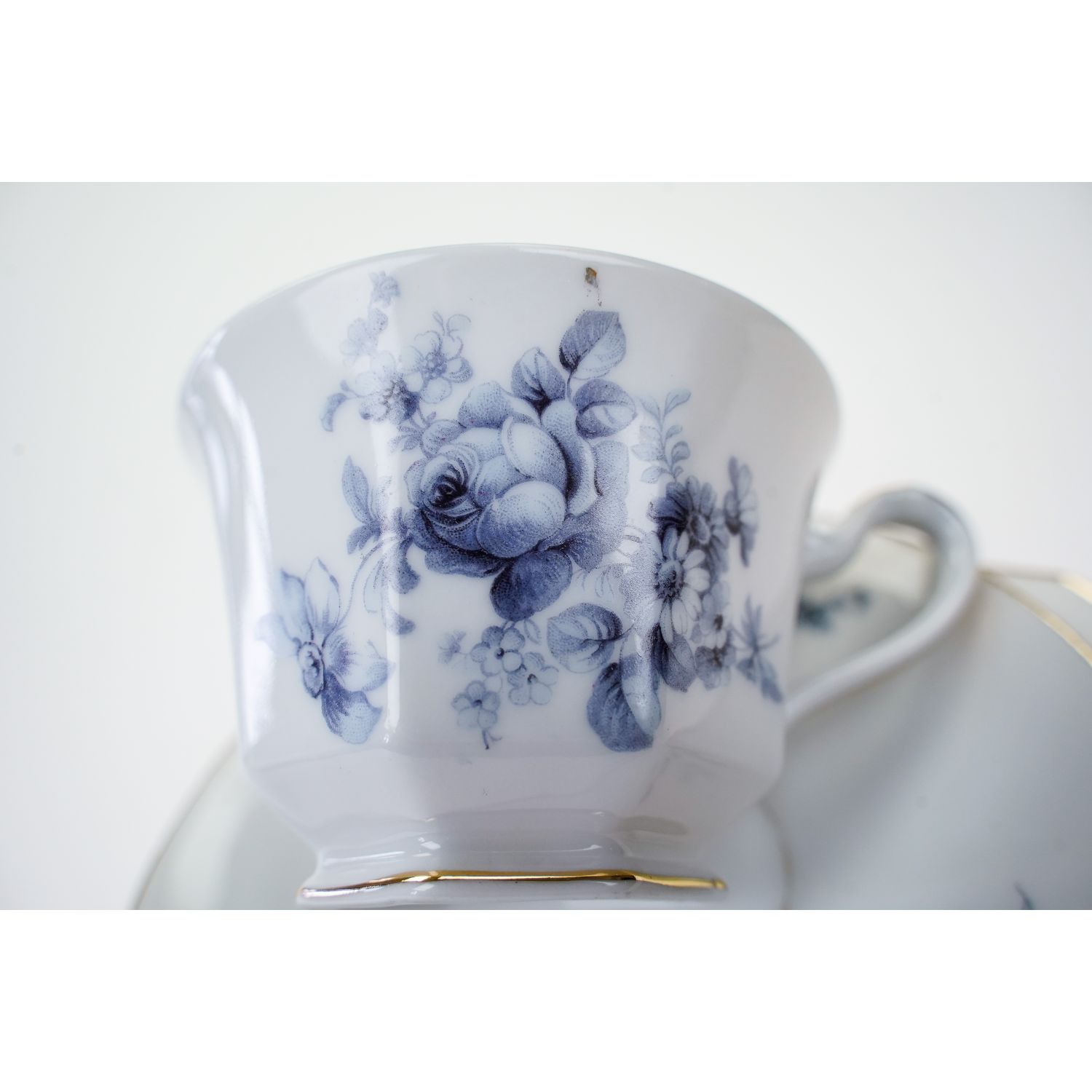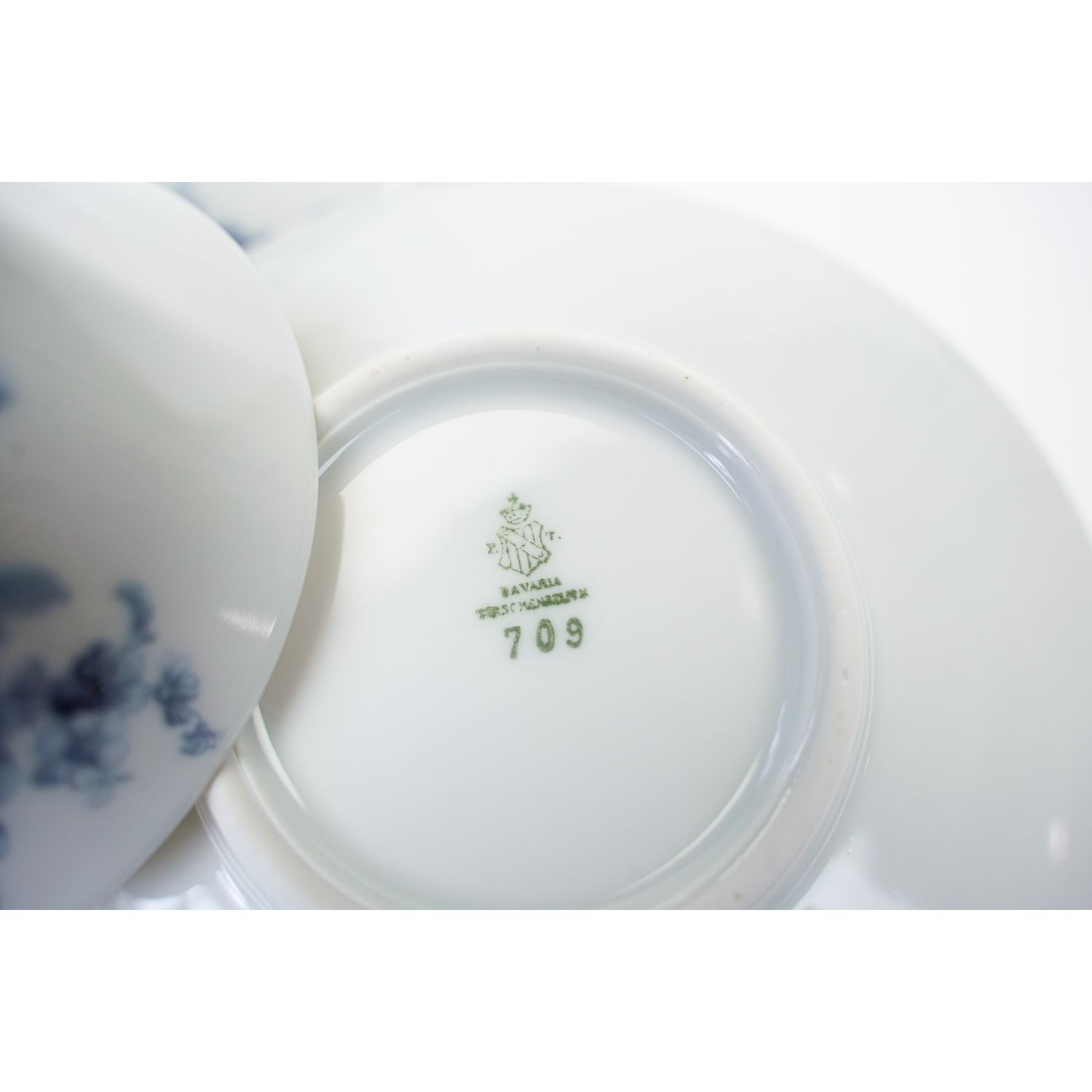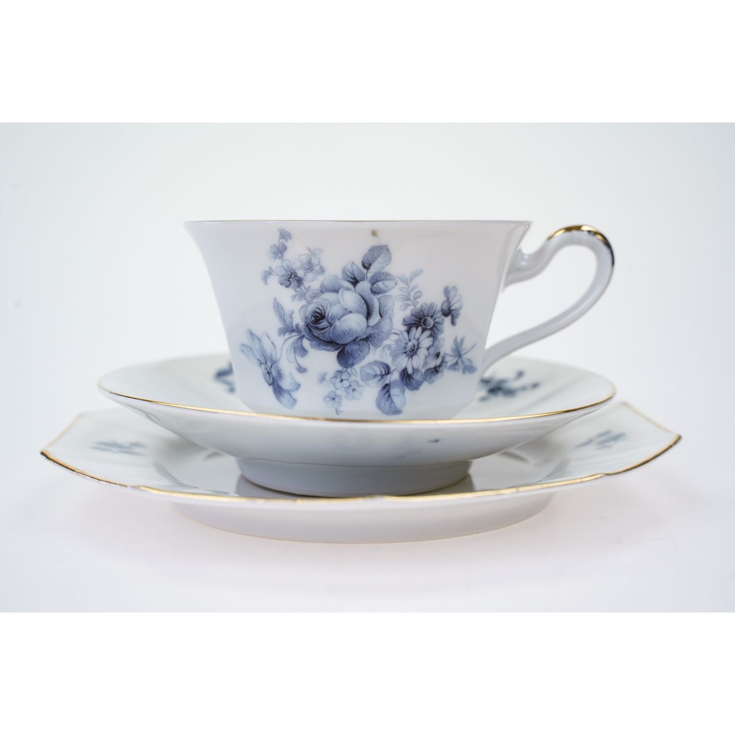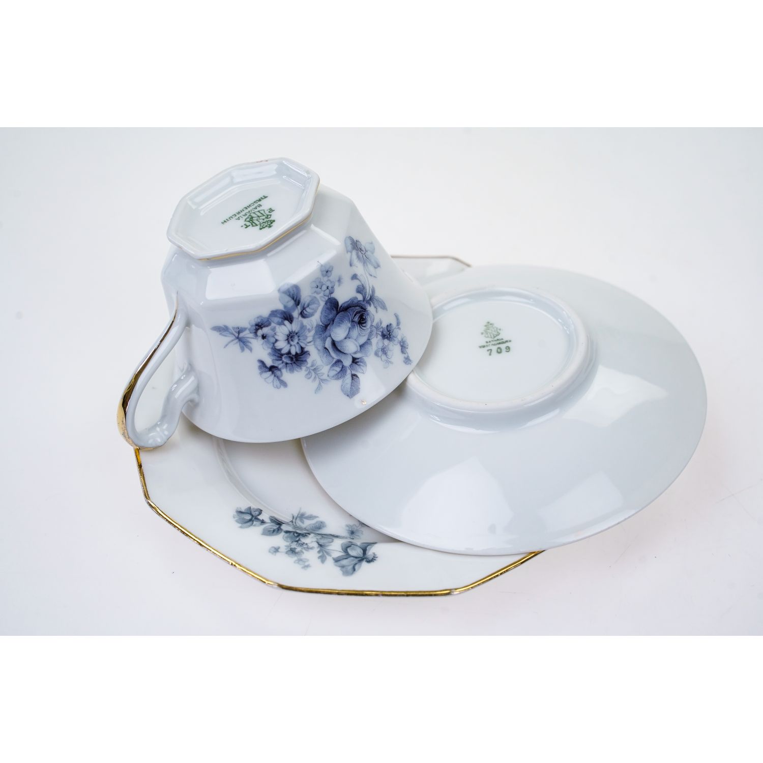 Pochodzi z wytwórni z Tirschenreuth (Porzellanfabrik Tirschenreuth), sygnowany znakiem stosowanym w latach 20/30-tych XX wieku. Niebanalny zestaw śniadaniowy, wykonany z porcelany w odcieniu bieli. Wszystkie elementy mają wielokątny kształt. Filiżanka osadzona na stopie. Ranty i uszko w złotych konturówkach. Na każdym elemencie błękitne kwiaty.