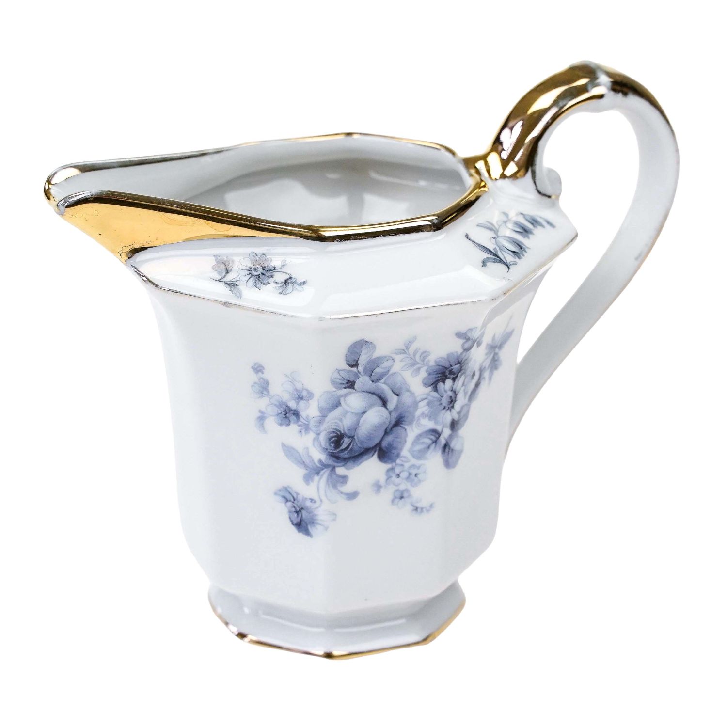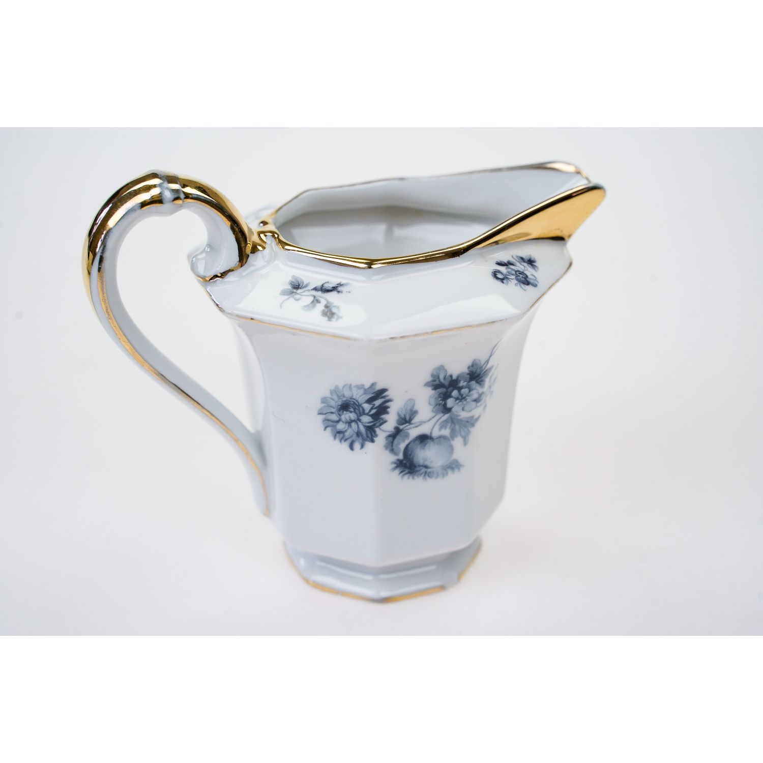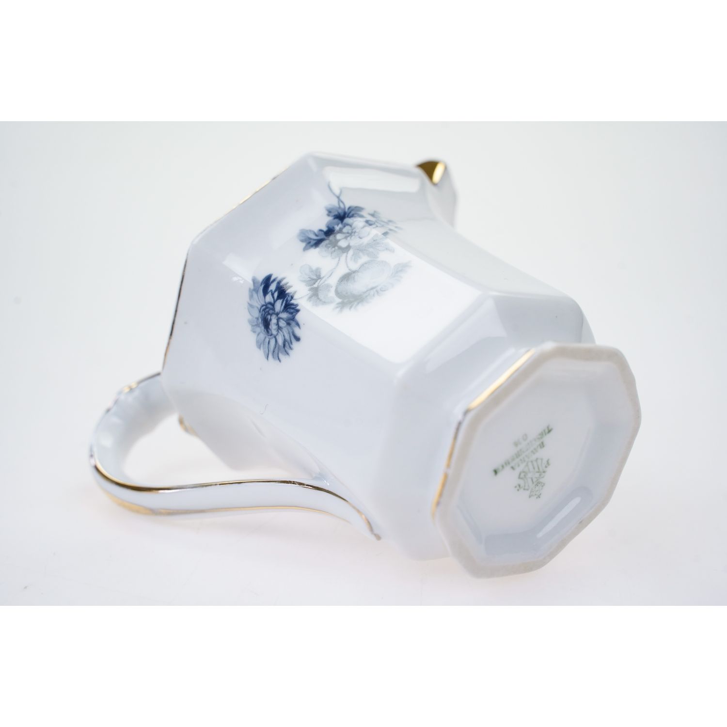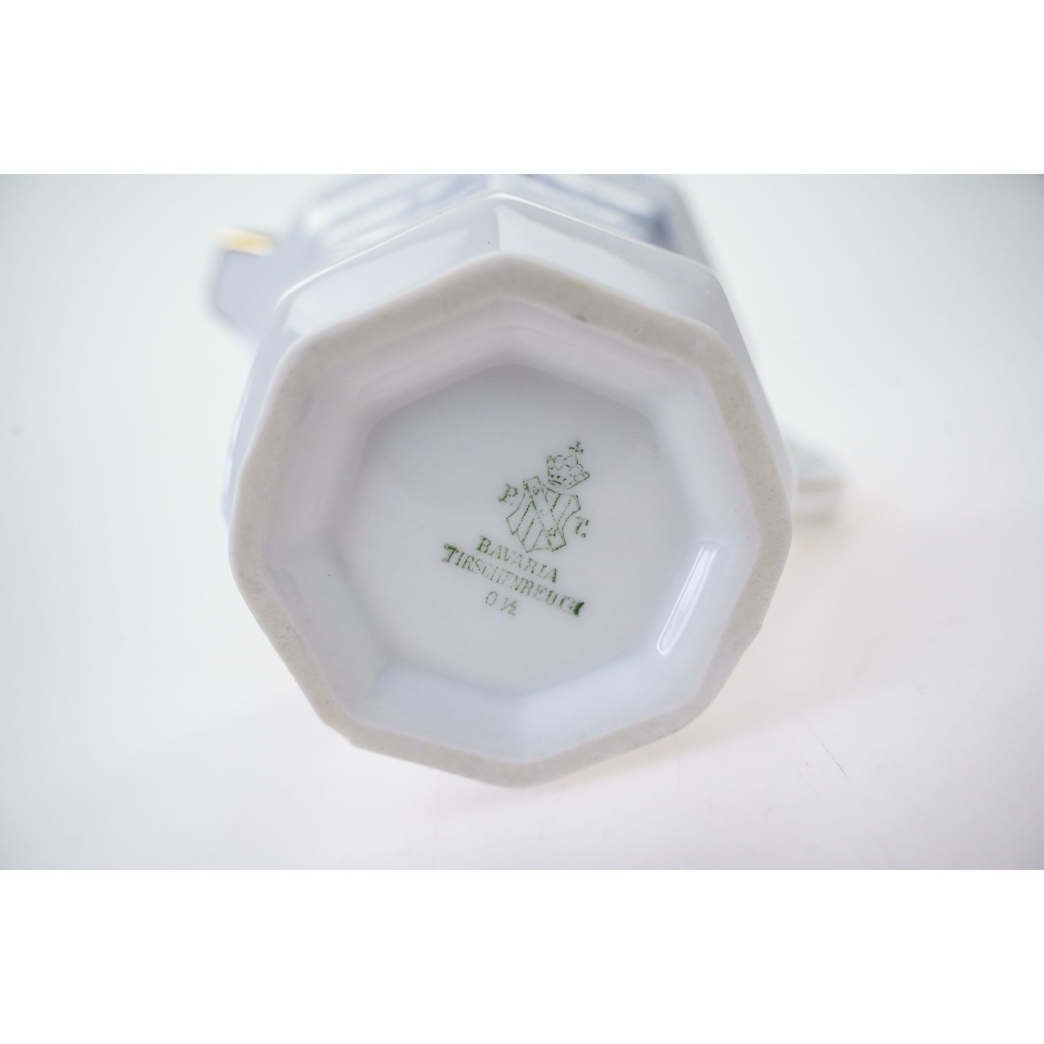 Pochodzi z wytwórni z Tirschenreuth (Porzellanfabrik Tirschenreuth), sygnowany znakiem stosowanym w latach 20/30-tych XX wieku. Niebanalny, wykonany z porcelany w odcieniu bieli. Ma wielokątny kształt. Osadzony na stopie. Ranty i uszko w złotych konturówkach. Na porcelanie błękitne kwiaty.