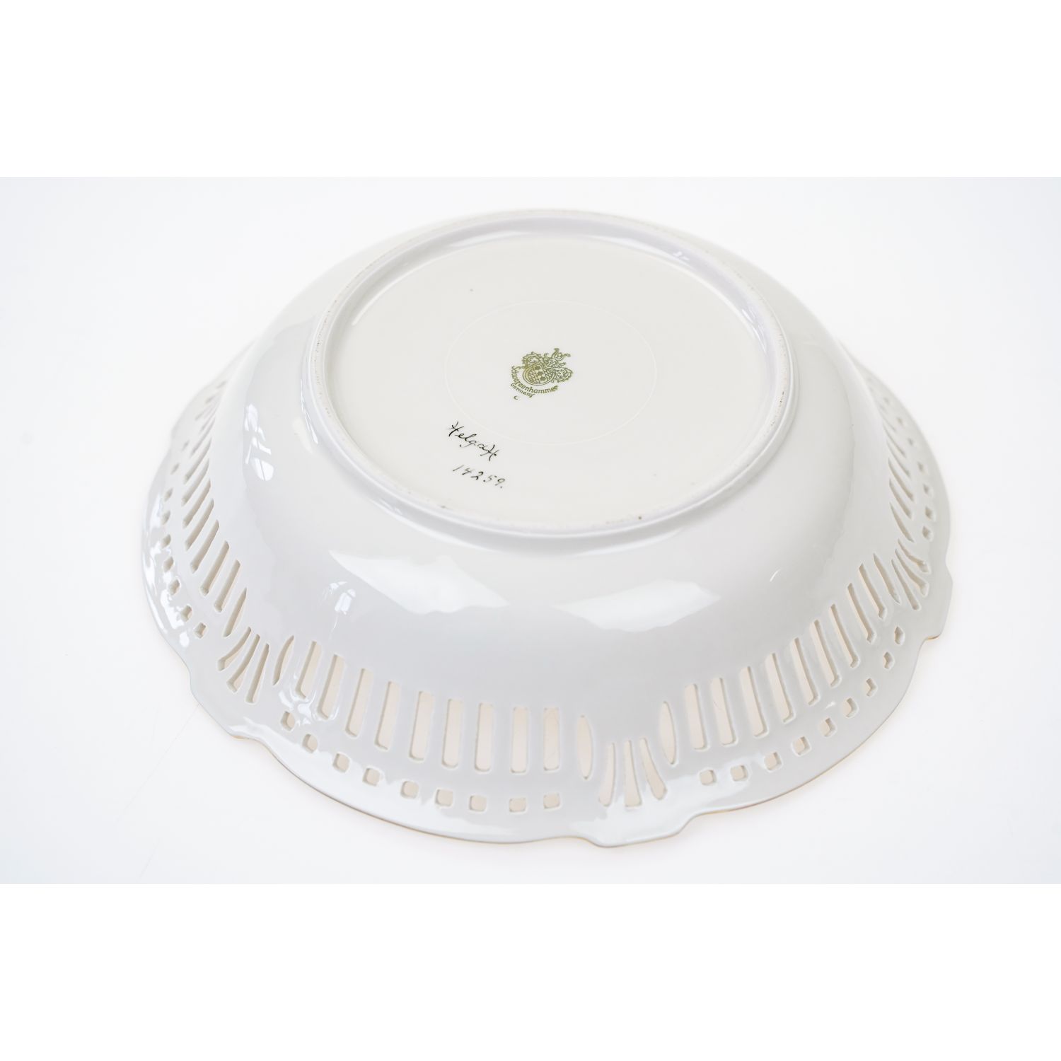 Pochodzi z Bawarii z Tirschenreuth z Porzellanfabrik Tirschenreuth. Sygnowana znakiem stosowanym od 1969 roku. Śliczna, delikatna porcelana w kolorze szlachetnej kości słoniowej. Kontury, stercznka i uszka w złoceniu. Wygląda zjawiskowo i szykownie.
