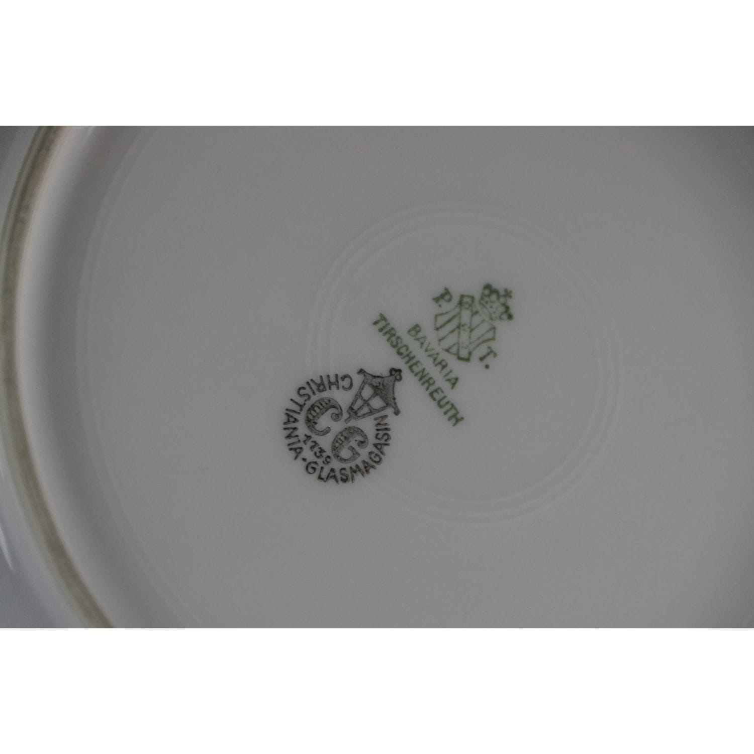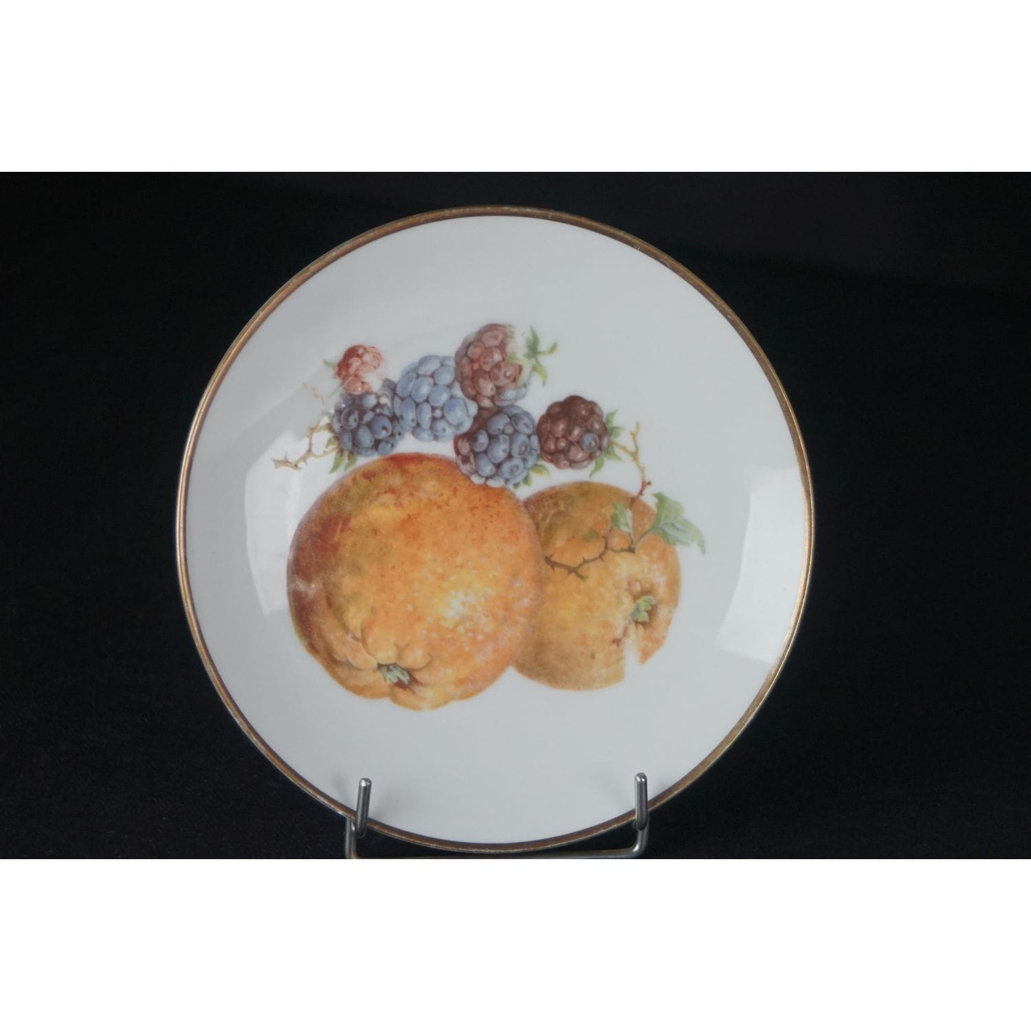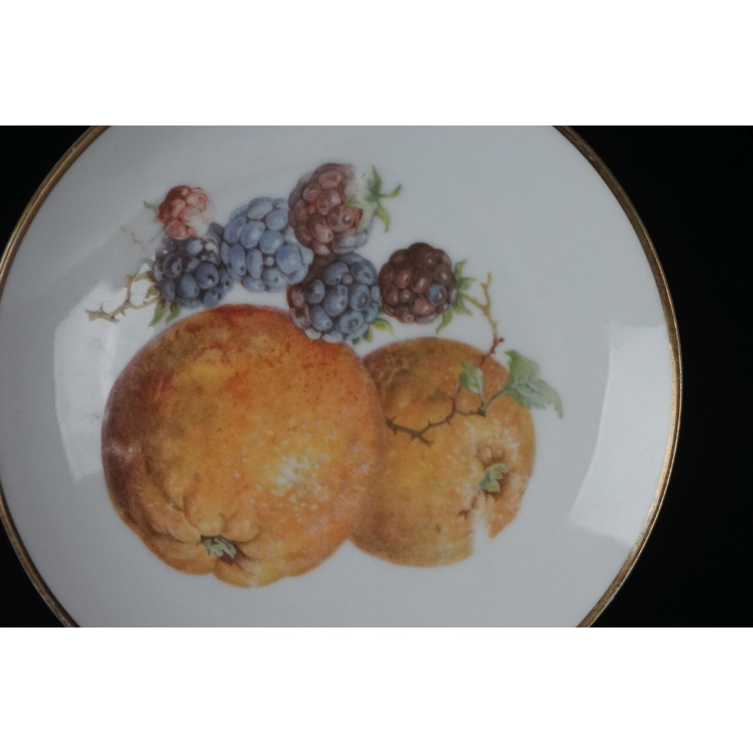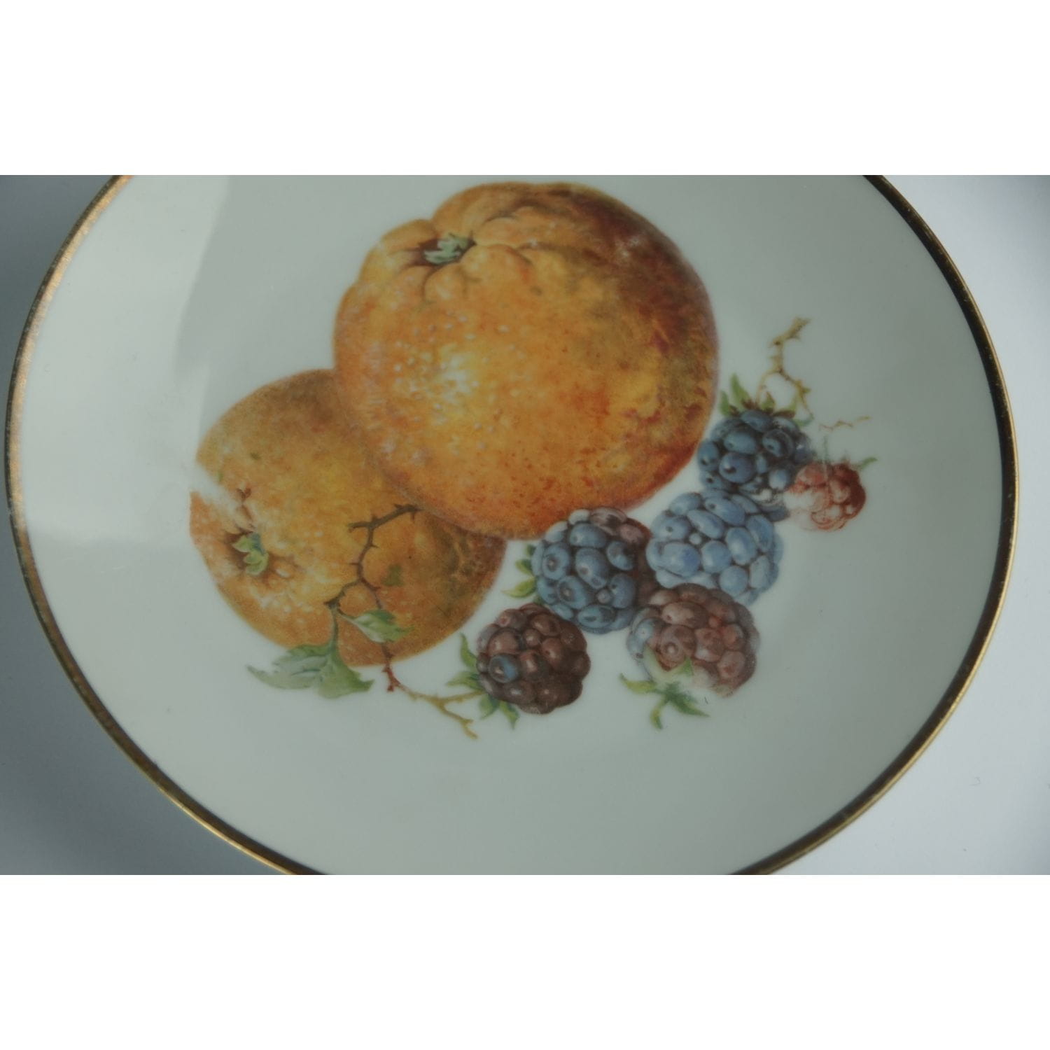 Pochodzi z Bawarii z Tirschenteuth z Porzellanfabrik Tirschenreuth- Hutschenreuther / Selb. Sygnowany znakiem stosowanym po 1927 roku. Porcelana w odcieniu bieli. Rant w złoceniach, które są już trochę przetarte. Na lustrze naczynia duże, owocowe dekoracje przedstawiające pomarańcze i jeżyny.