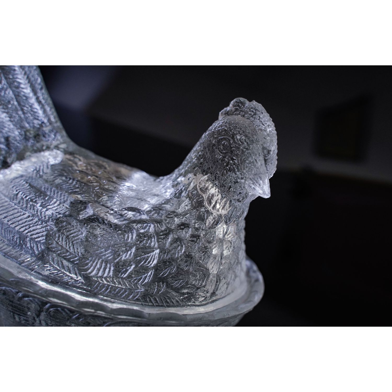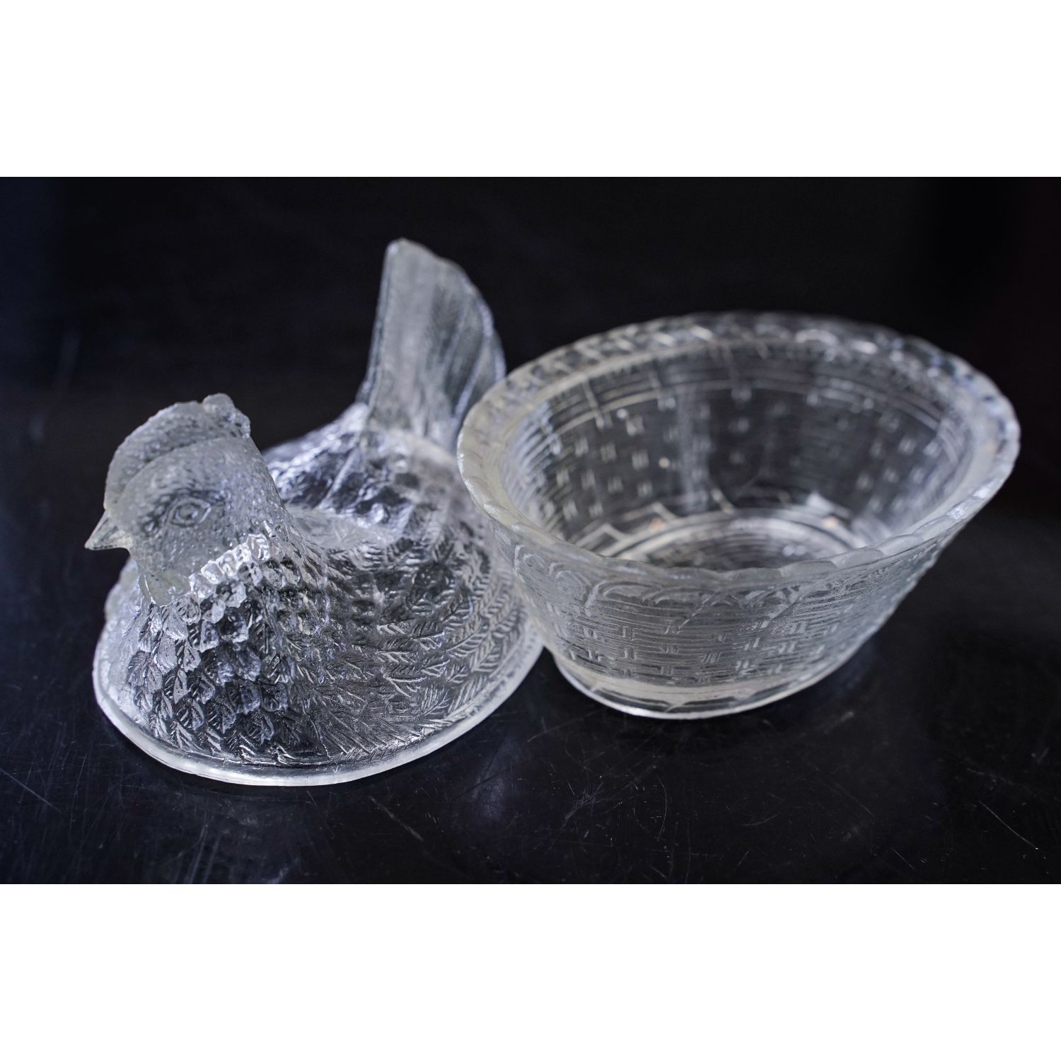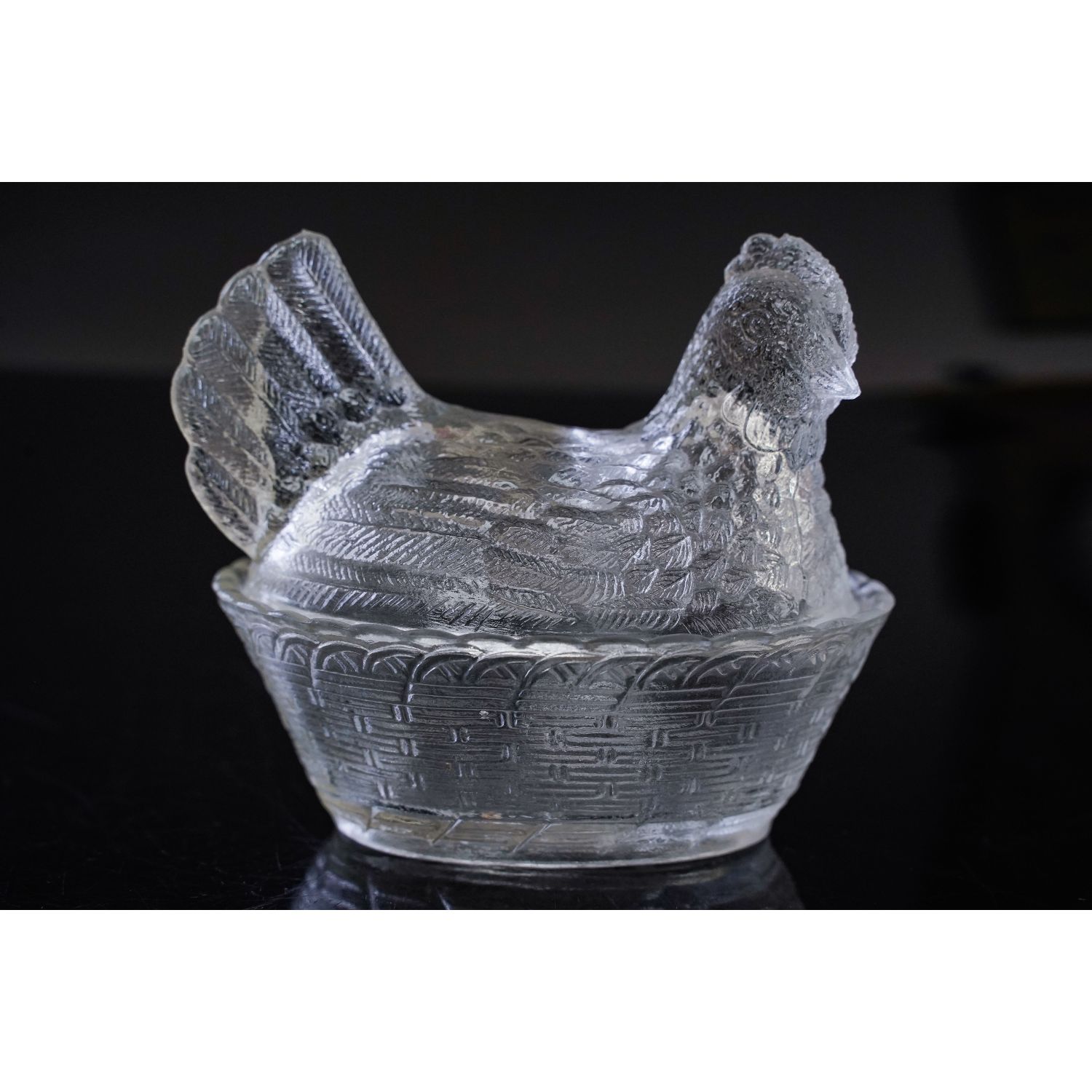 Pochodzi z którejś z polskich hut szkła (ma XXX od spodu, ale nie ma jaj). Szkło prasowane, bezbarwne. Dolna część ima tłoczenia imitujące plecionkę wiklinowego kosza. Górna część ma formę kury, którą osadza się na koszu.