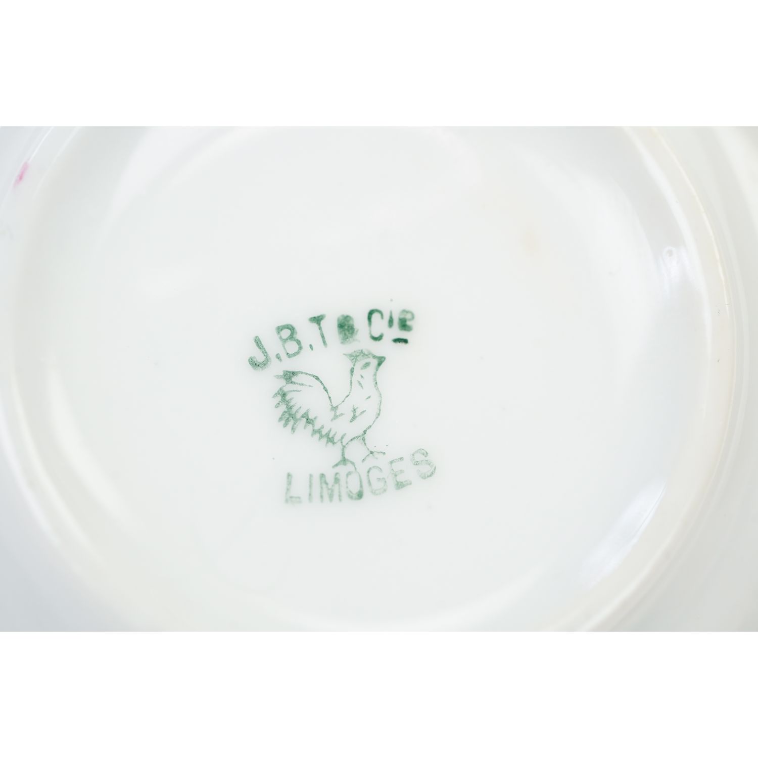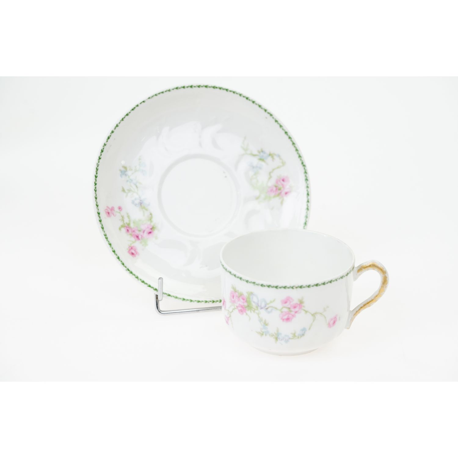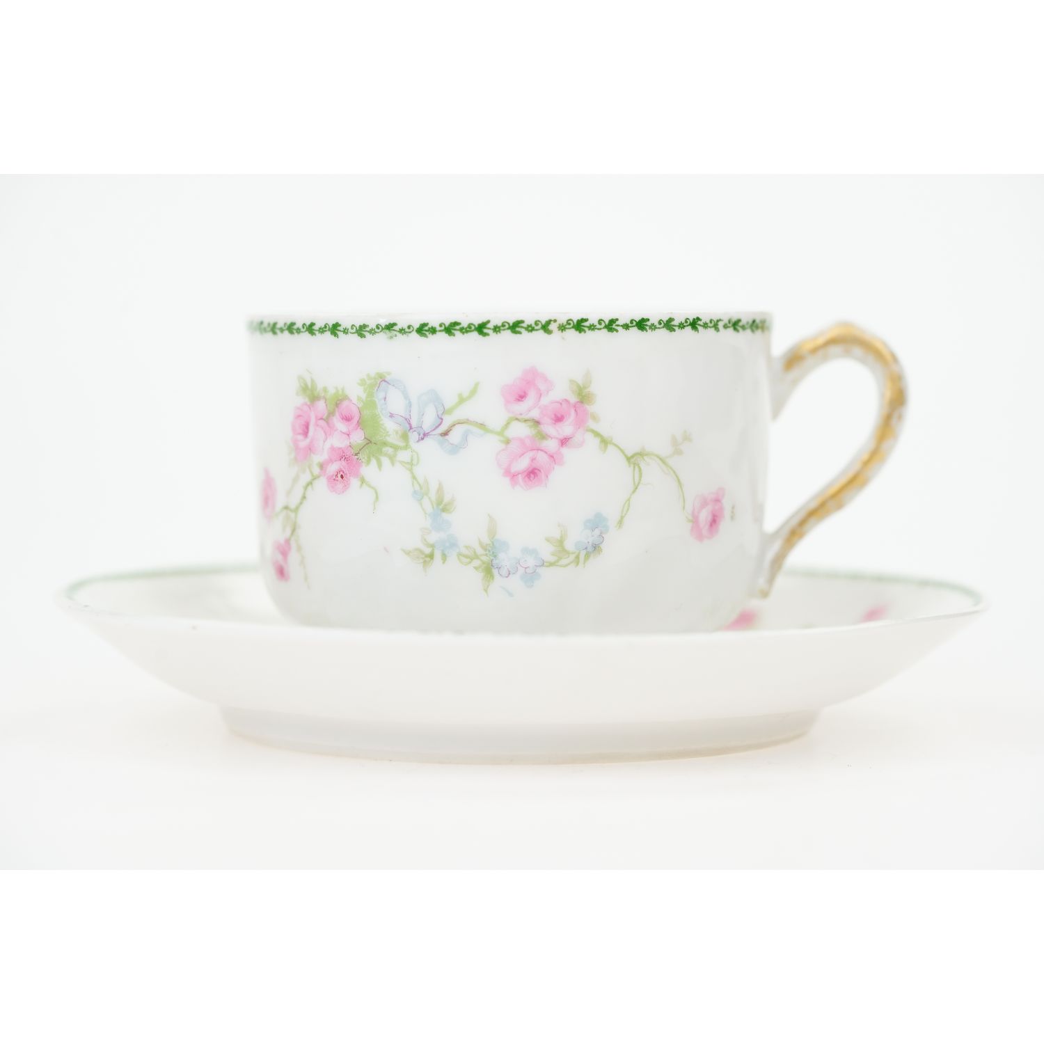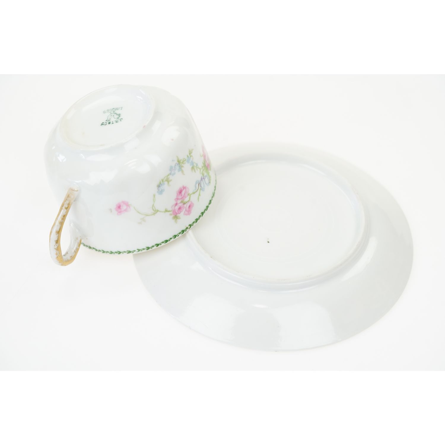 Pochodzi z Limoges z wytwórni Touze, Lemaître Frères & Blancher. Sygnowany znakiem stosowanym od 1920 do 1930 roku. Znak tylko na filiżance. Porcelana w odcieniu bieli. Na porcelanie ciekawe reliefy i bukiety różyczek upięte błękitnymi wstęgami. Przy krawędziach zielone szlaczek laurowych listeczków. Uszy, sterczynki i wlewka w nieregularnym złoceniu.