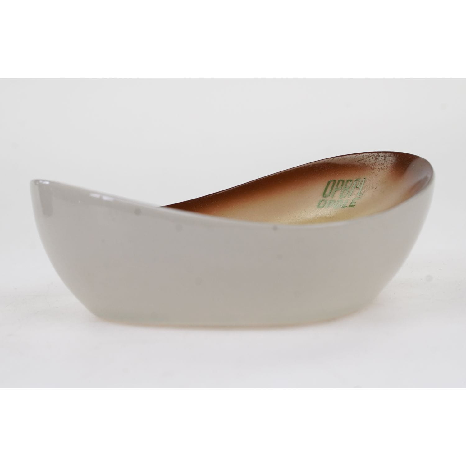 Dekoracja cieniowana od żółtego w środku, ciemniejąca ku krawędziom, opracowana w ośrodku wzorcującym zakładu przez K. Kowalskiego. Do tego zielony reklamowy napis "OPBPL OPOLE".