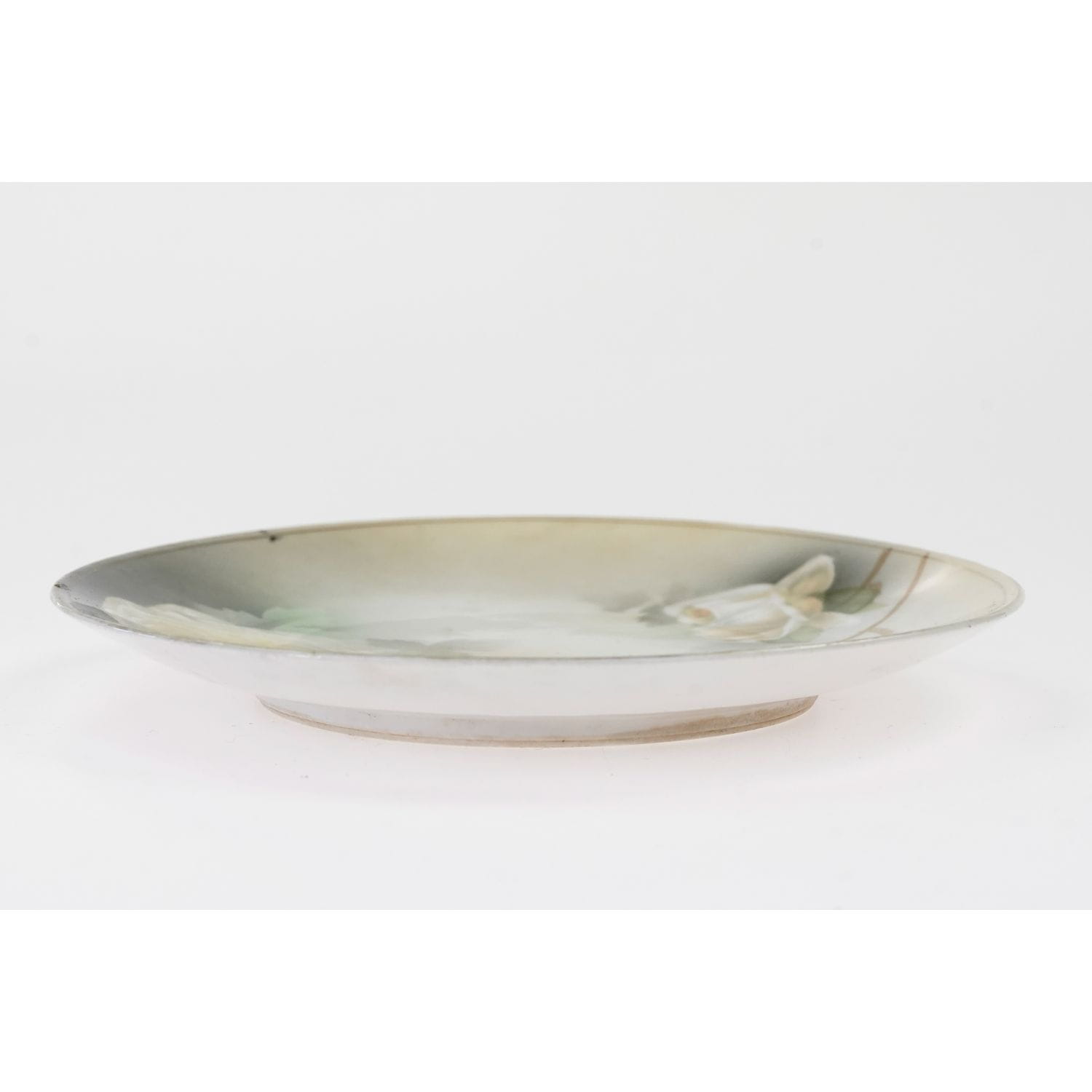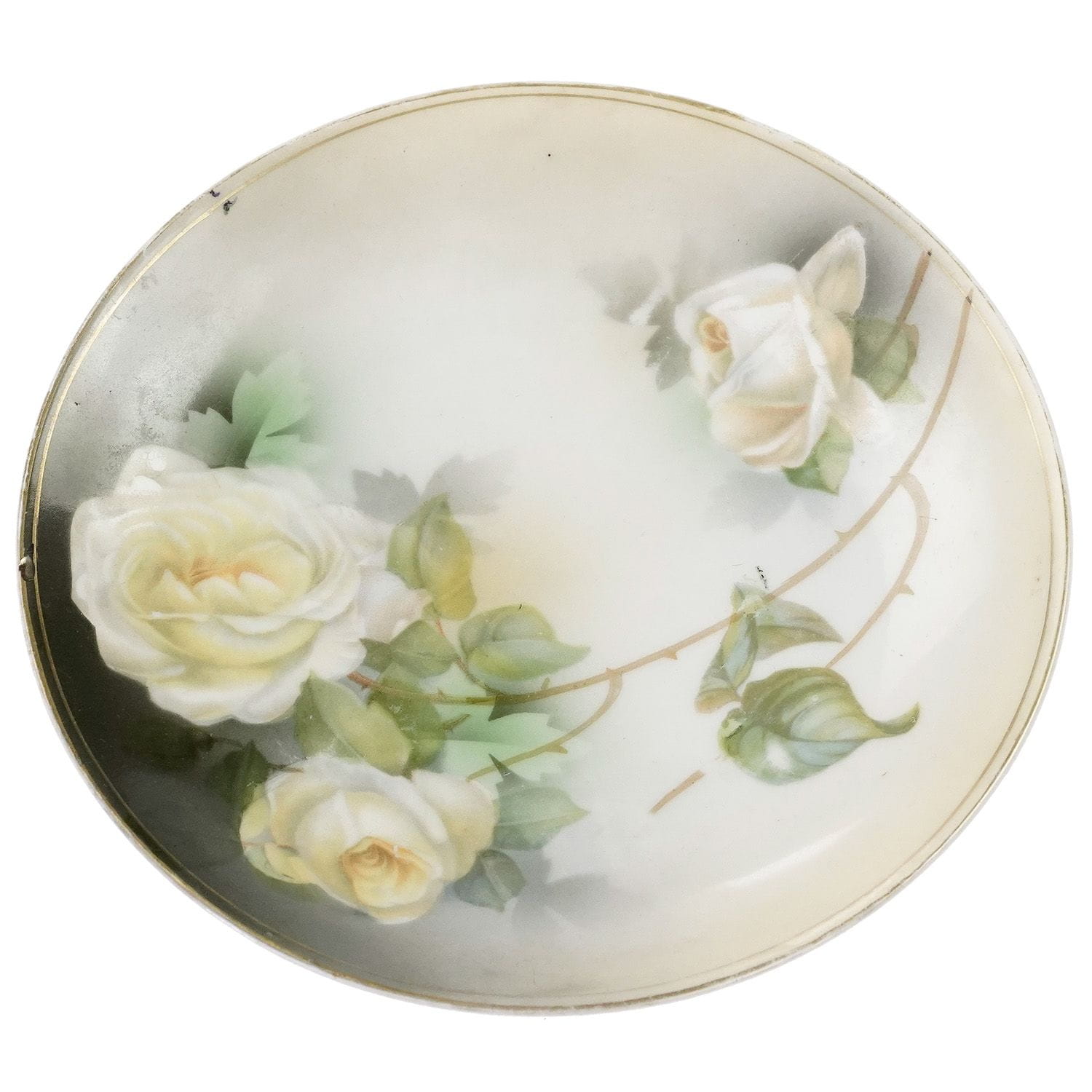 Wykonany z porcelany w odcieniu bieli, lustro pokryte cieniowaną malaturą od niemal kremowego po odcień szarej zieleni. Na tym tle biało-kremowe róże z nakładanymi natryskowo listkami. Rant w złotej konturówce, mocno już przetartej. Na krawędzi mikroskopijny zadziorek pod złoceniem.