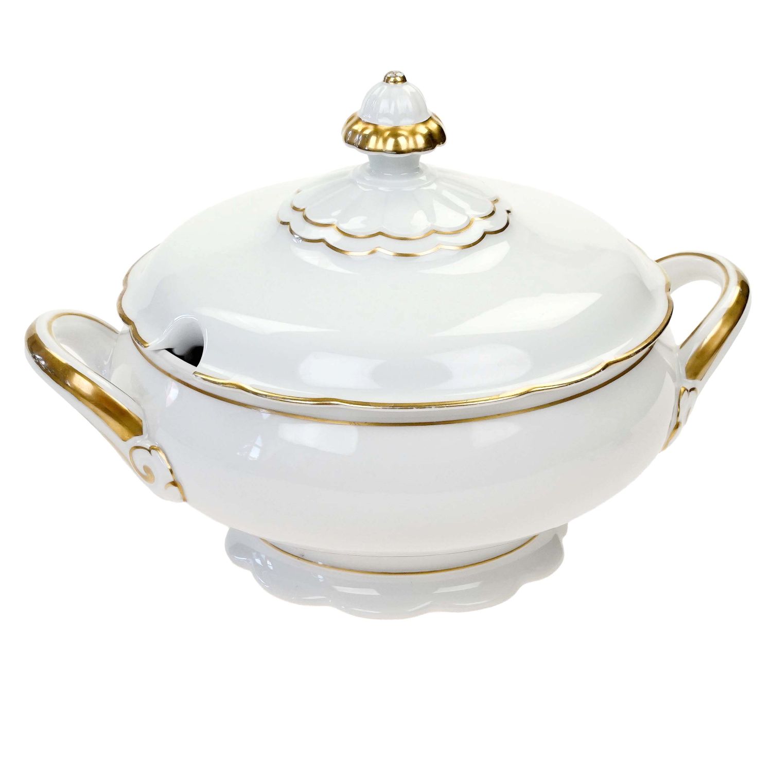 Pochodzi z Bawarii z Ullerstricht z Porzellanfabrik Bavaria AG. Z lat 30/40-tych. Porcelana w kolorze białym o dość prostej formie. Udekorowana bogatymi złoceniami na uszach i sterczynce. Ranty i uszka w złotej konturówce.