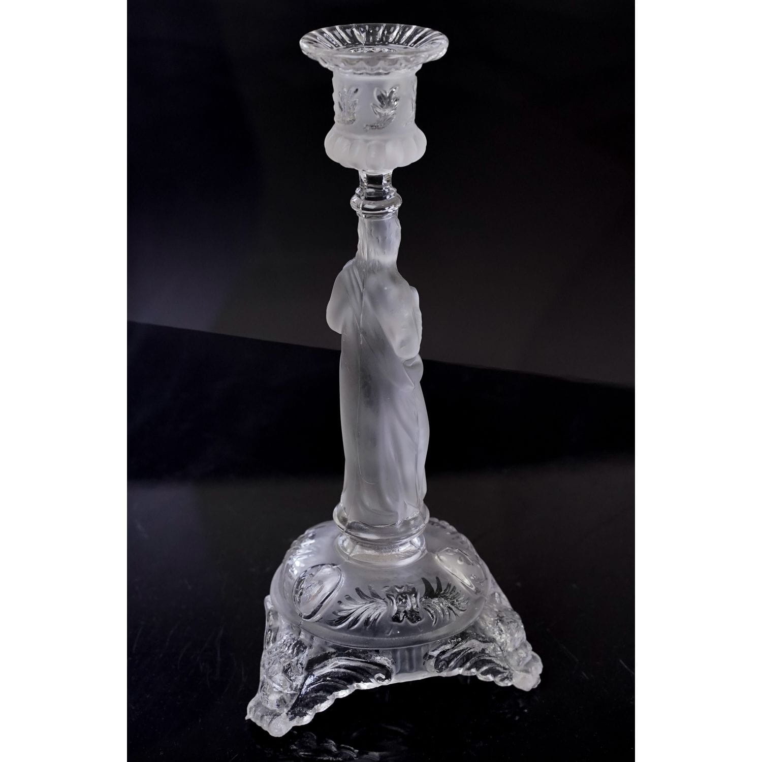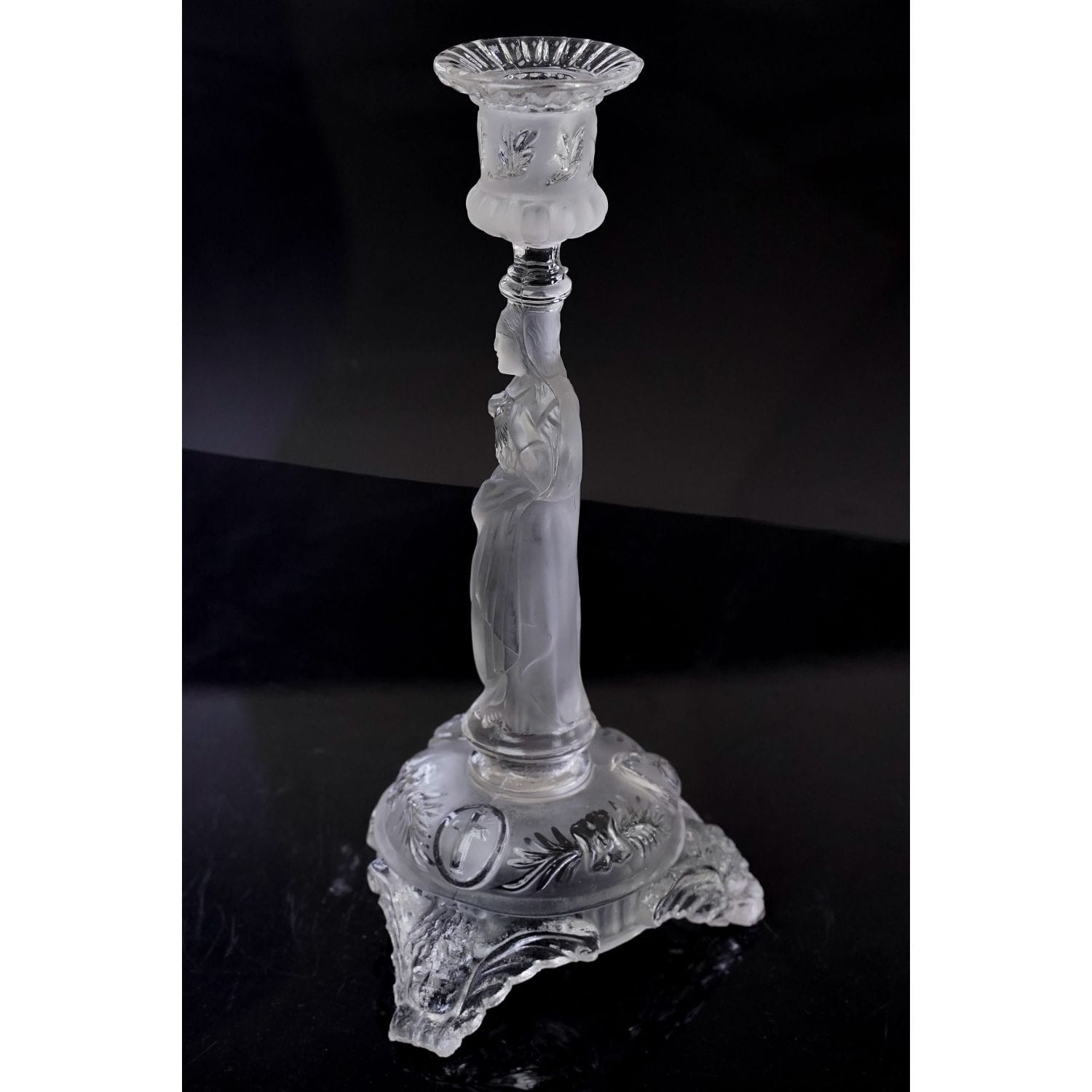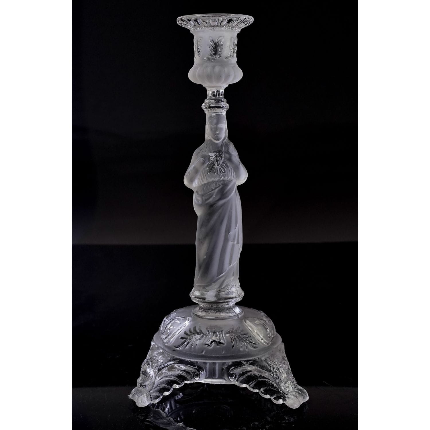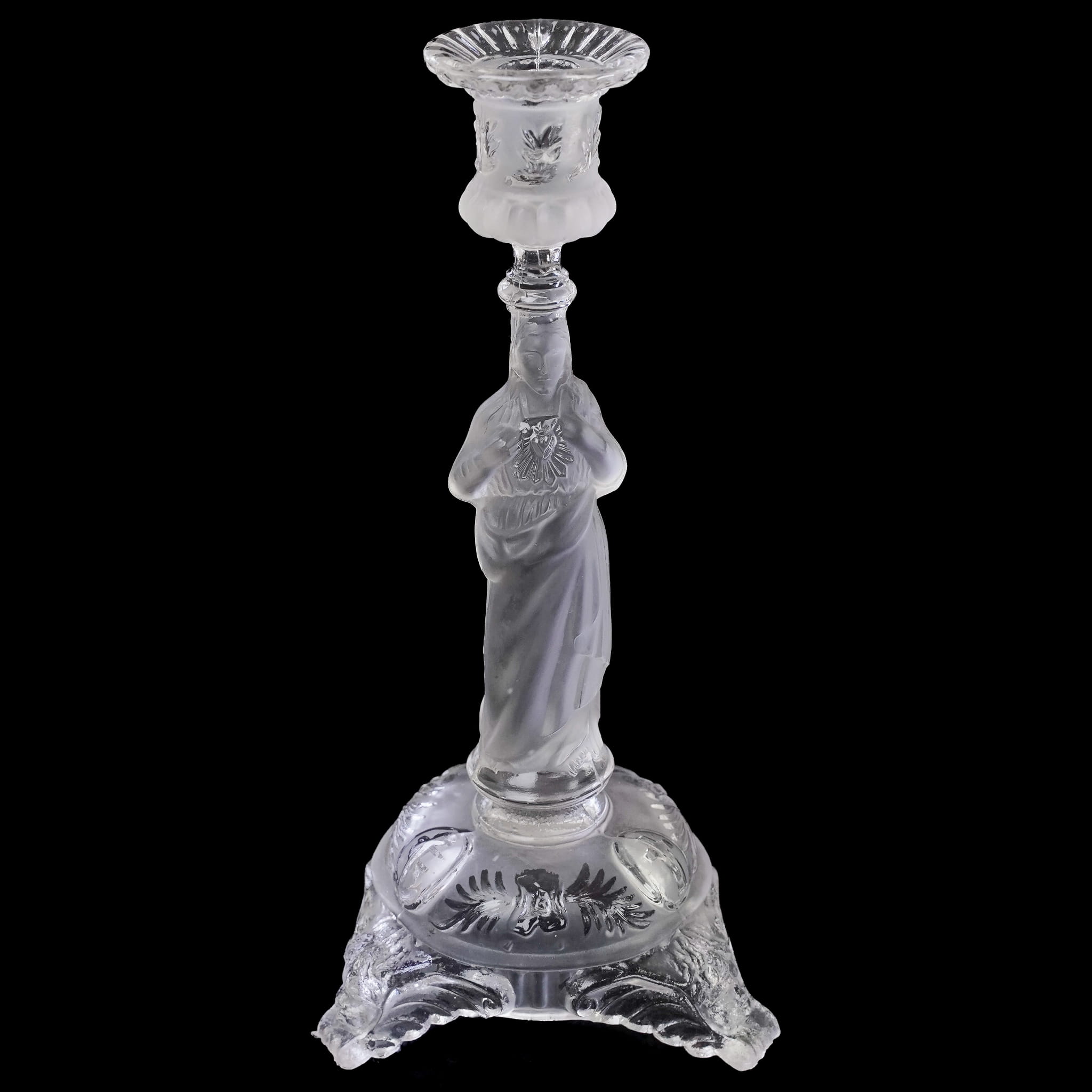 Jezus z Gorejącym Sercem. Pochodzi z Belgii z Val Saint Lambert z 1913 roku. Szkło prasowane, bezbarwne. Postać są z matowego szkła. Zachowany w stylu secesyjnym. Bogato zdobiony tłoczeniami o motywie kwiatowym. Nogi świecznika mają formę głów aniołków.