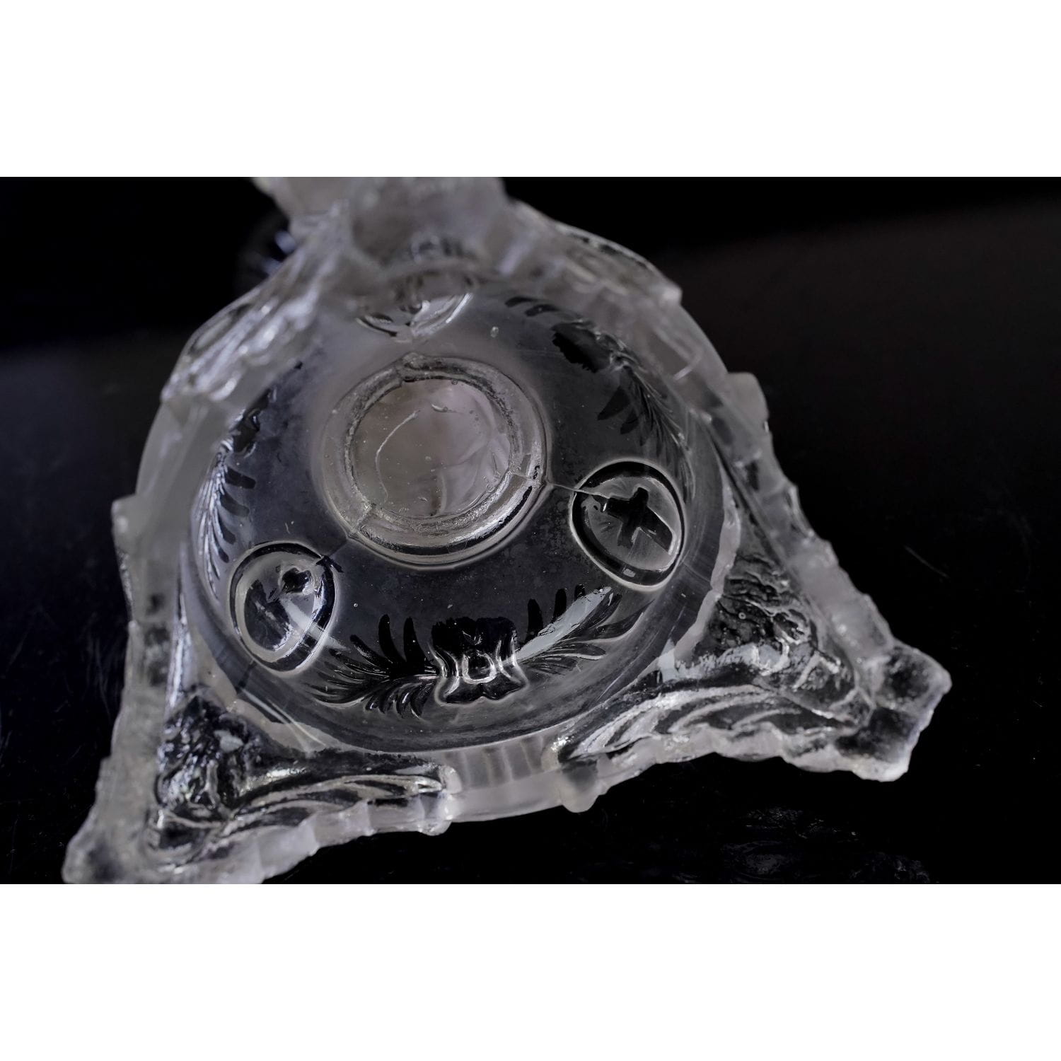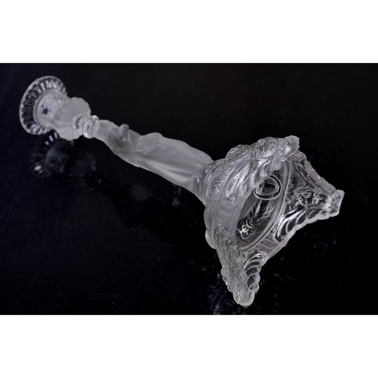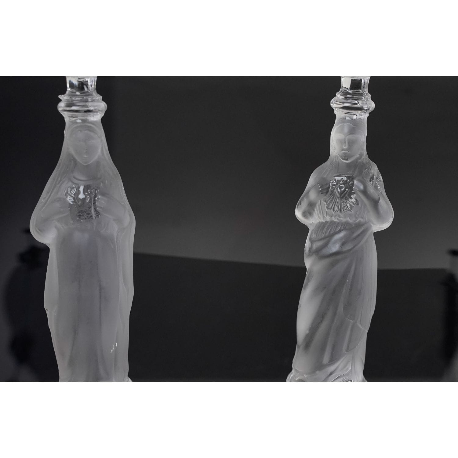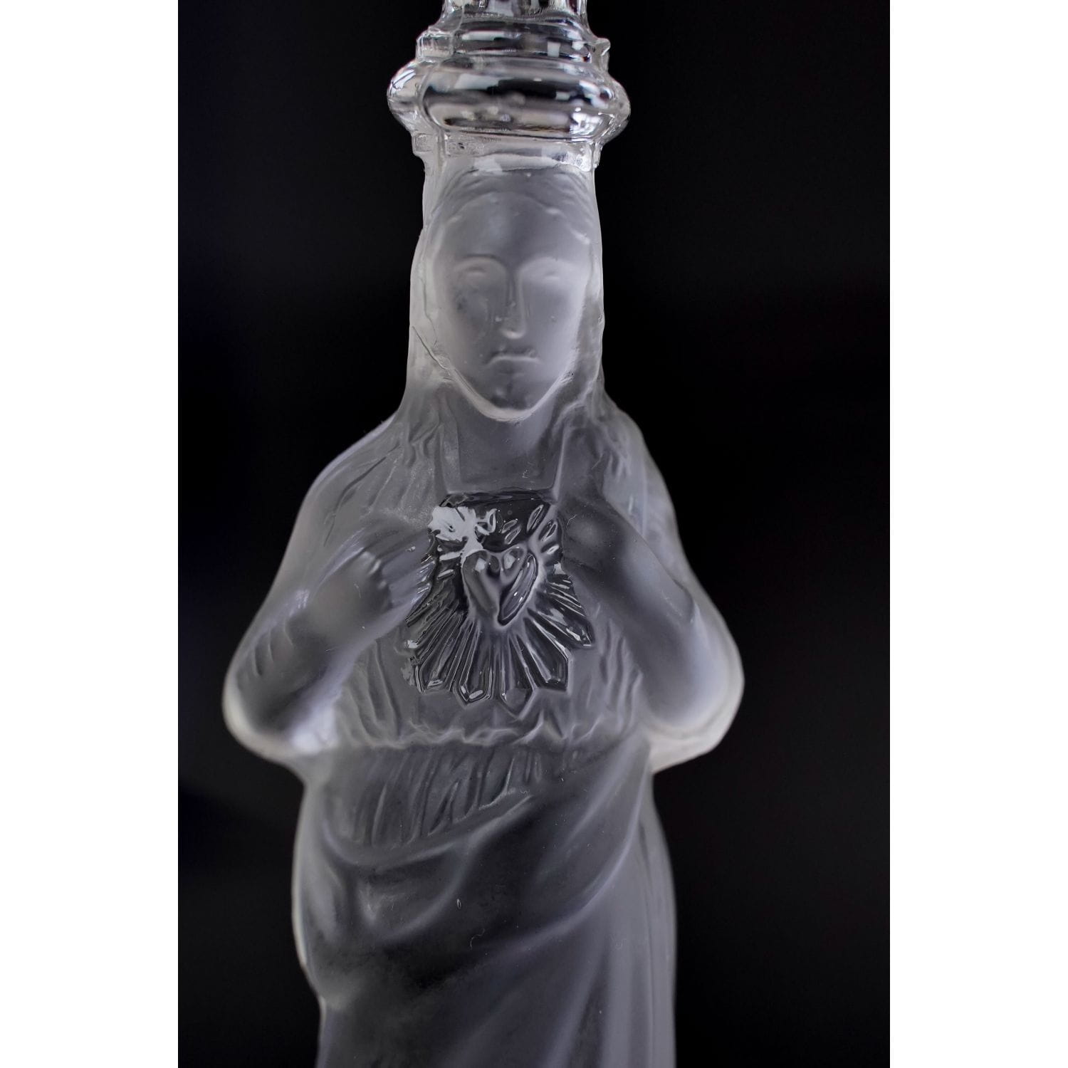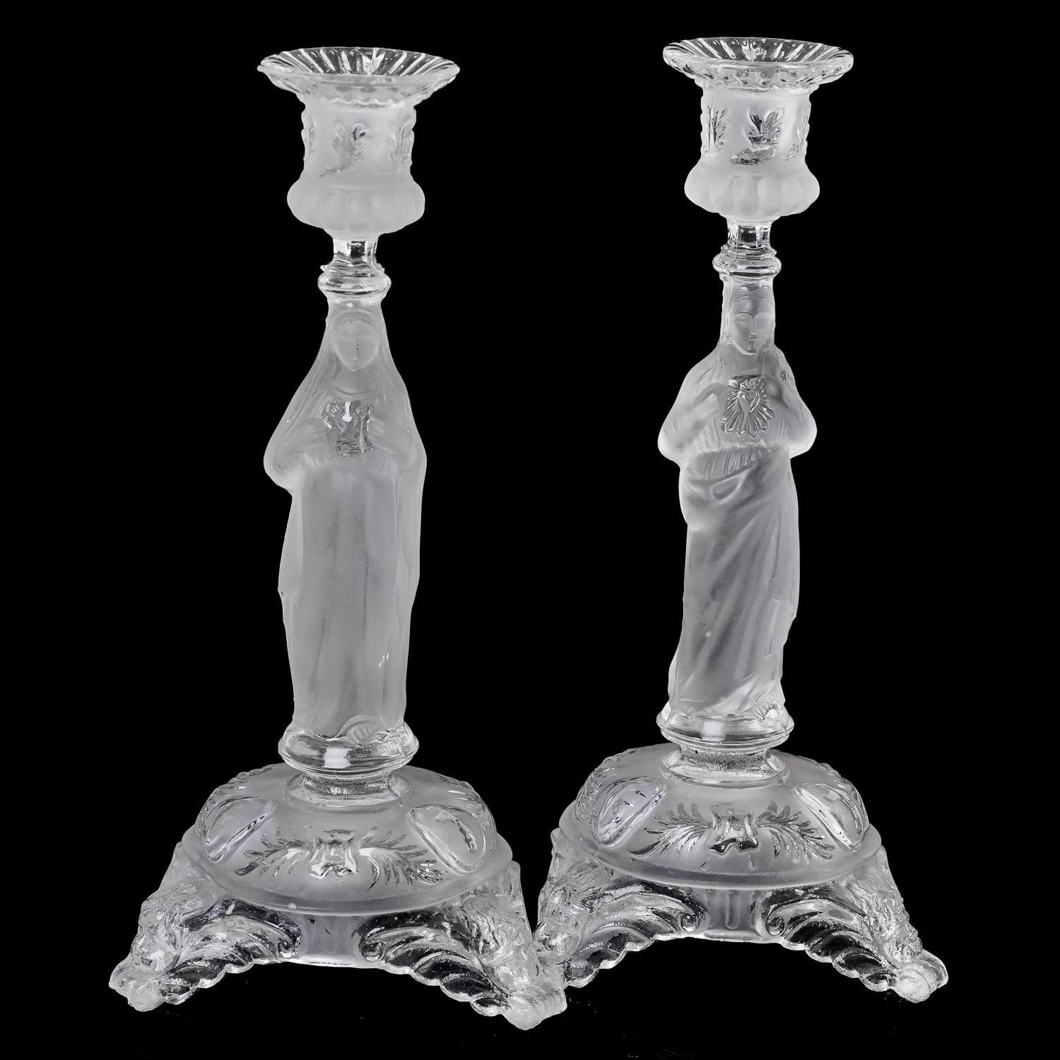 Jezus z Gorejącym Sercem. Pochodzi z Belgii z Val Saint Lambert z 1913 roku. Szkło prasowane, bezbarwne. Postać są z matowego szkła. Zachowany w stylu secesyjnym. Bogato zdobiony tłoczeniami o motywie kwiatowym. Nogi świecznika mają formę głów aniołków.