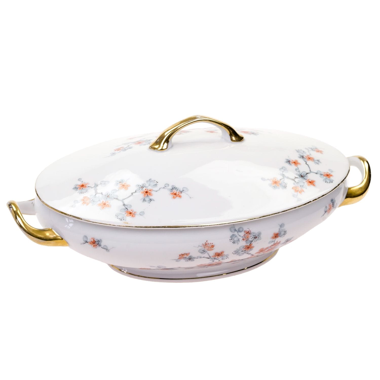 Pochodzi z Czech z Karlsbad (Karlovy Vary). Sygnowana znakiem stosowanym od 1918 roku. Porcelana w odcieniu bieli. Na naczyniu szare gałązki obsypane pomarańczowym kwieciem. Krawędzie w złoceniu. Uszy w pełni złocone.