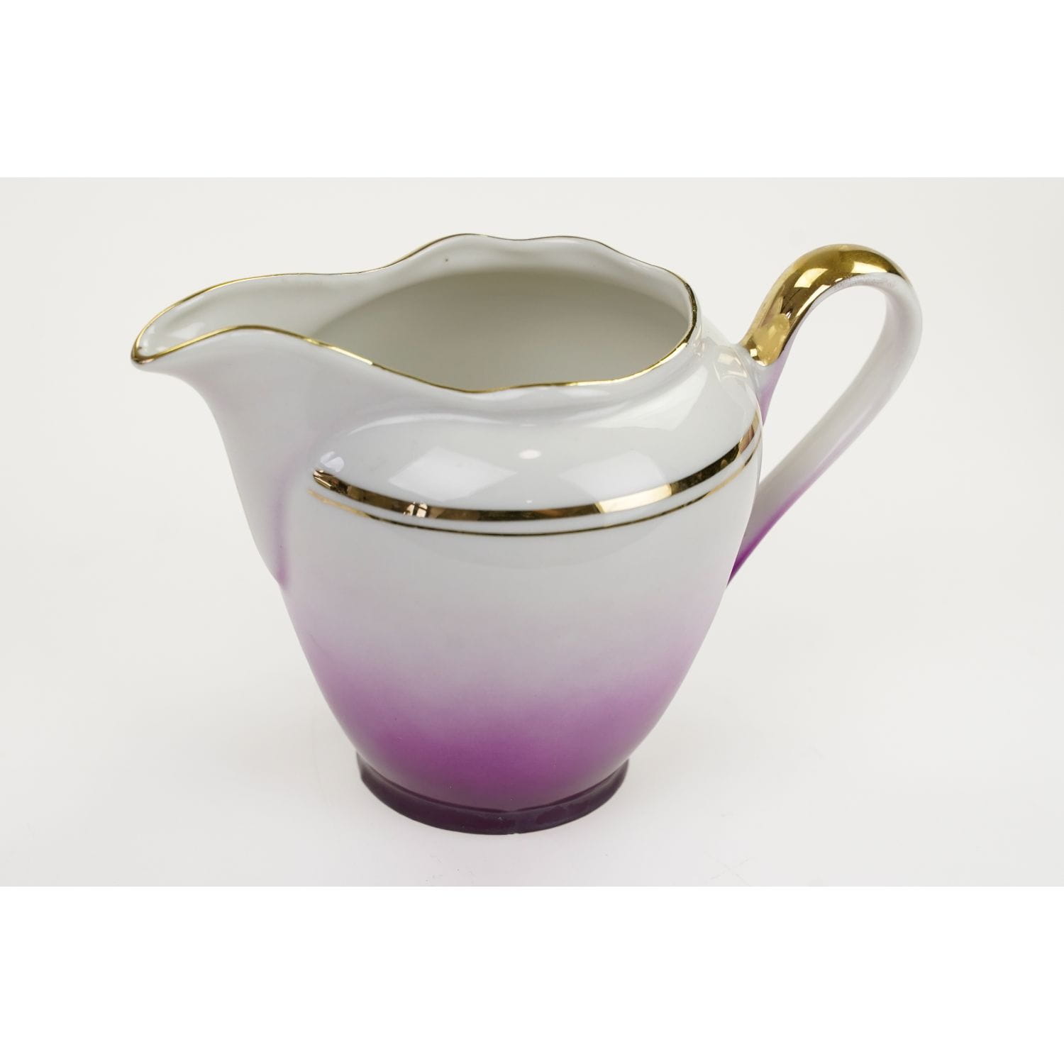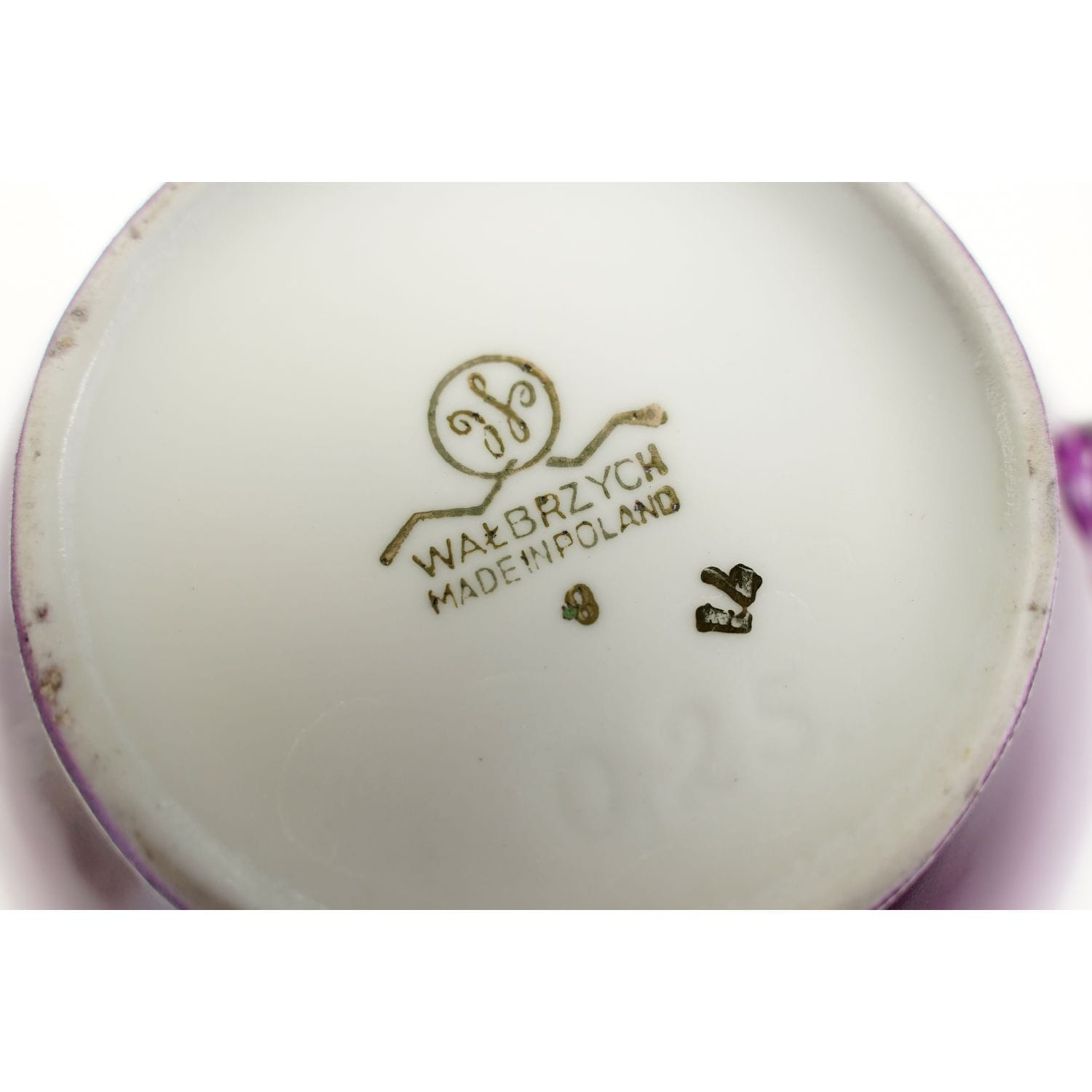 Wykonany w Wałbrzychu w latach 50/60-tych. Porcelana biała pokryta natryskowa fioletową, cieniowaną malaturą. Do tego przy krawędziach złote paseczki. Złocone są też ranty i grubo powleczone złotem uszka.