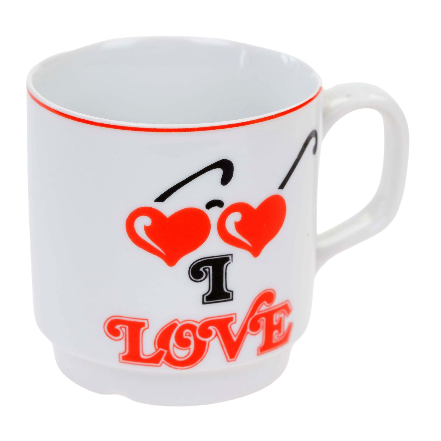 Solidna porcelana w odcieniu bieli ozdobiona drobnymi czerwonymi serduszkami i napisem "I Love". Dekoracja z obu stron. Górna krawędź w czerwonej obwódce.