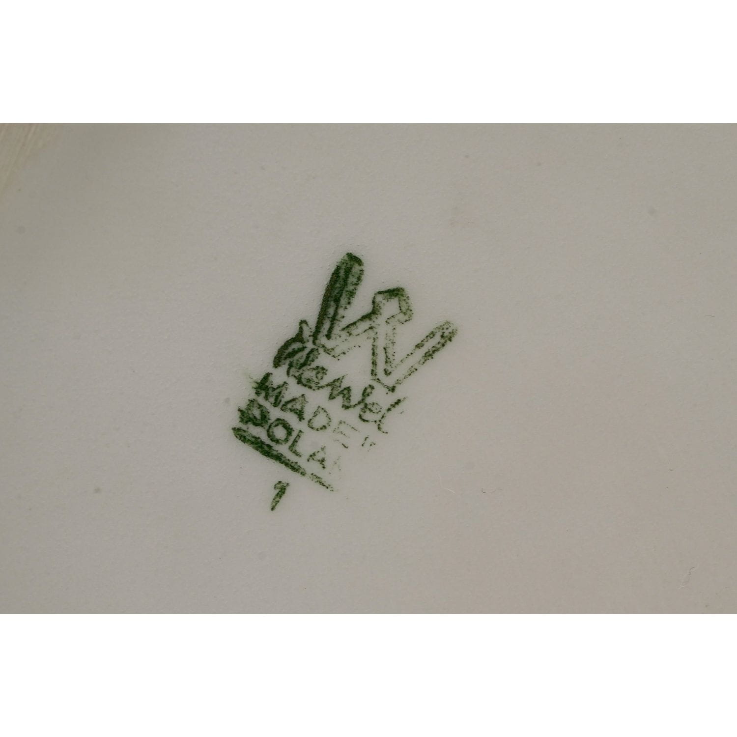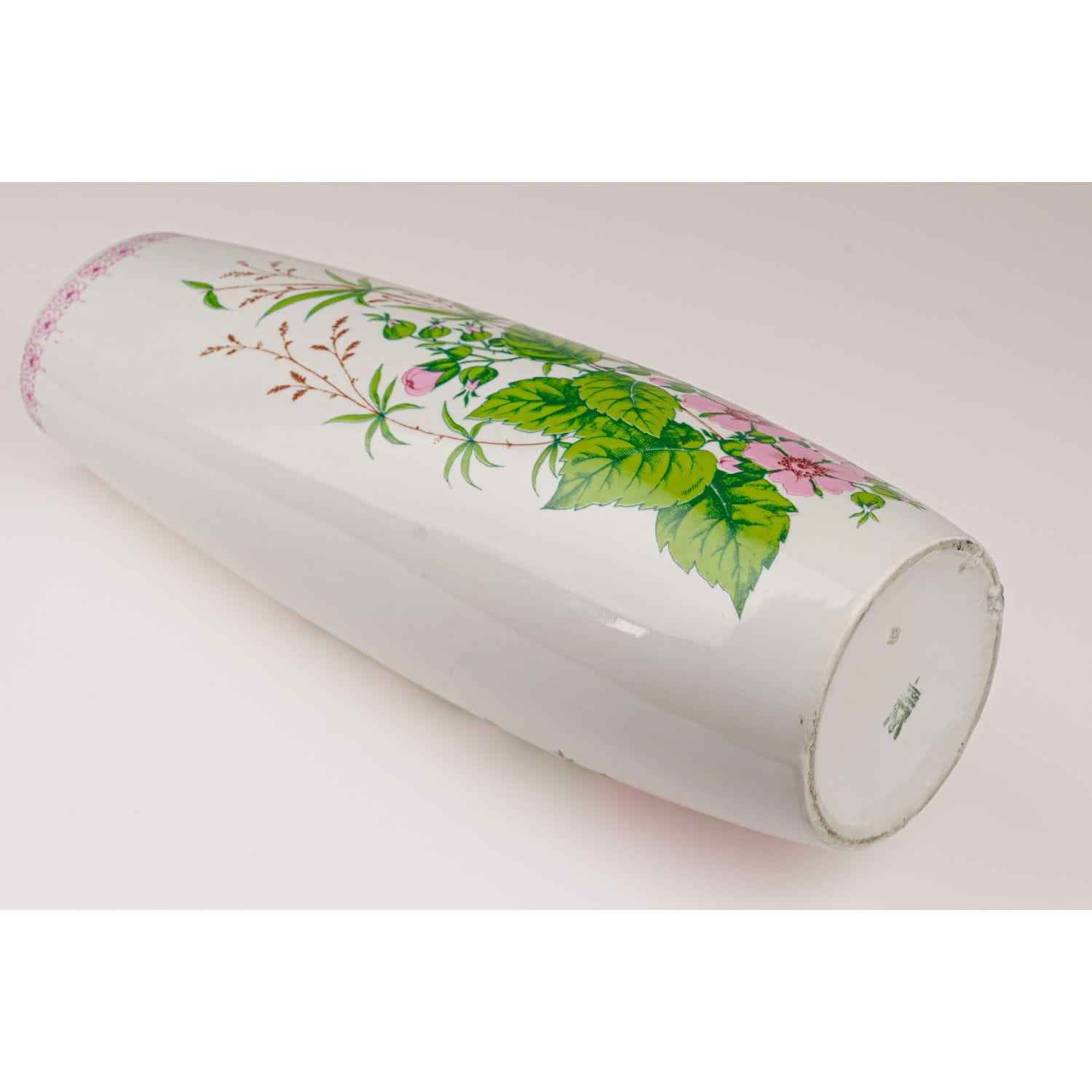Pochodzi z Wałbrzycha z Fabryki Porcelany Krzysztof. Wykonany z porcelany w odcieniu bieli. Pokryty kalkomanią przedstawiającą zielone liście i różowe kwiatuszki zebrane w wiechy, kiście. Dekoracja z obu stron. Przy górnej krawędzi dekoracyjny szlaczek różowych ornamentów. Dość prosta forma.