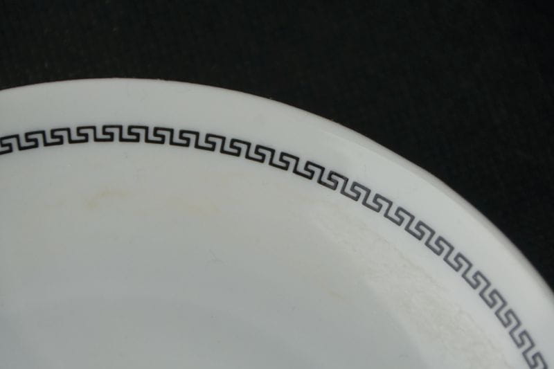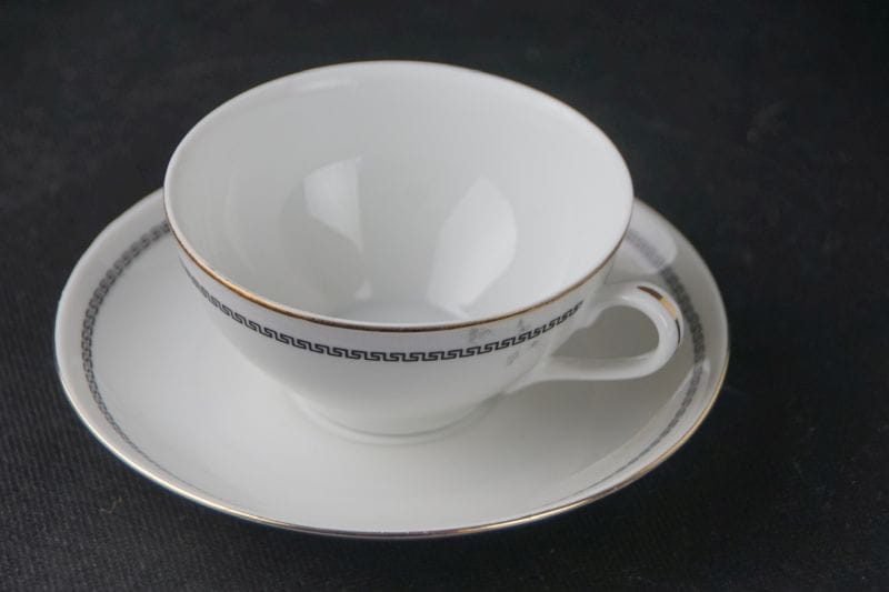 Pochodzi z Wałbrzycha z Fabryka Porcelany Krzysztof . Z lat 60/70-tych XX wieku. Z serwisu Julita, wykonanego według projektu Edwarda Ruszczyńskiego z 1957 roku. Porcelana w odcieniu bieli z delikatną dekoracją w postaci wąskiego szlaczka czarnych meandrów na obu elementach. Kontury subtelnie złocone.