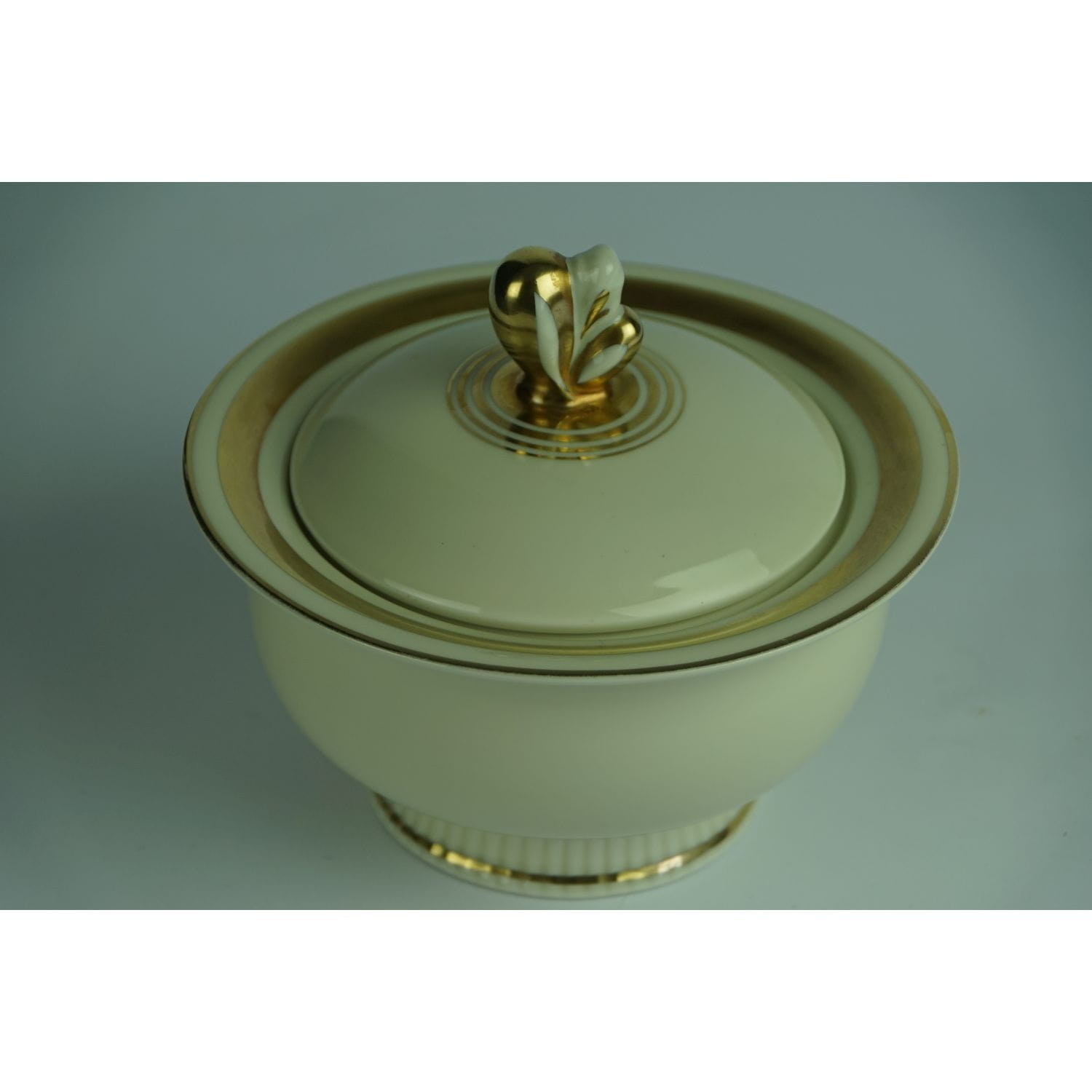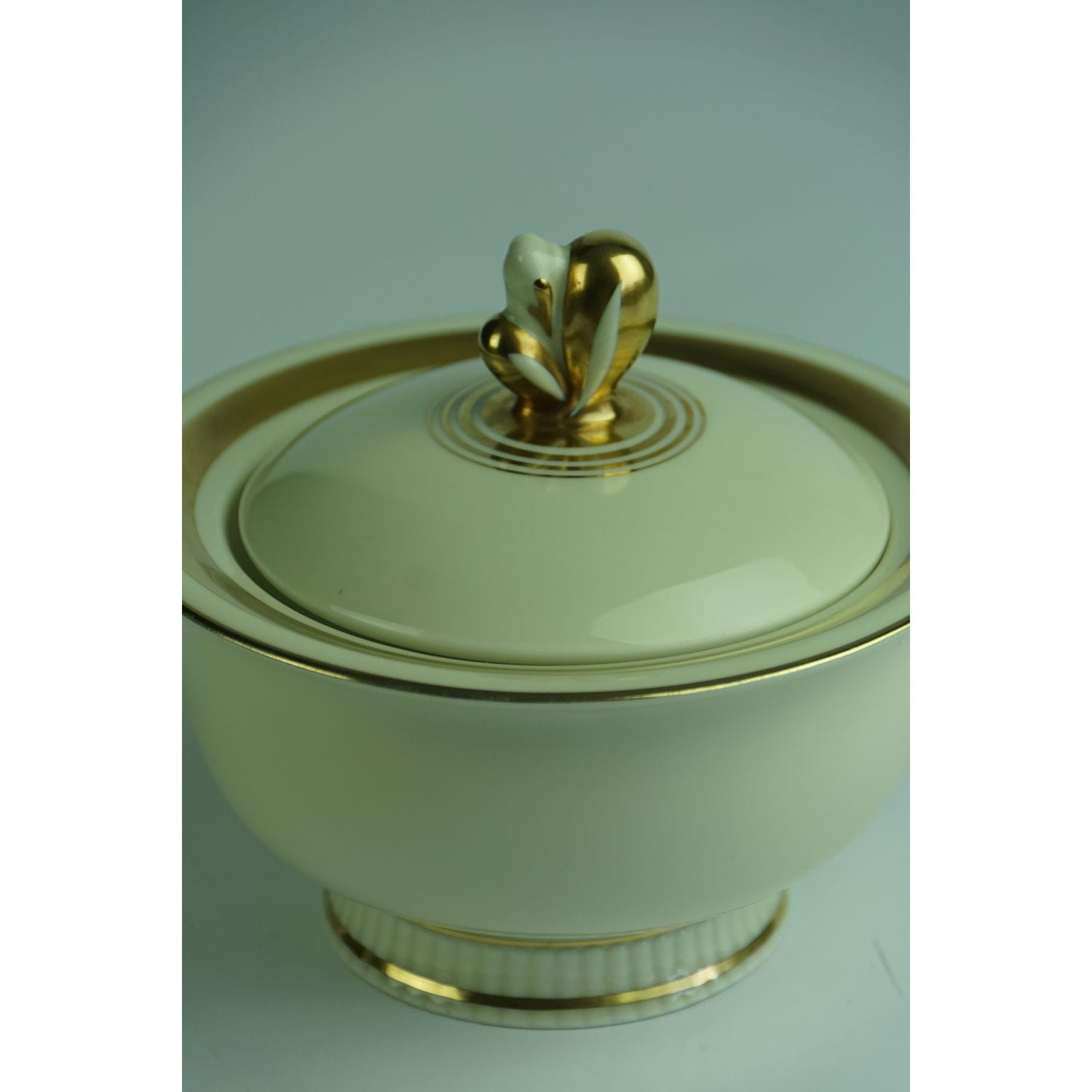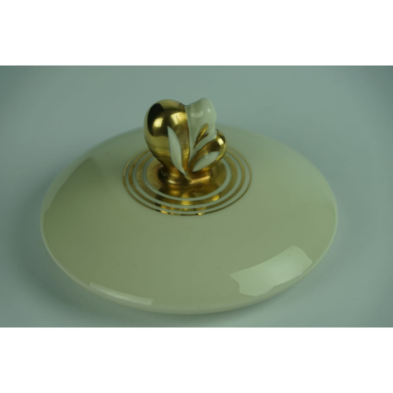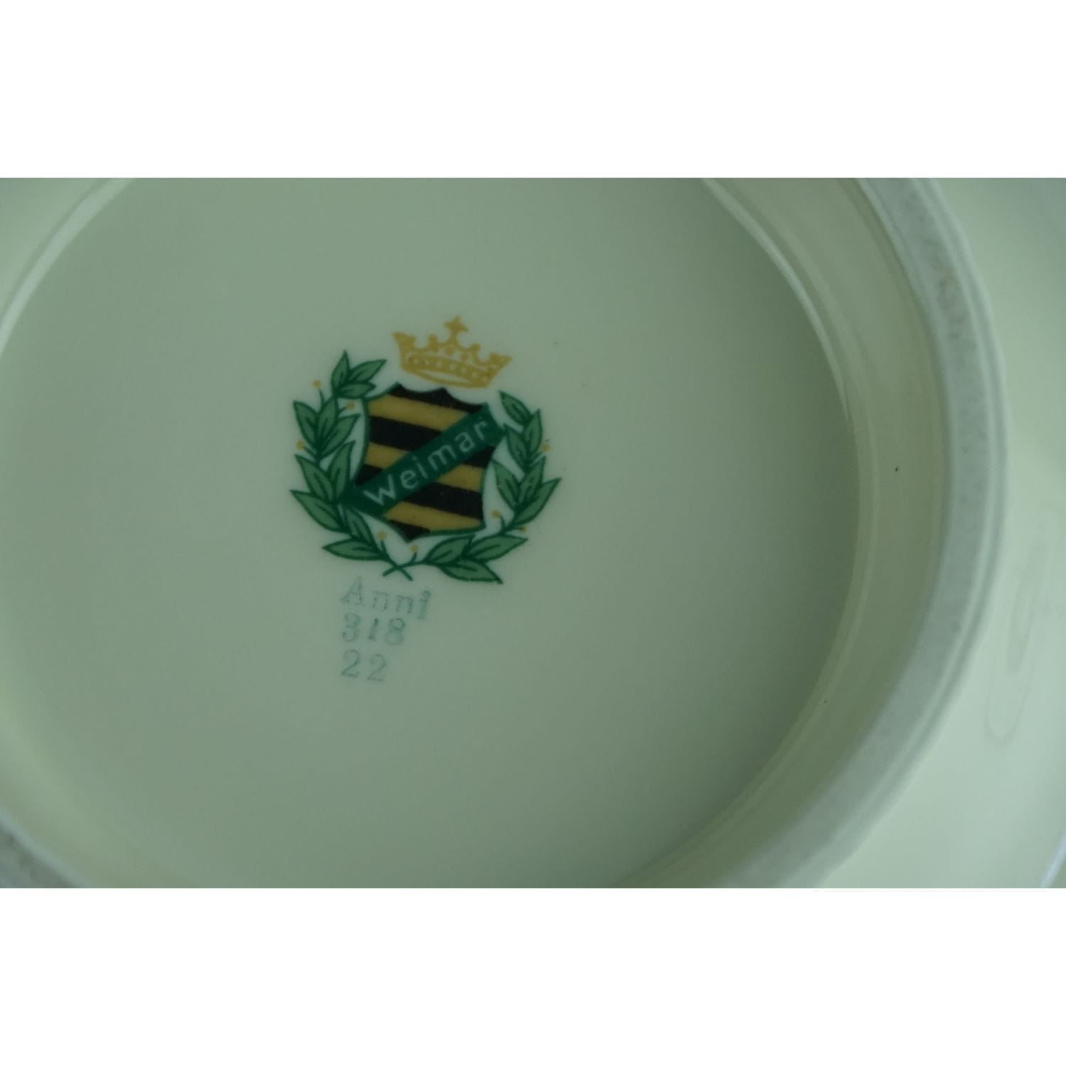 Pochodzi z Blankenhaim z wytwórni Streithardt & Kästner. Sygnowana znakiem stosowanym od 1924 do 1945 roku. Fason Anni. Porcelana w kolorze kości słoniowej, o ciekawym kształcie. Z kanelowaniami u podstawy i sterczynką w kształcie kwiatowego pąku. Udekorowana grubym złoceniem.