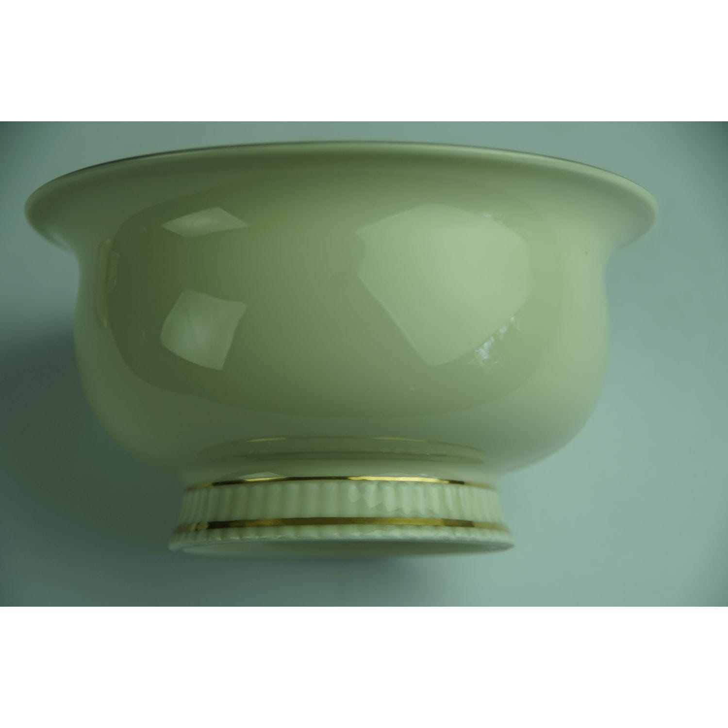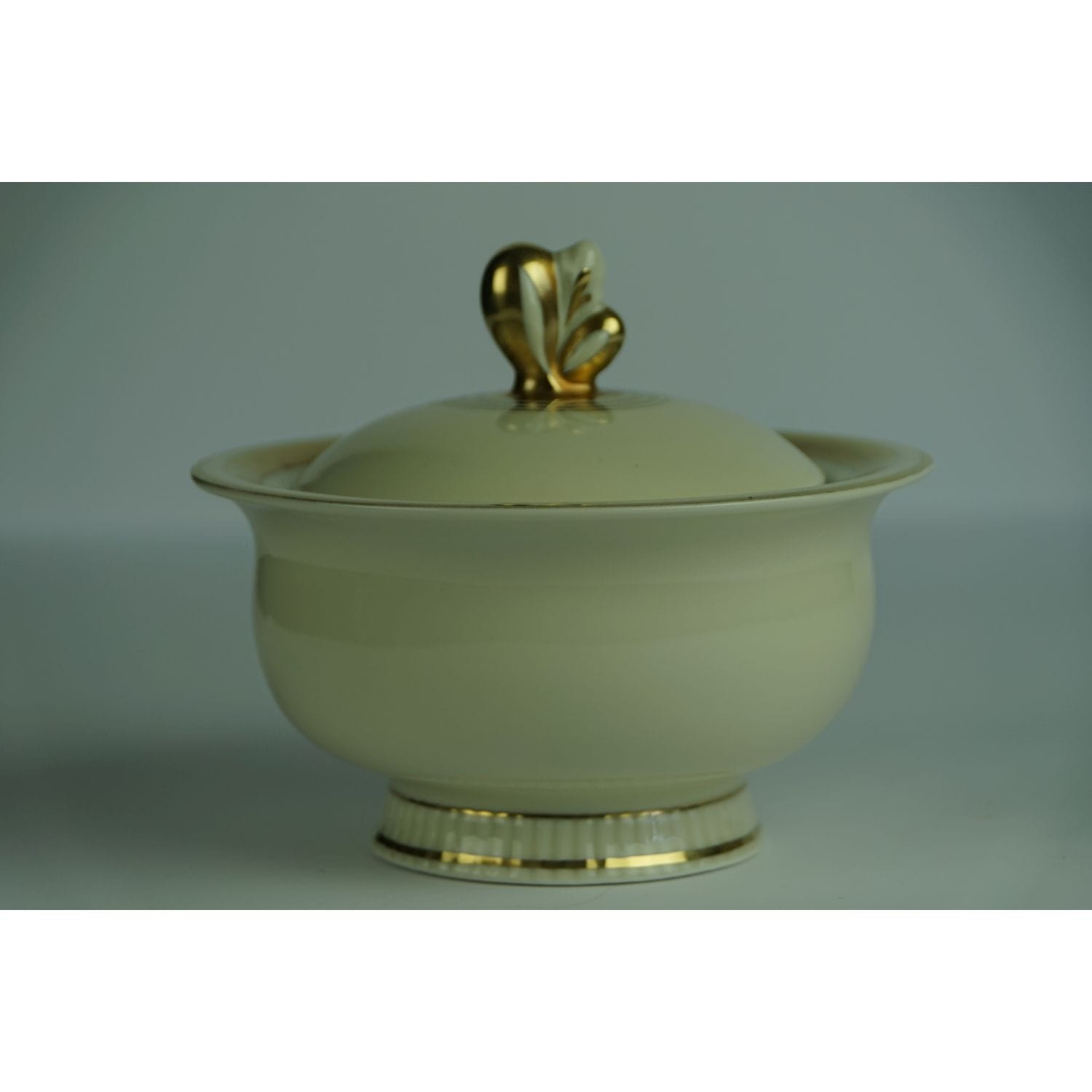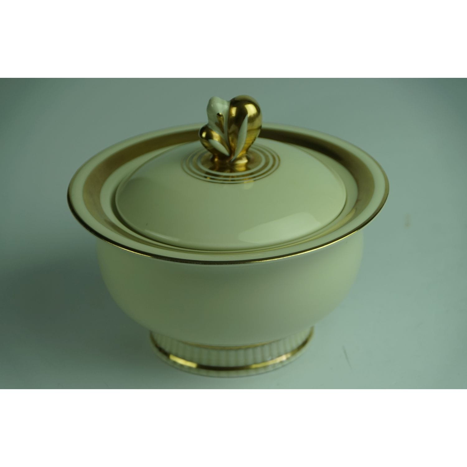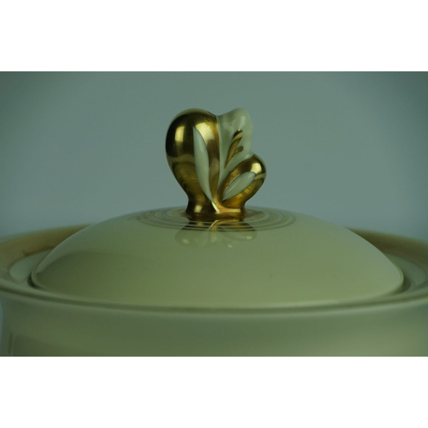 Pochodzi z Blankenhaim z wytwórni Streithardt & Kästner. Sygnowana znakiem stosowanym od 1924 do 1945 roku. Fason Anni. Porcelana w kolorze kości słoniowej, o ciekawym kształcie. Z kanelowaniami u podstawy i sterczynką w kształcie kwiatowego pąku. Udekorowana grubym złoceniem.