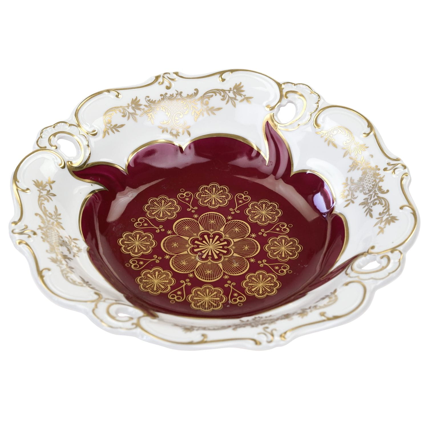Piękna misa, głębsza patera z ażurami z bordowym lustrem.