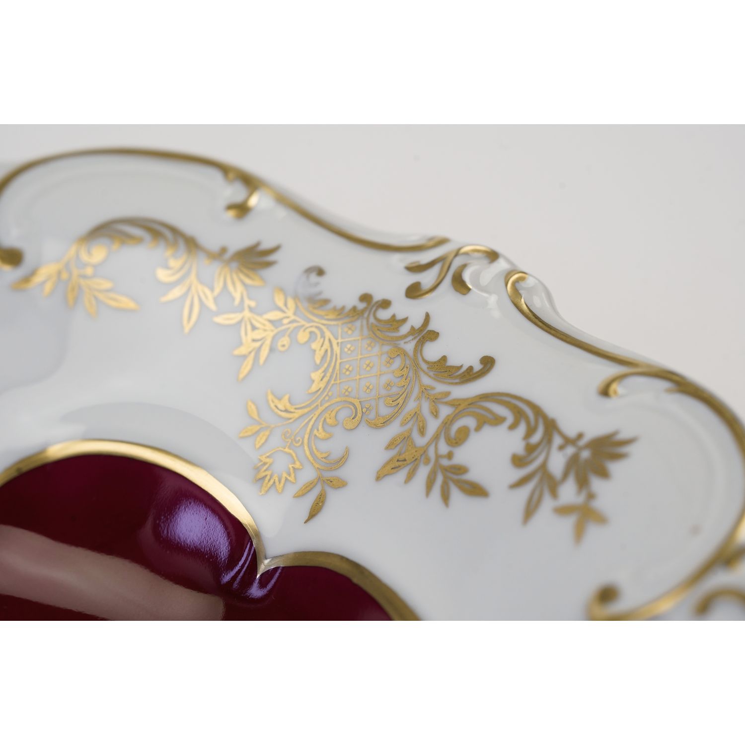 Porcelana w odcieniu bieli, szkliwiona z uroczymi reliefami i muszelkowatymi ażurami na kołnierzu, który pokryty jest złotymi kwiatowymi, roślinnymi ornamentami. Lustro w bordowej malaturze. Na bordowym tle bardzo bogate złocenia ręcznie nakładane i drobne złote, kwiatowe ornamenty.