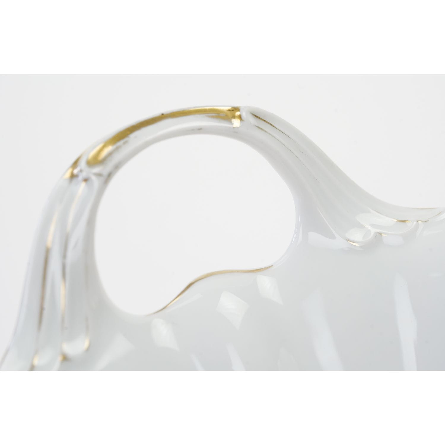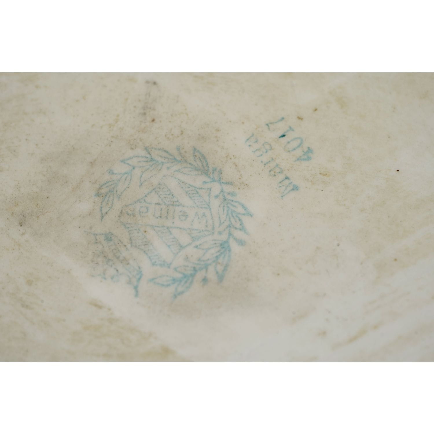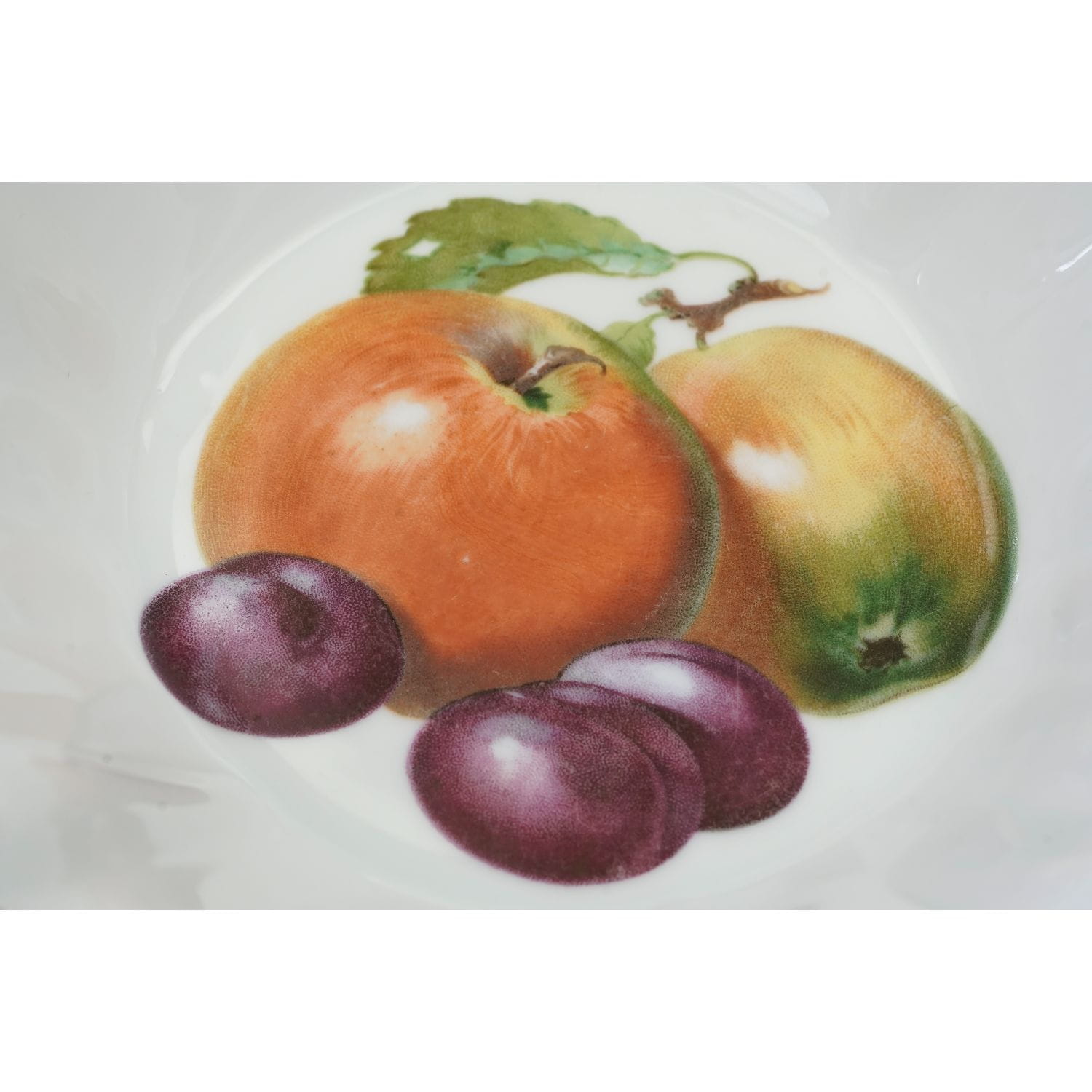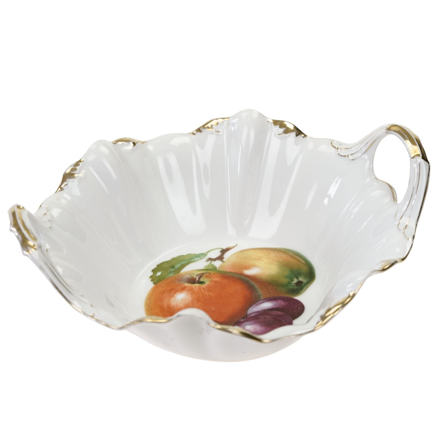 Pochodzi z Blankenhain, VEB Weimar Porzellan (C. & E. Carstens), sygnowana znakiem stosowanym od 1933 roku. Fason Marga. Porcelana w odcieniu bieli, szkliwiona z uroczymi reliefami. Uszy i krawędzie ręcznie podkreślone złoceniami Na lustrze uroczy, barwny, realistyczny bukiet smakowitych owoców: śliwki i jabłka.