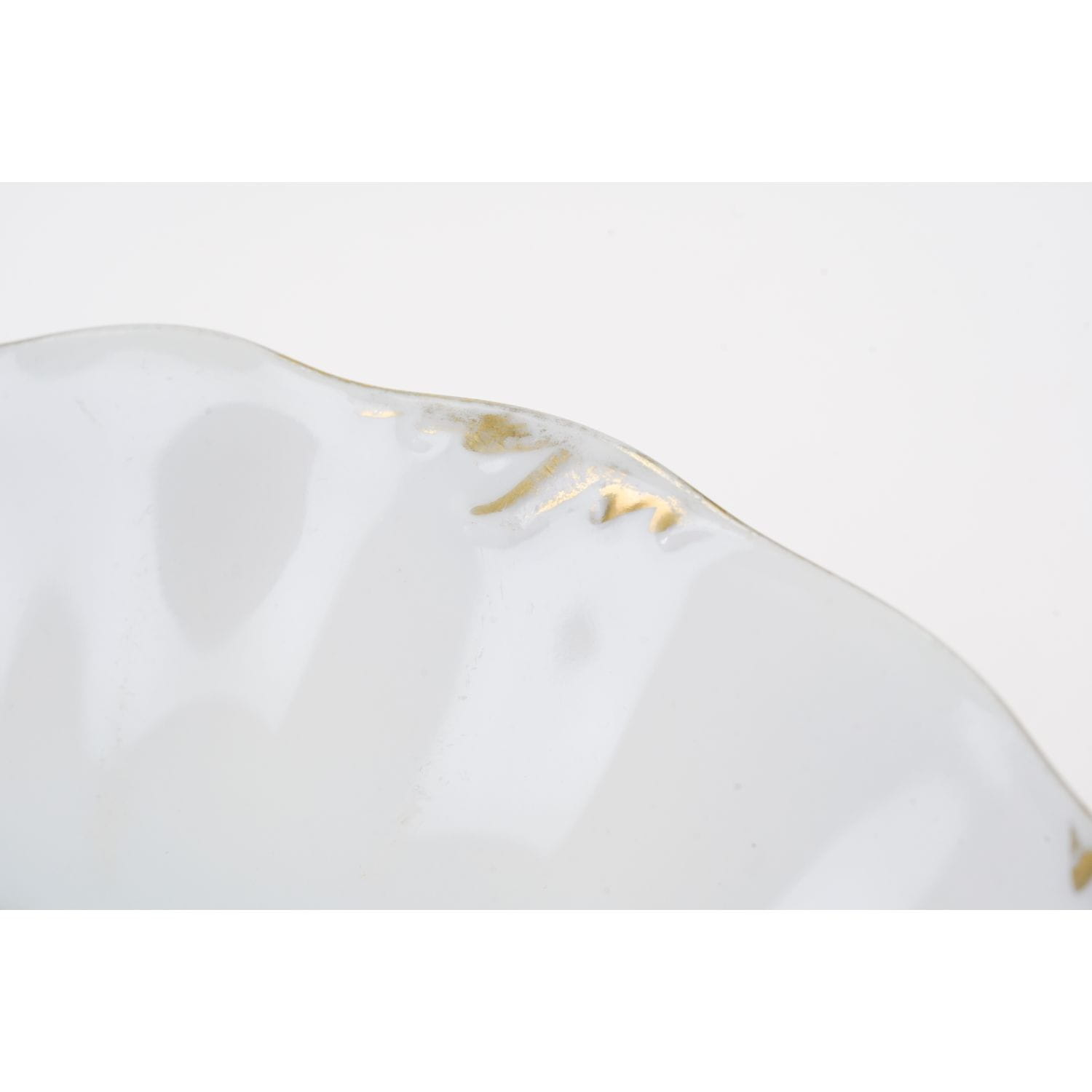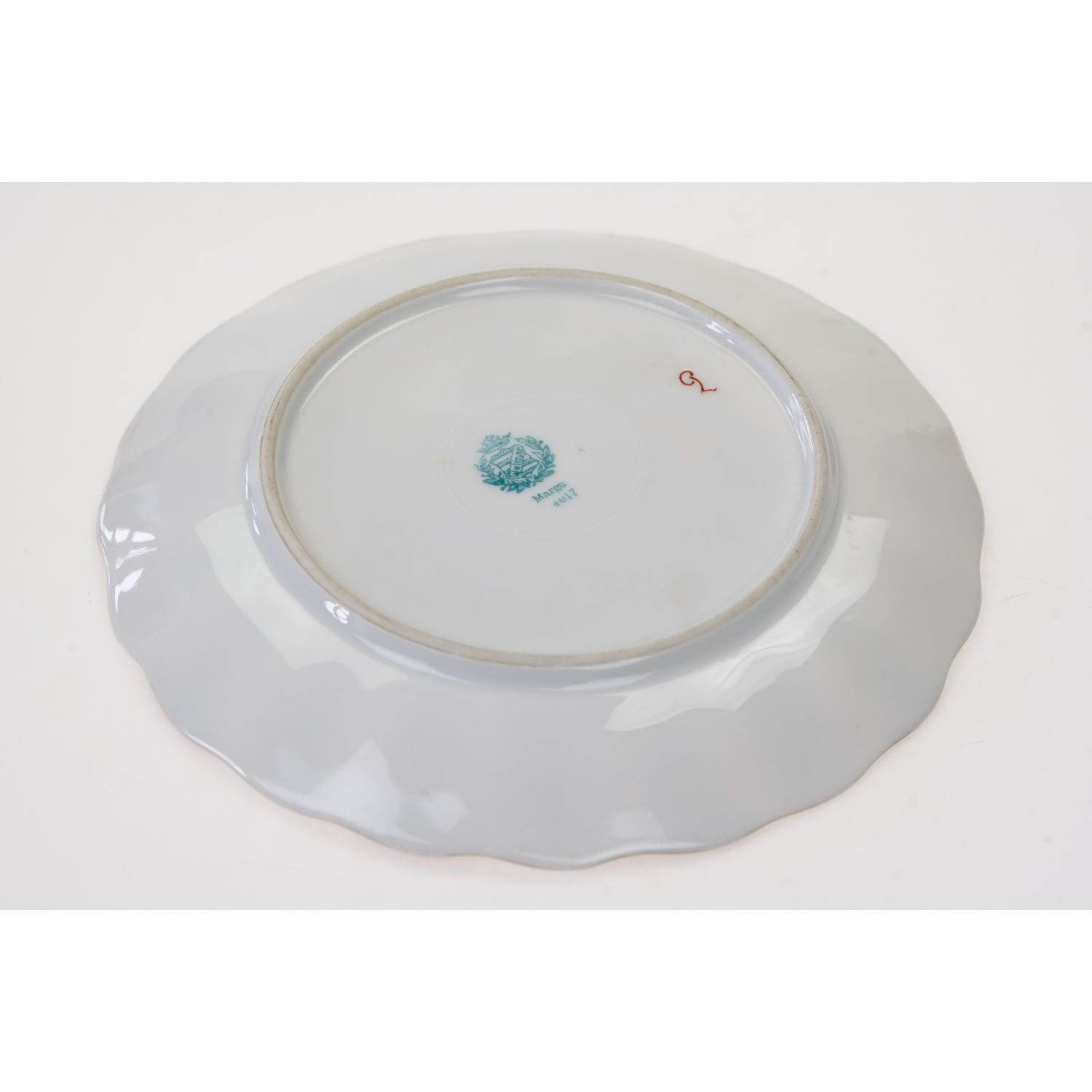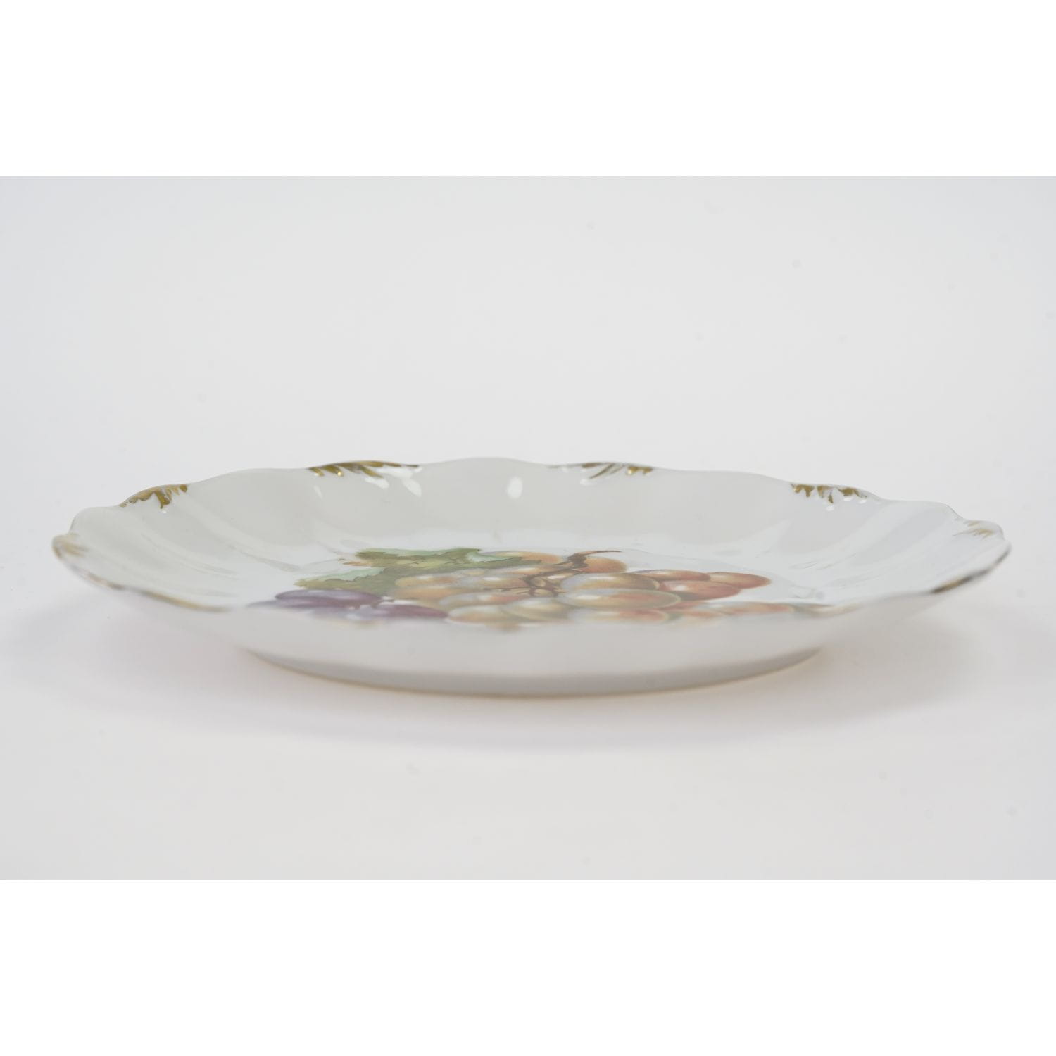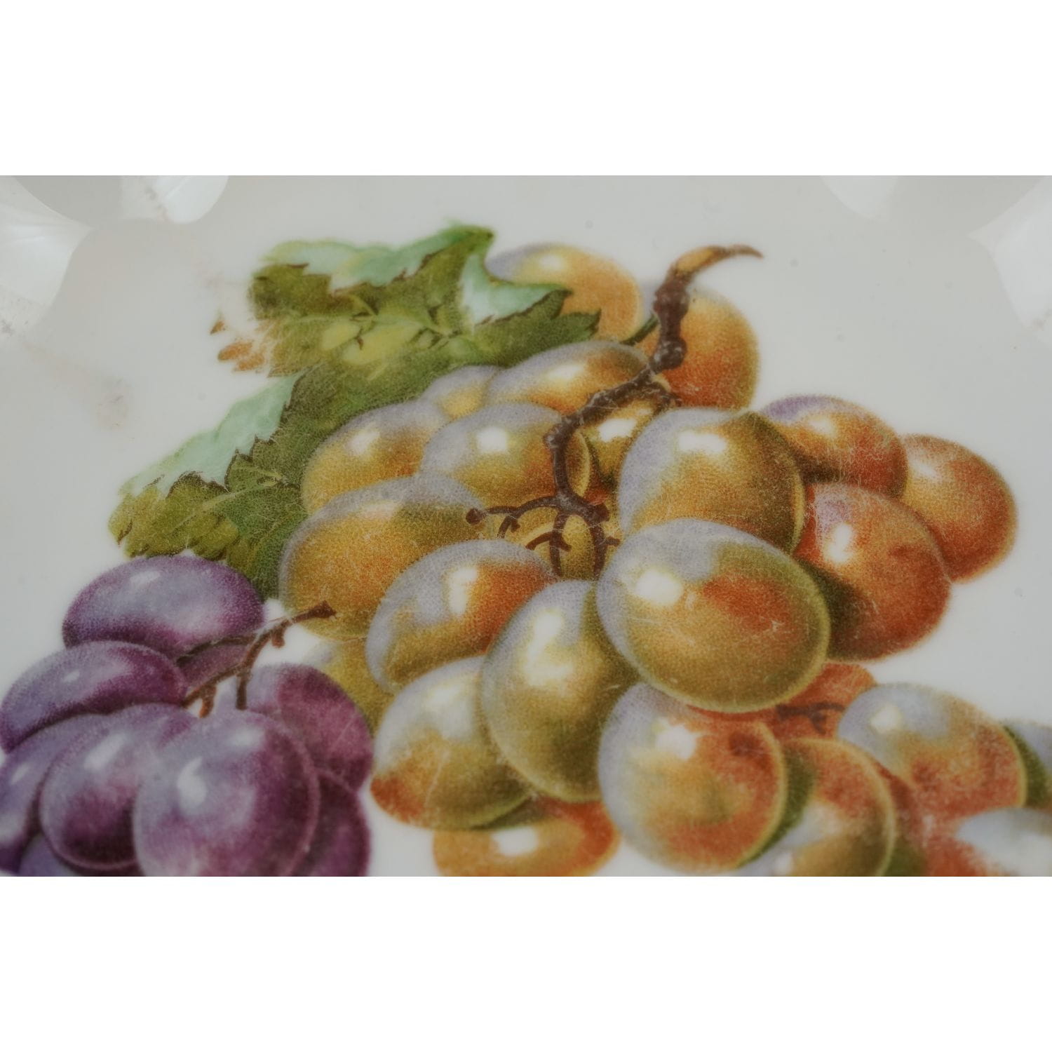 Pochodzi z Blankenhain, VEB Weimar Porzellan (C. & E. Carstens), sygnowana znakiem stosowanym od 1933 roku. Fason Marga. Porcelana w odcieniu bieli, szkliwiona z uroczymi reliefami. Krawędzie ręcznie podkreślone złoceniami Na lustrze uroczy, barwny, realistyczny bukiet smakowitych owoców: winogrona.